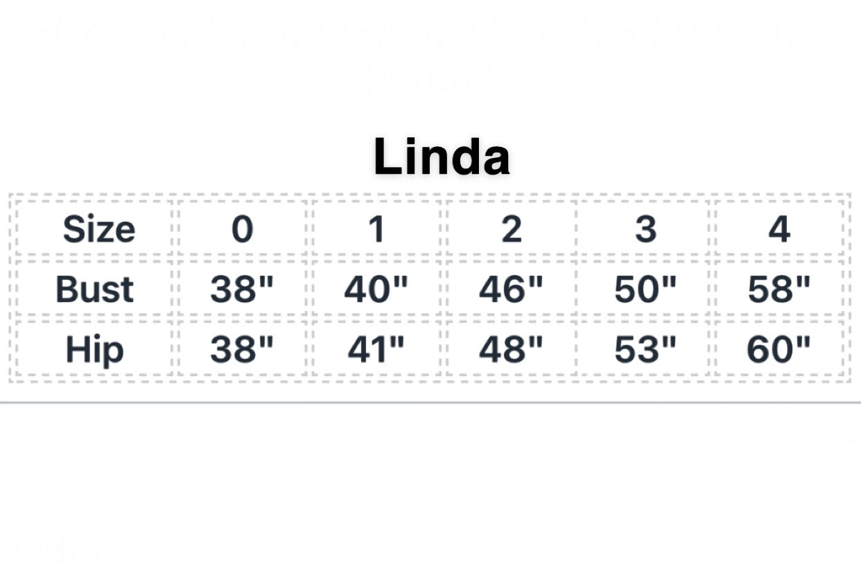 Sizes: 0 (XS/S), 1 (S/M), 2 (L/XL), 3 (2X/3X), 4 (4X/5X)