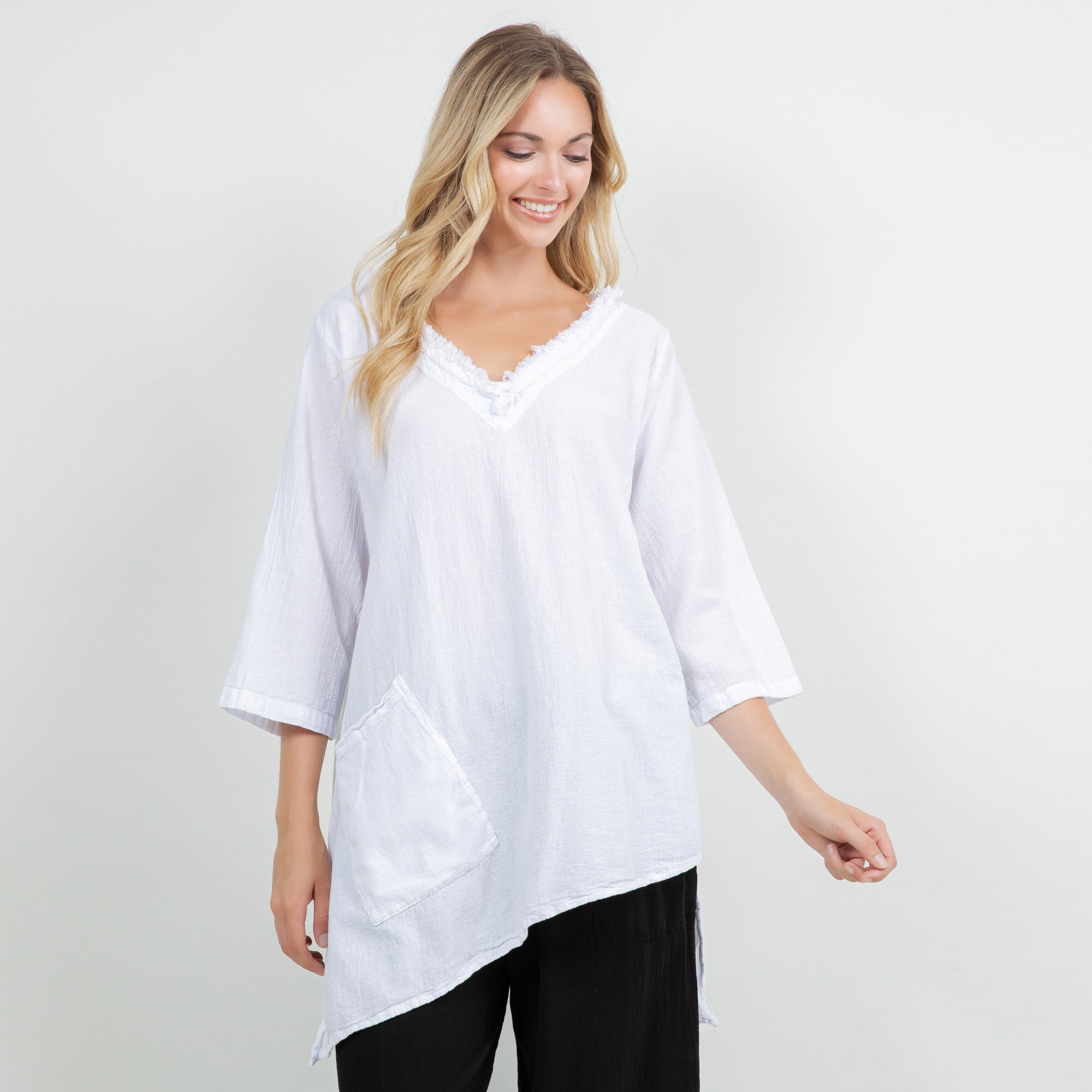 A flowy style, Zoe features a fringed v-neck, 3/4 sleeves, right side pocket, with an angled bottom in front & back.