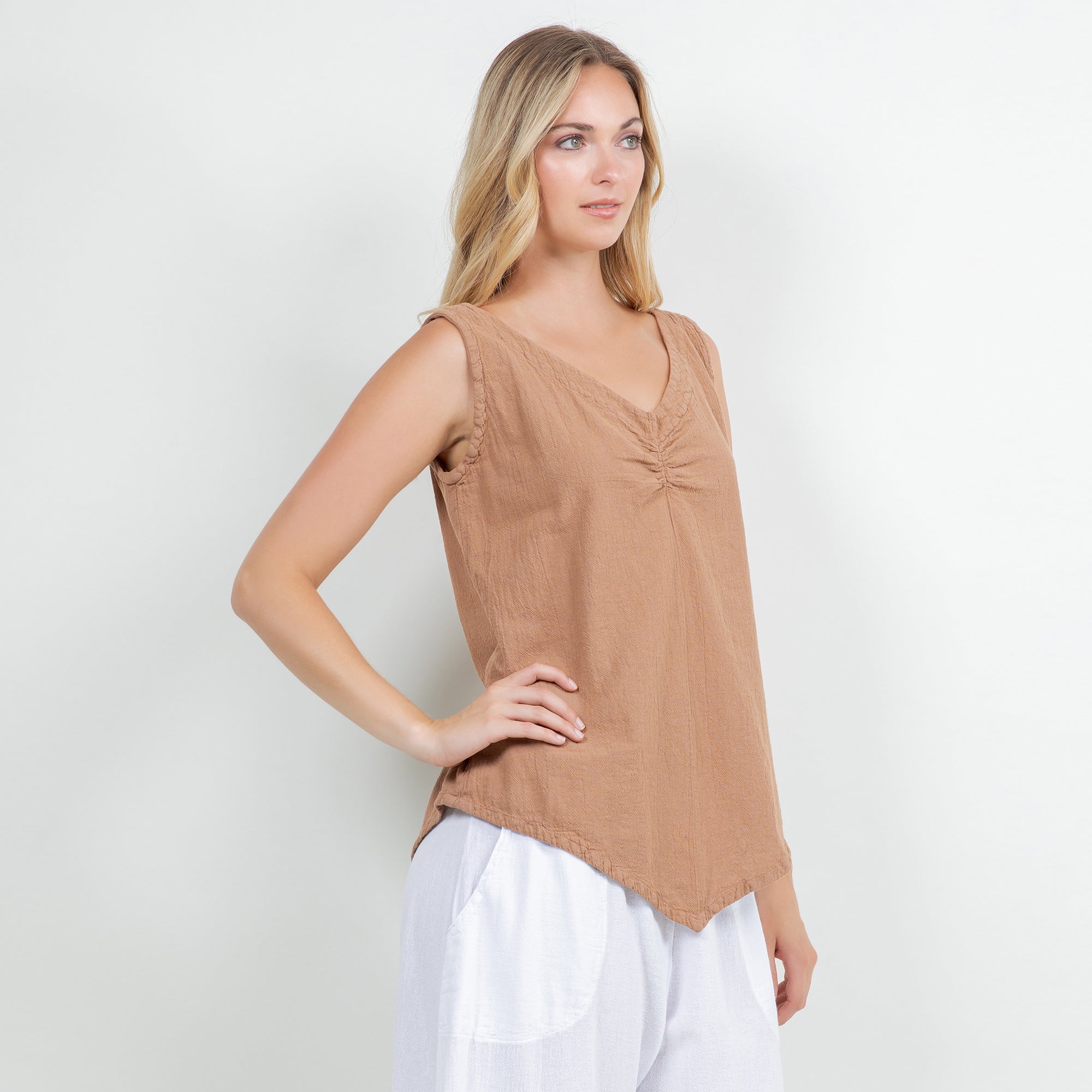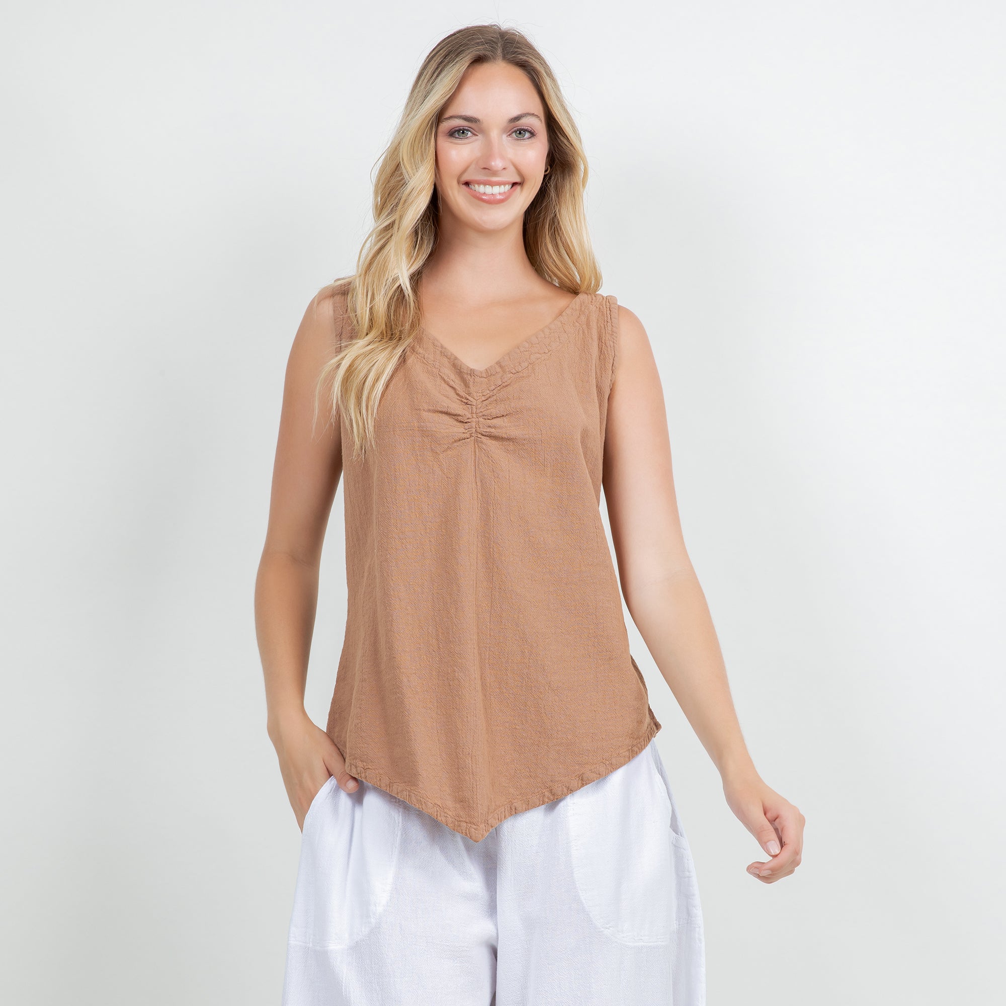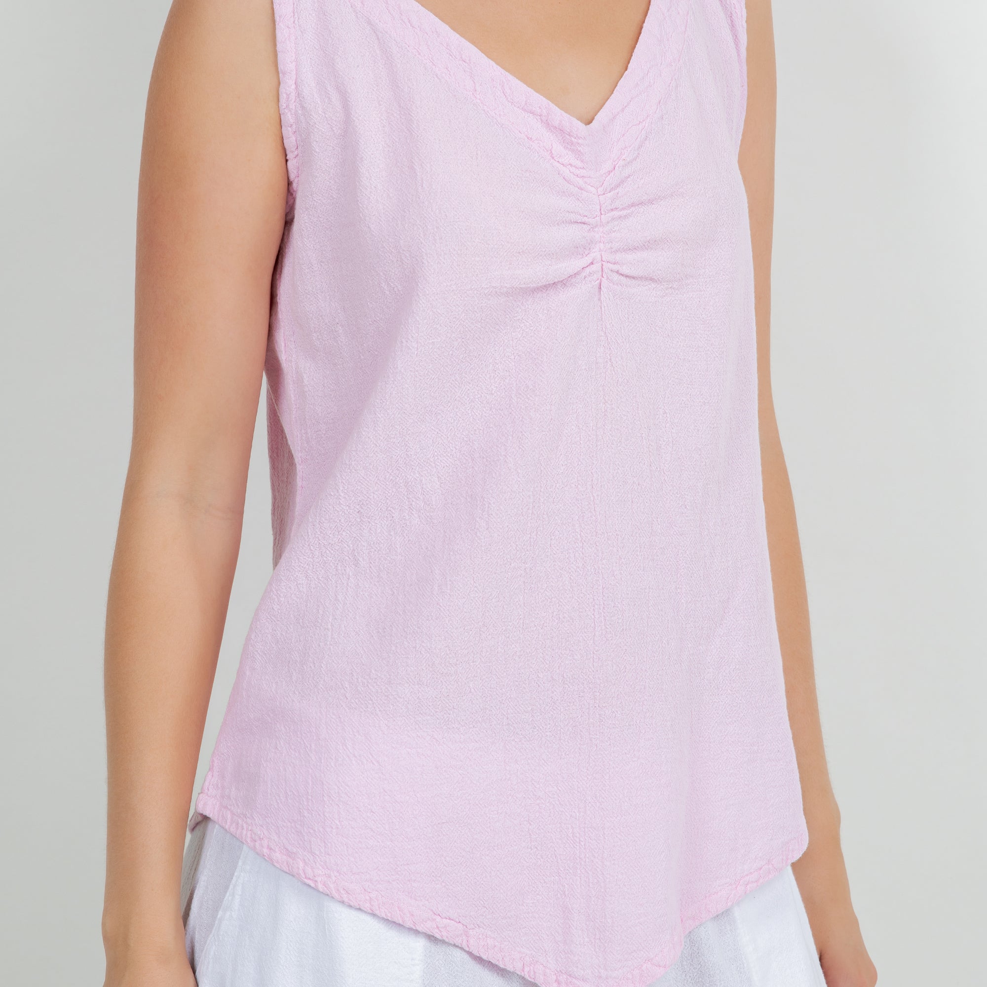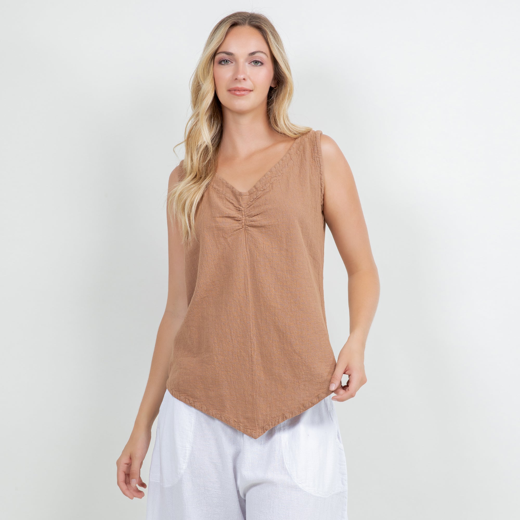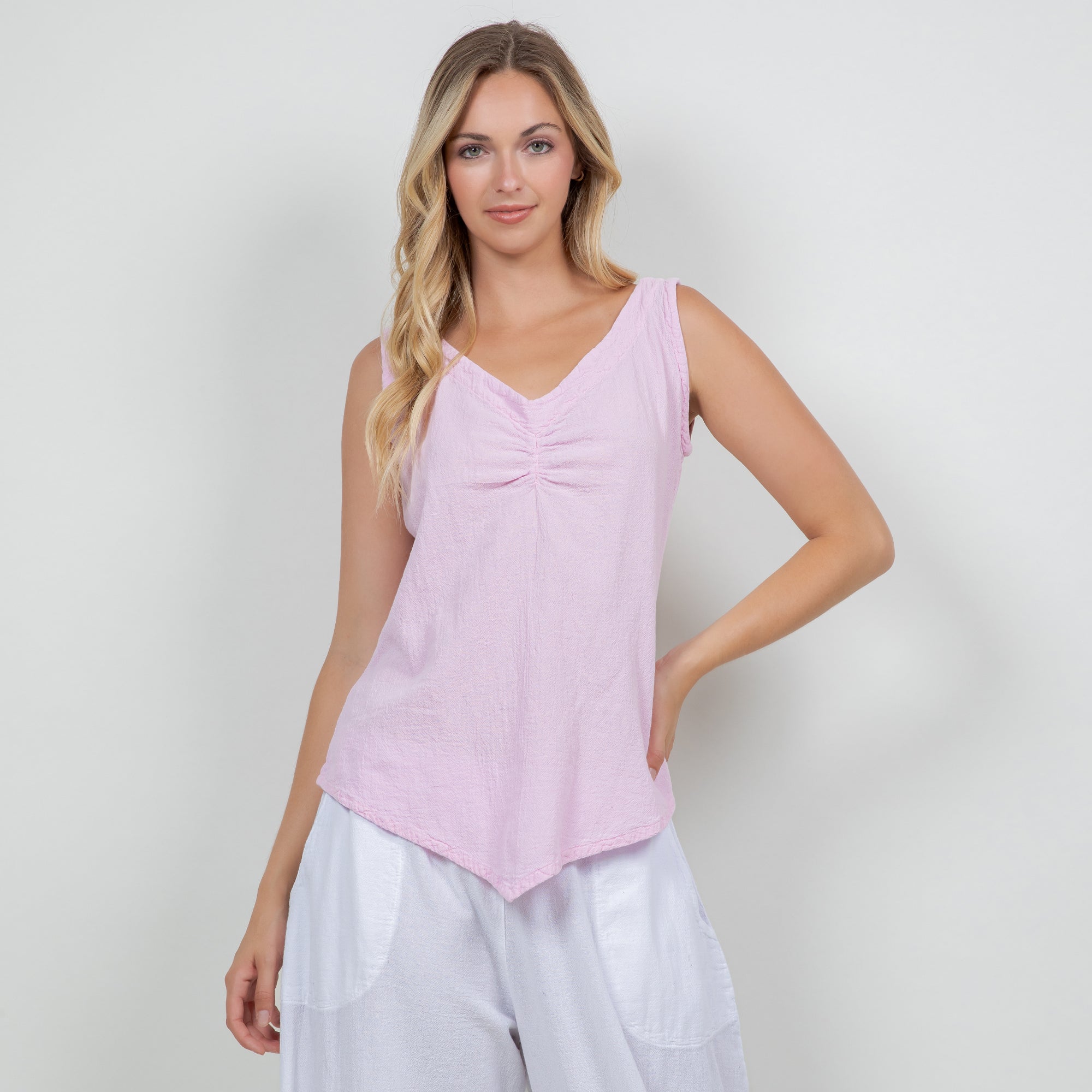 The Dominica Tank is a perfect staple piece to add to your wardrobe! Detailed with a V-neck and sinching at the top. This tank is very flattering on all body types with a v-pointed bottom. Perfect for layering!