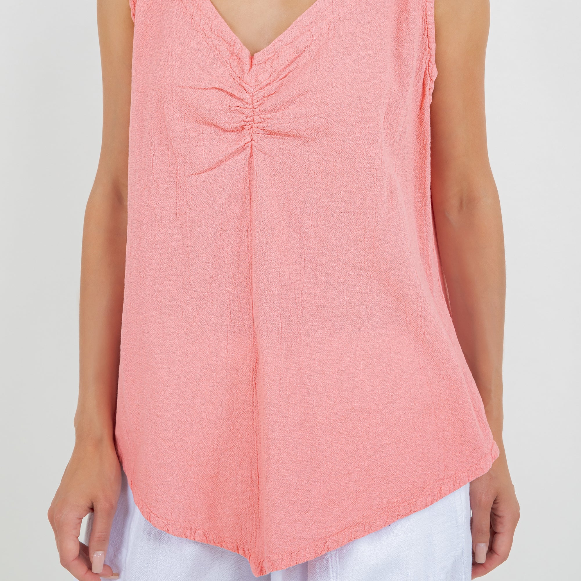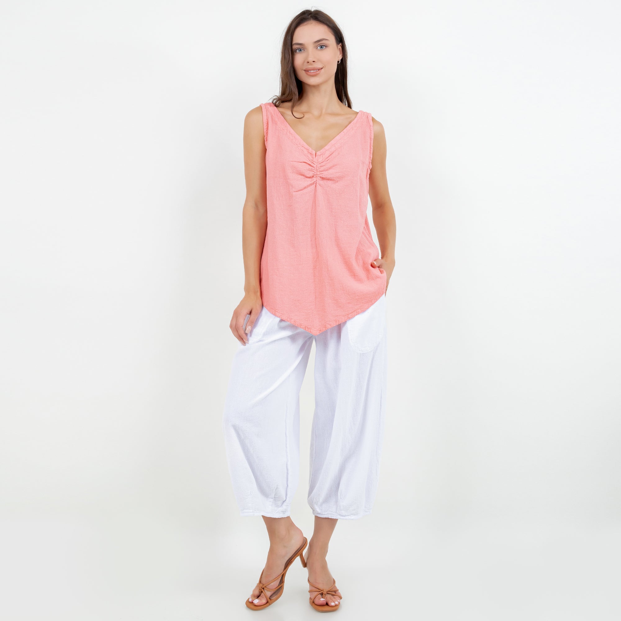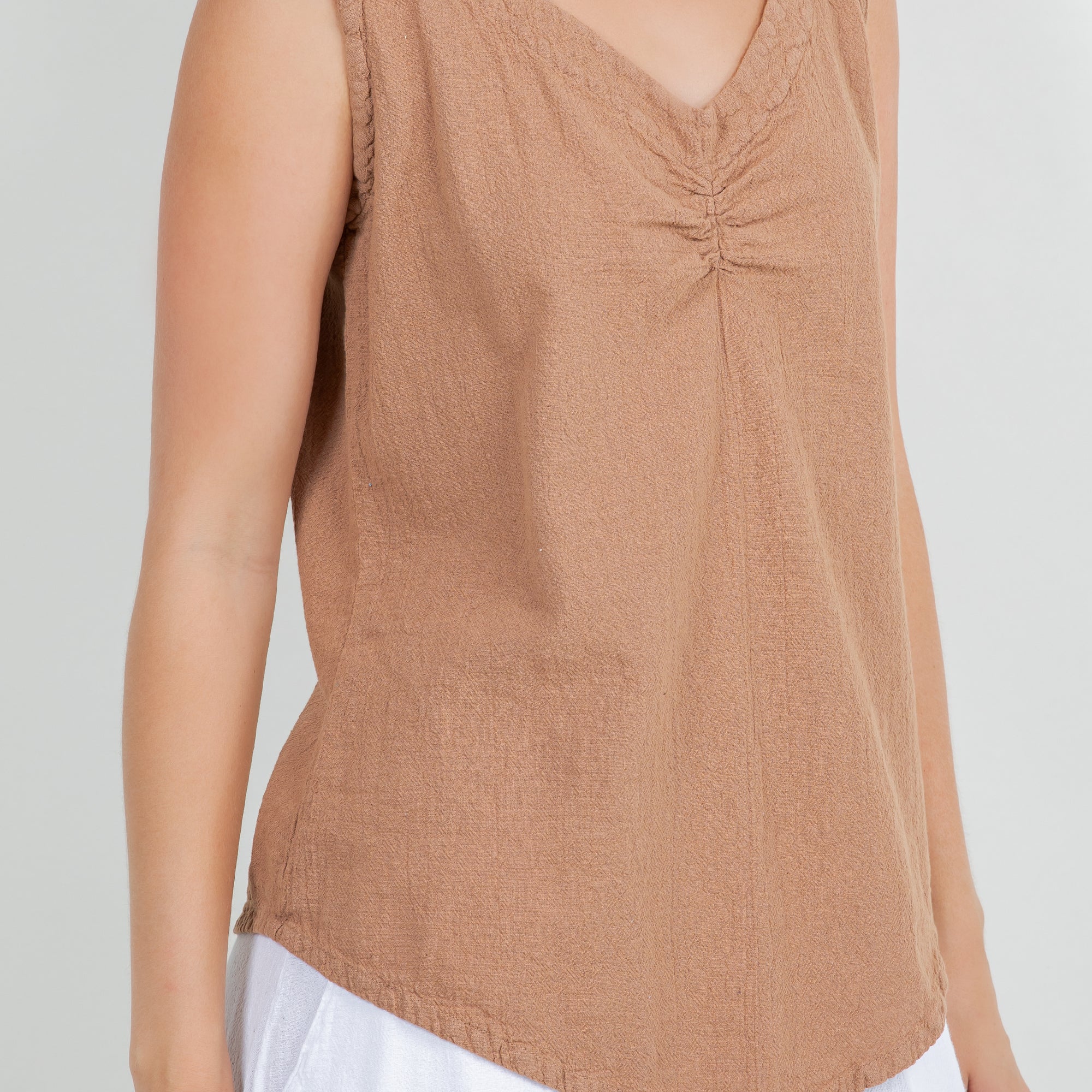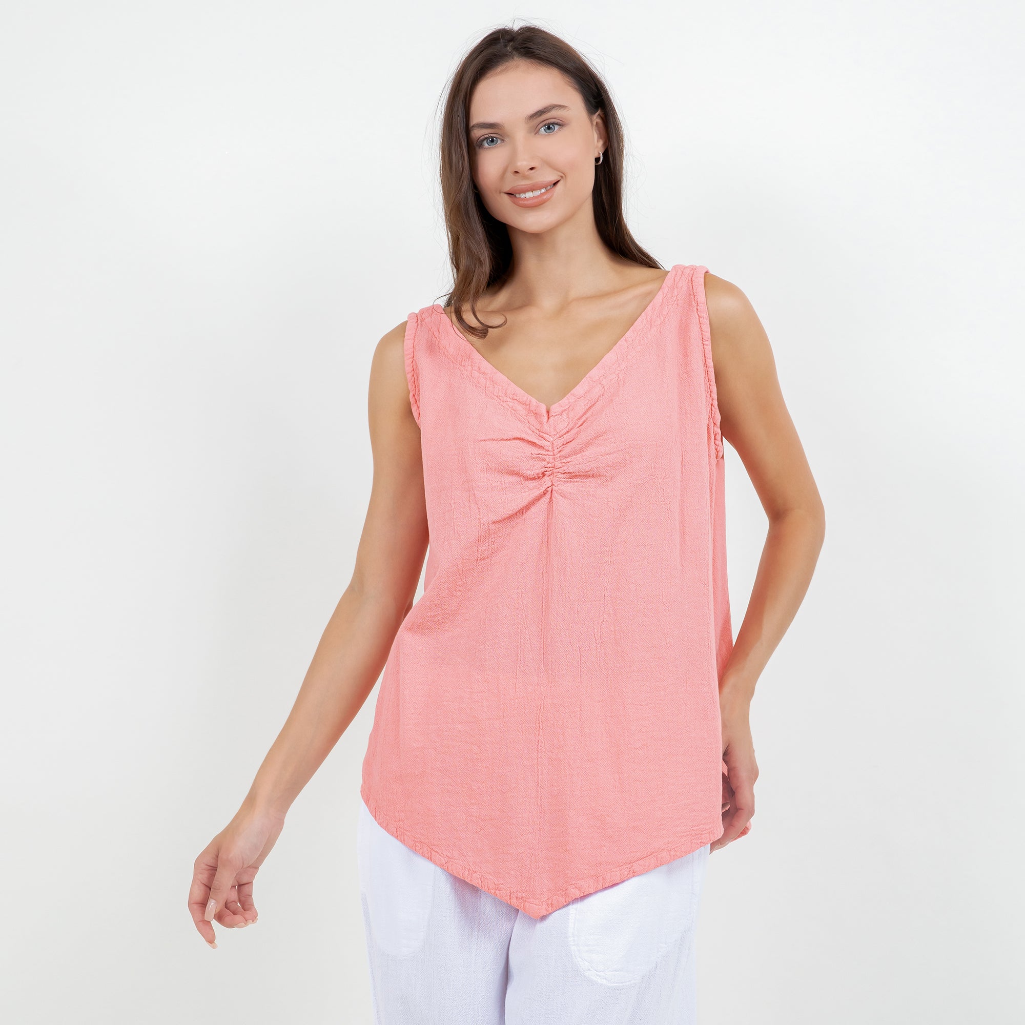 The Dominica Tank is a perfect staple piece to add to your wardrobe! Detailed with a V-neck and sinching at the top. This tank is very flattering on all body types with a v-pointed bottom. Perfect for layering!