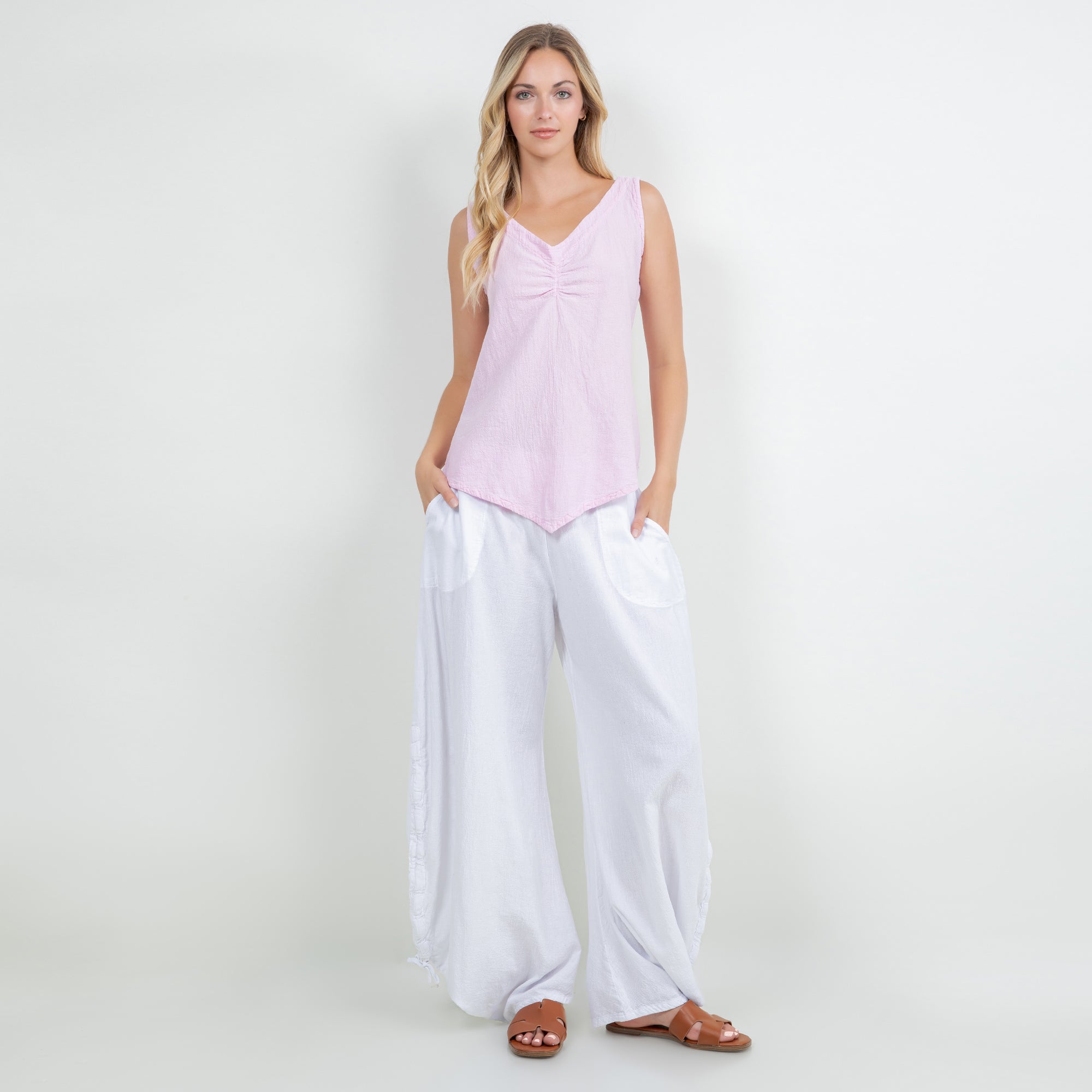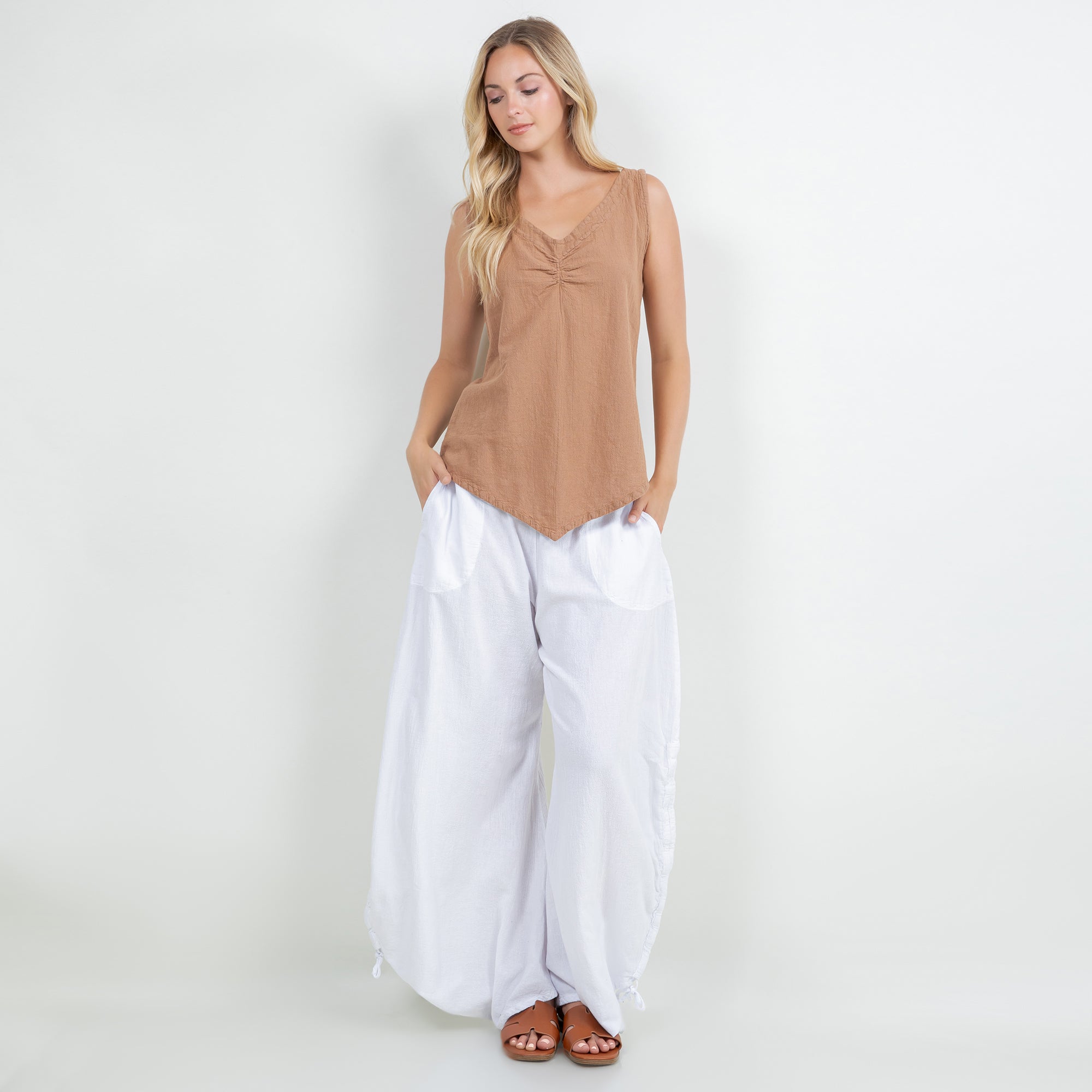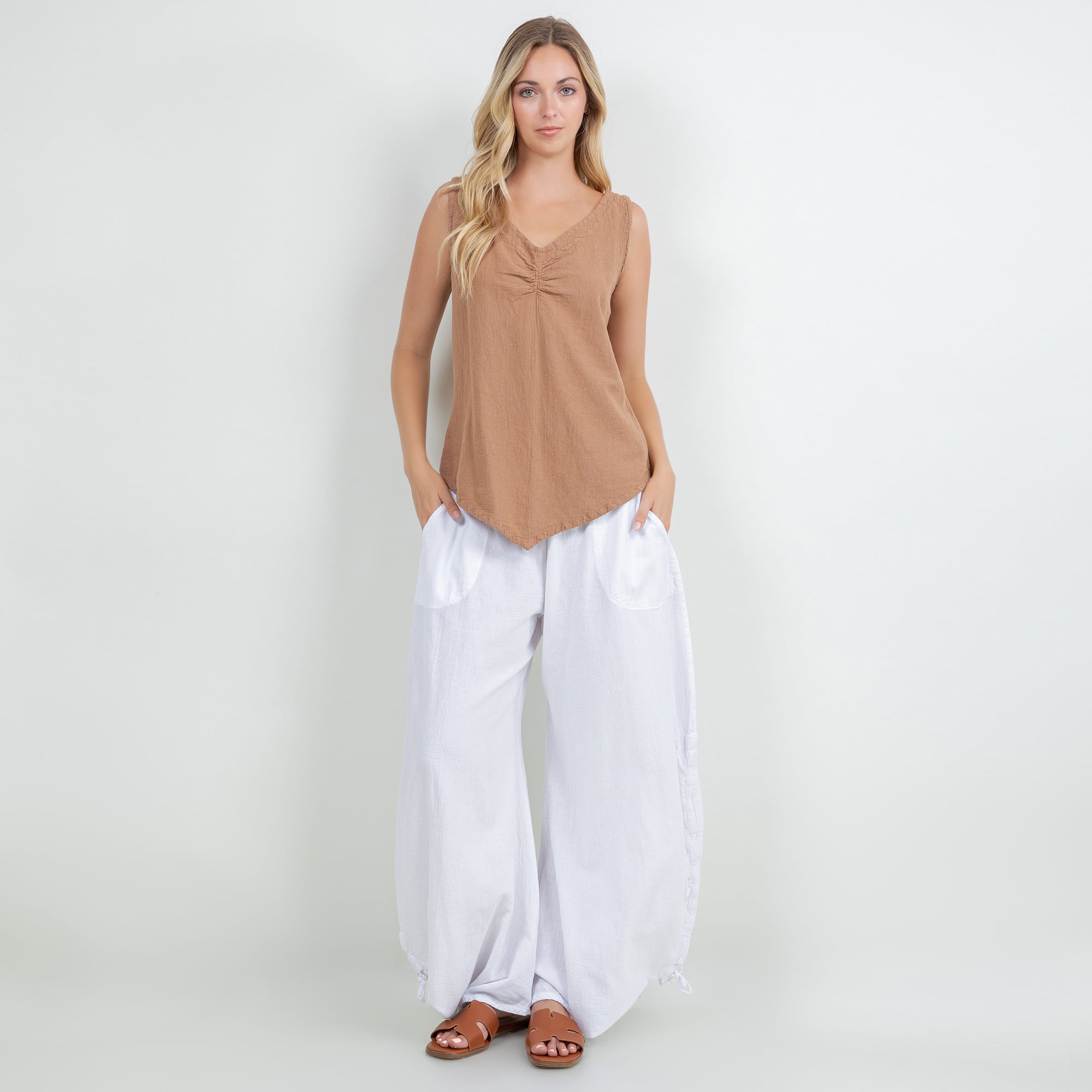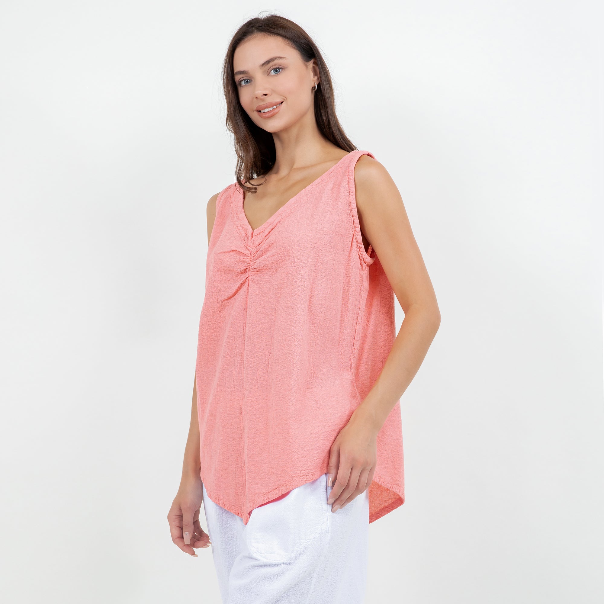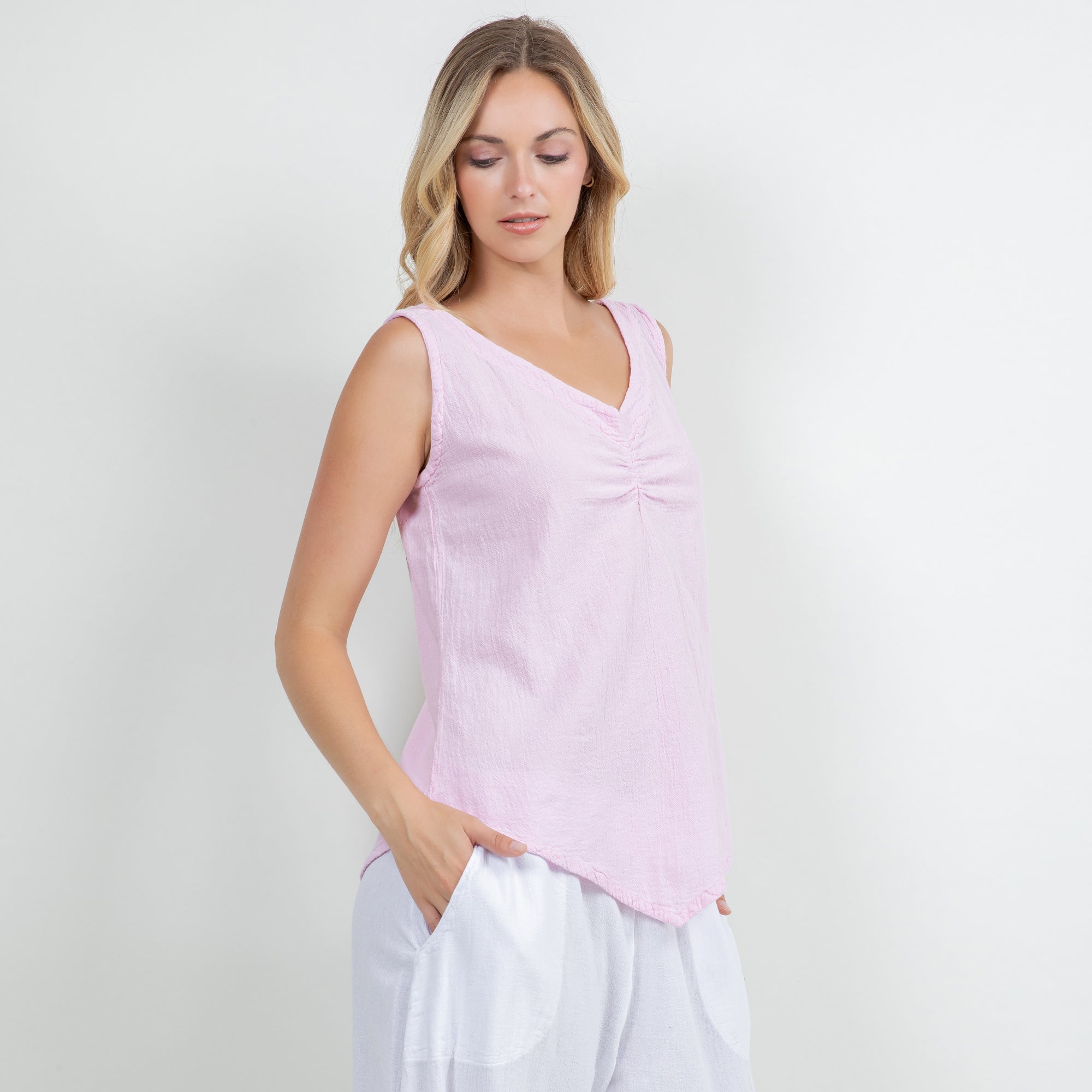 The Dominica Tank is a perfect staple piece to add to your wardrobe! Detailed with a V-neck and sinching at the top. This tank is very flattering on all body types with a v-pointed bottom. Perfect for layering!