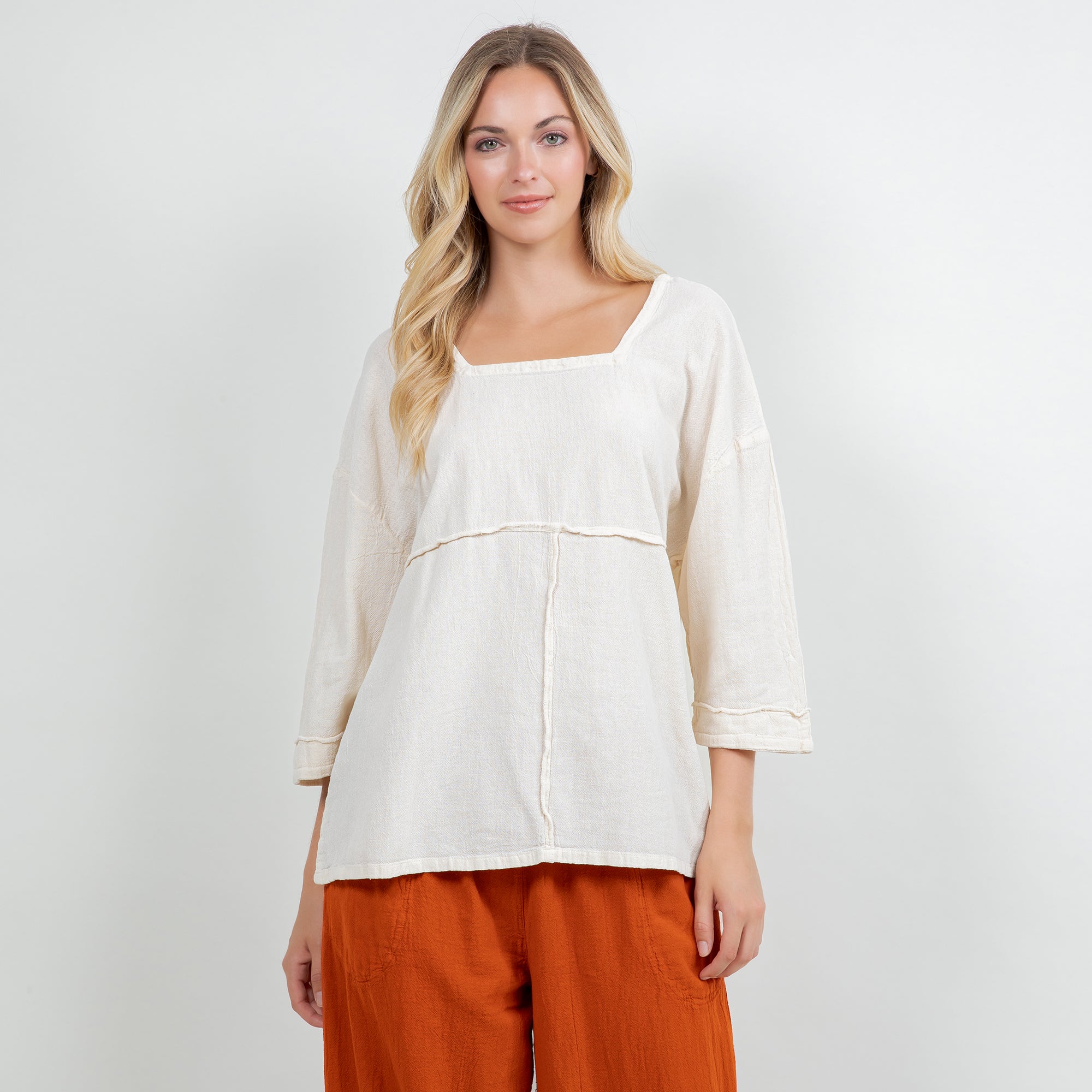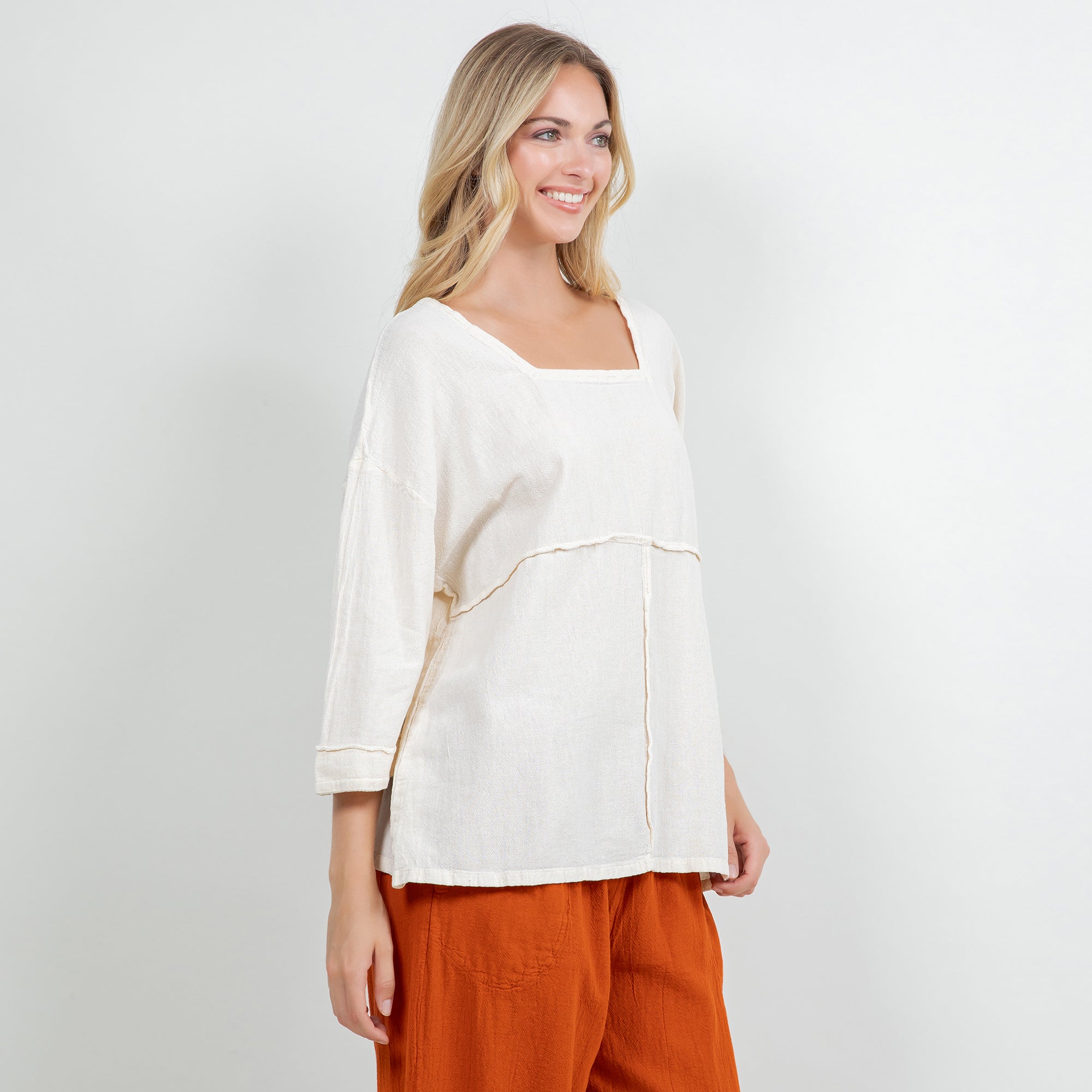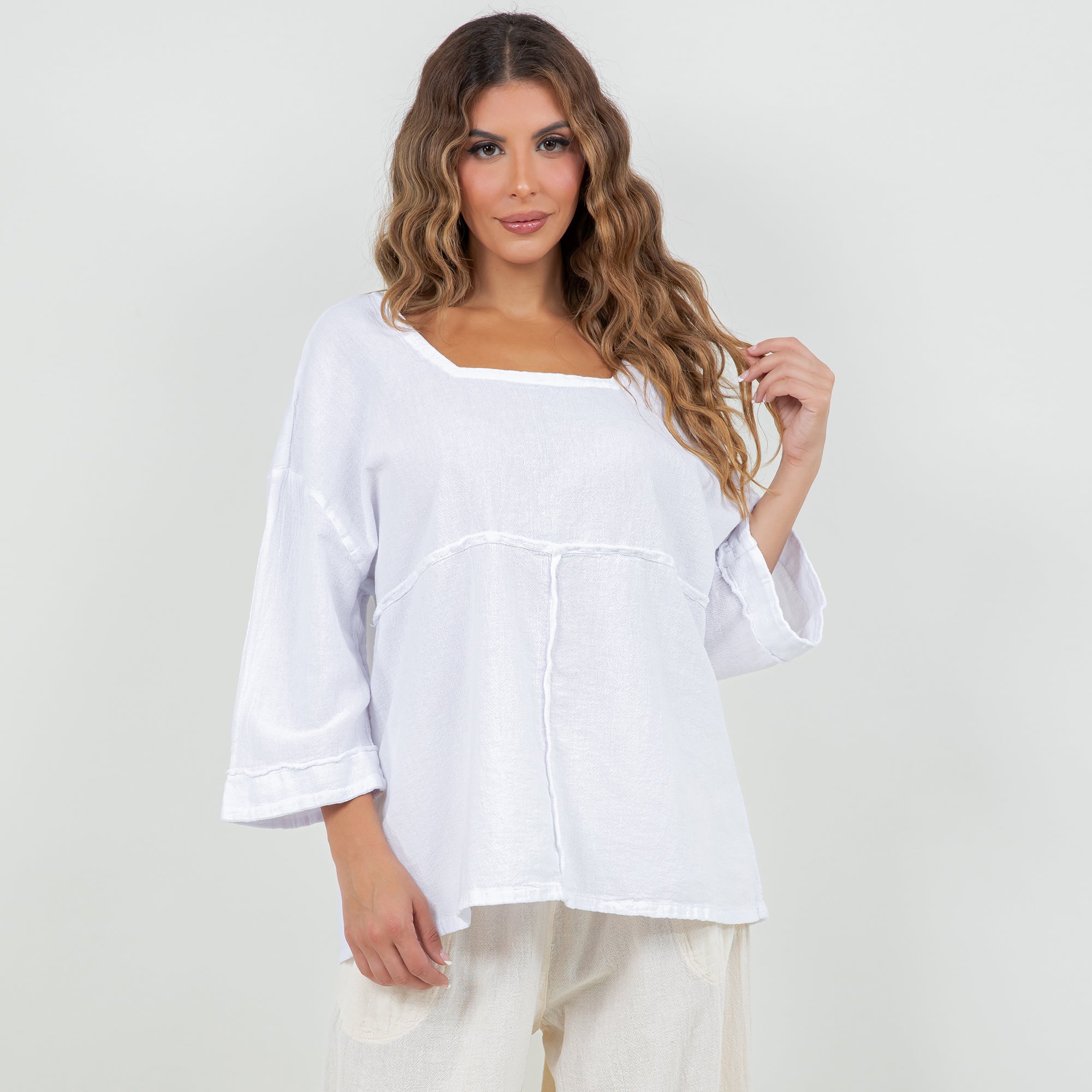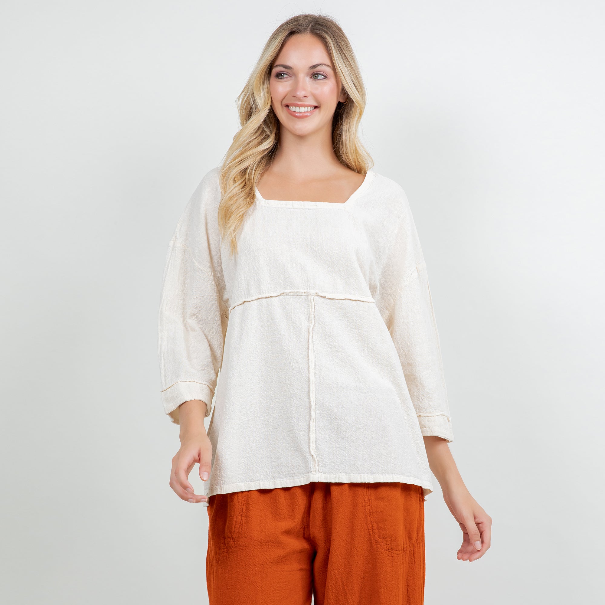 Elena is detailed with a flattering square neck, 3/4 sleeves and overlock detailing across the front.