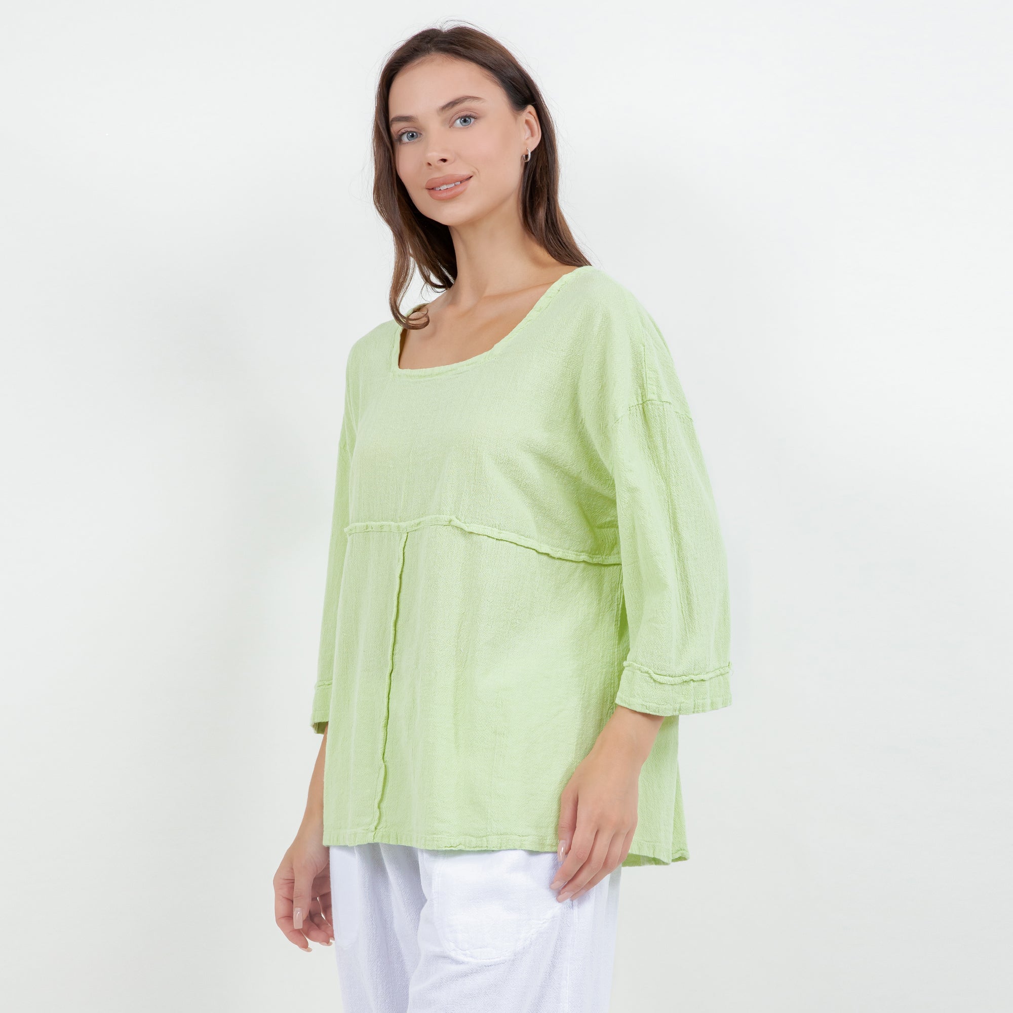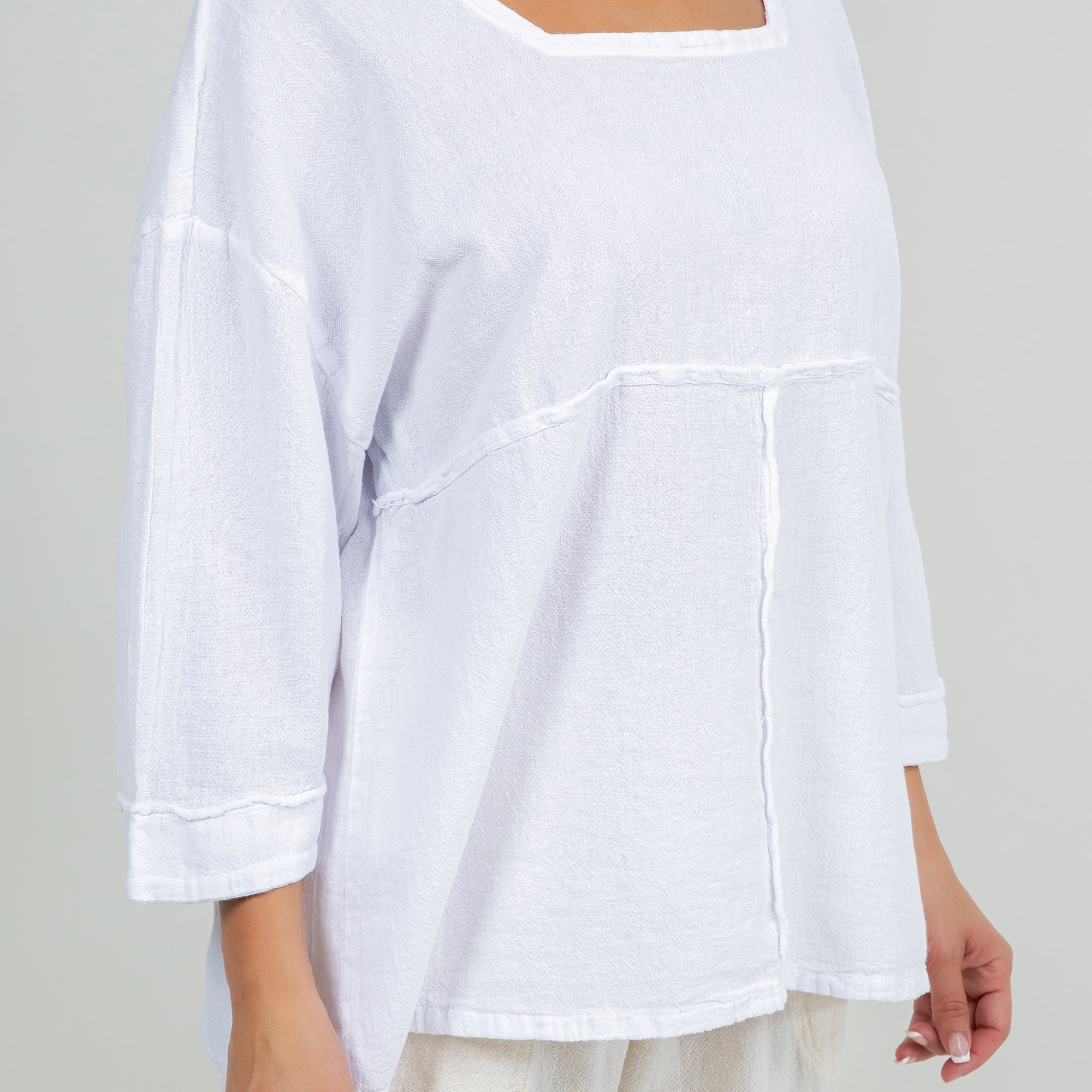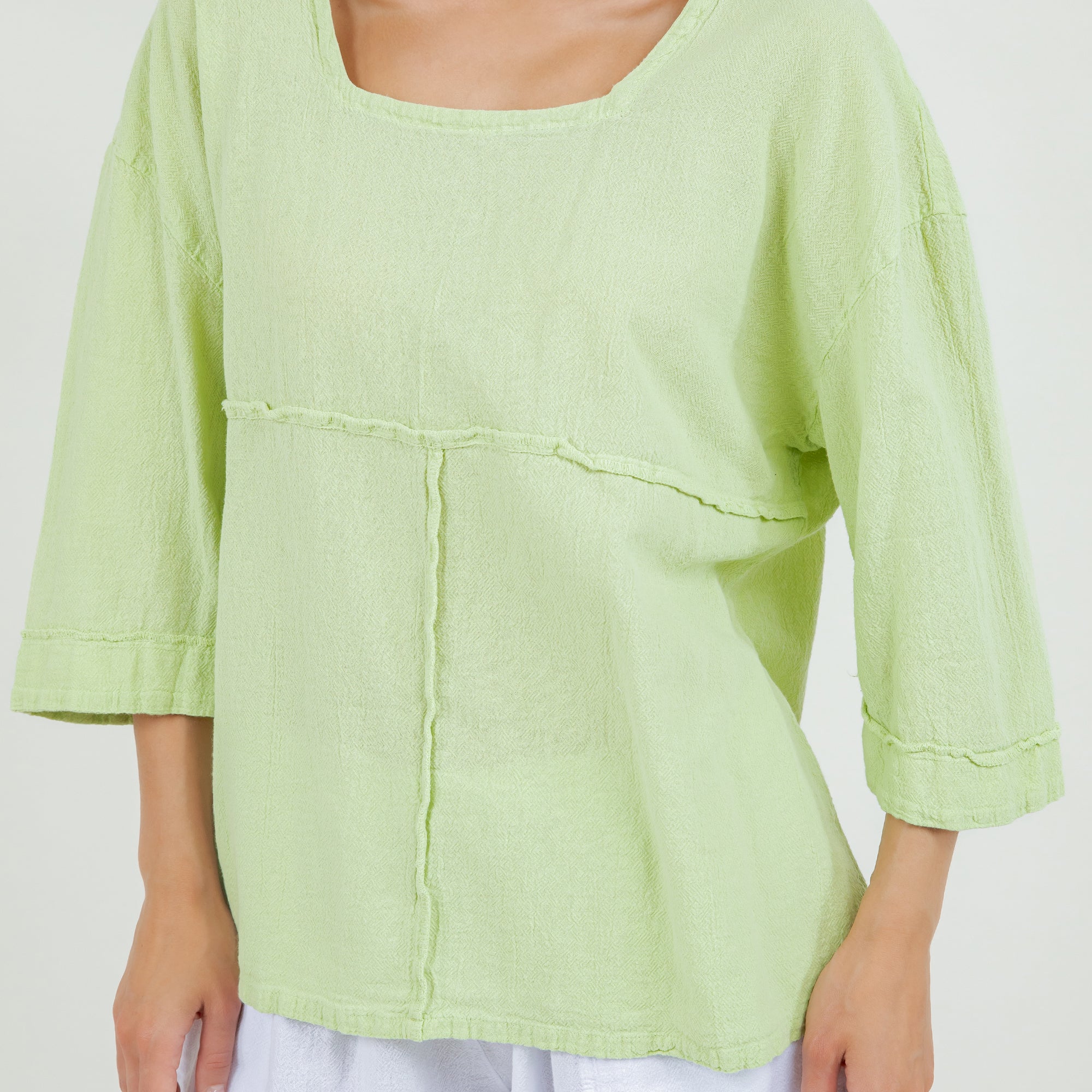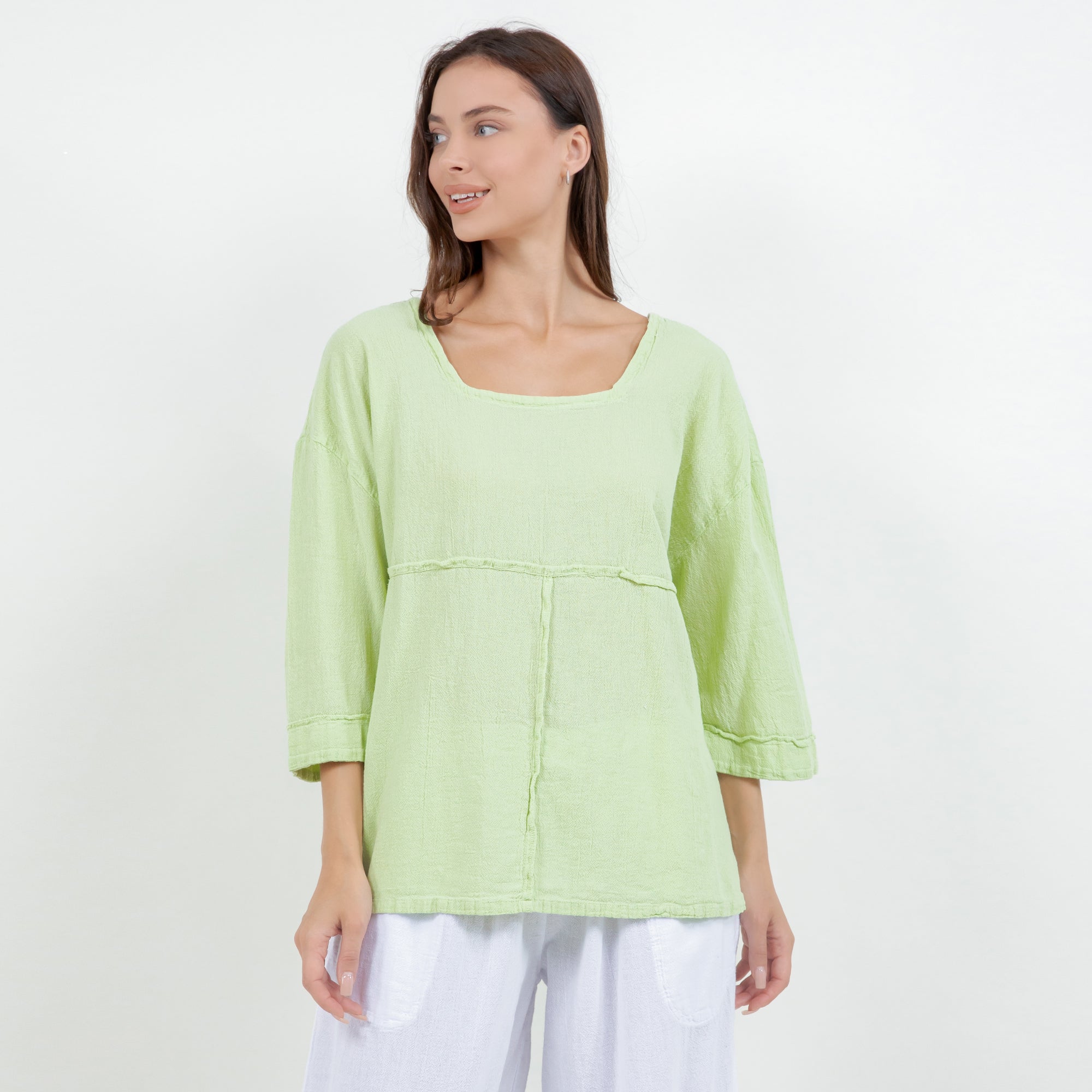 Elena is detailed with a flattering square neck, 3/4 sleeves and overlock detailing across the front.