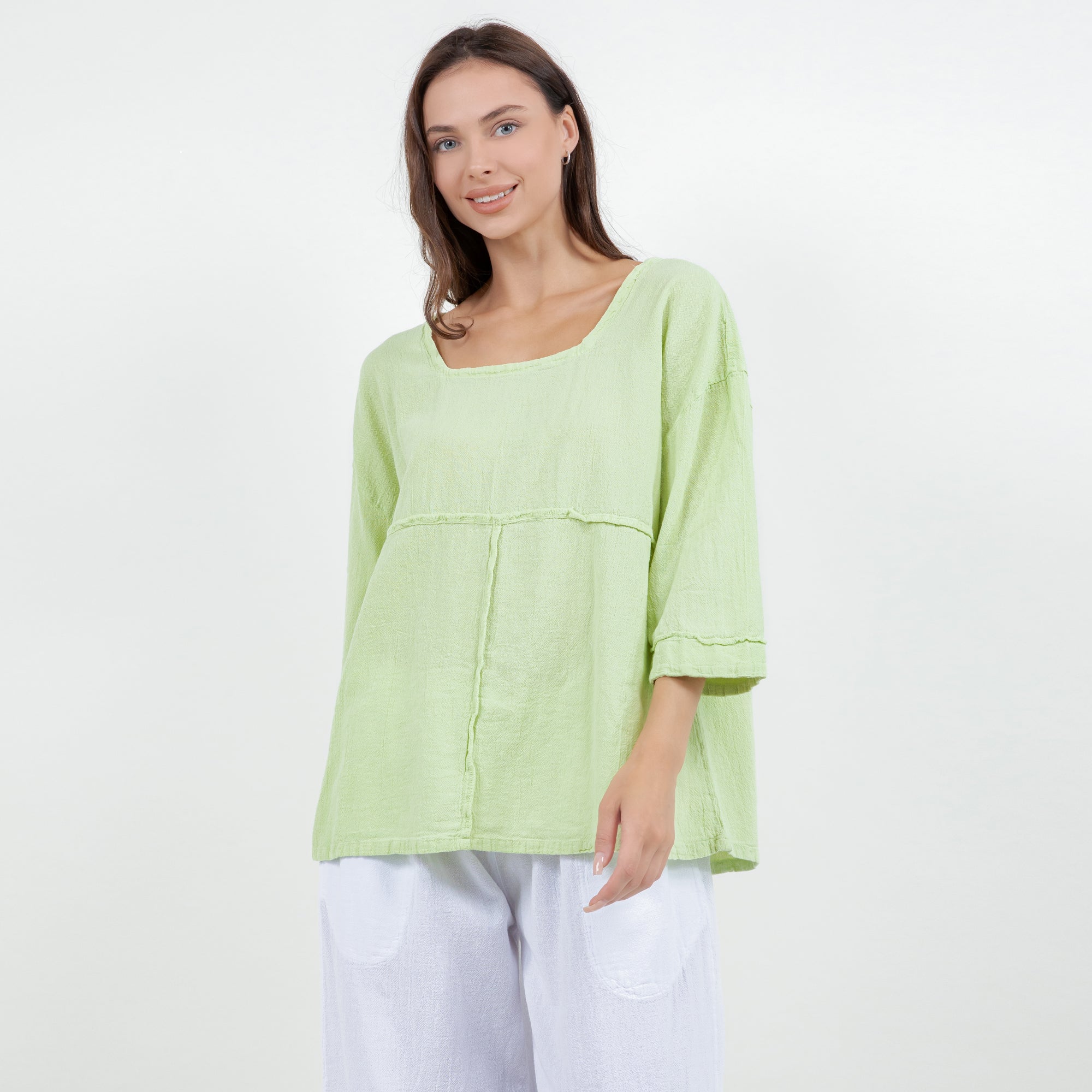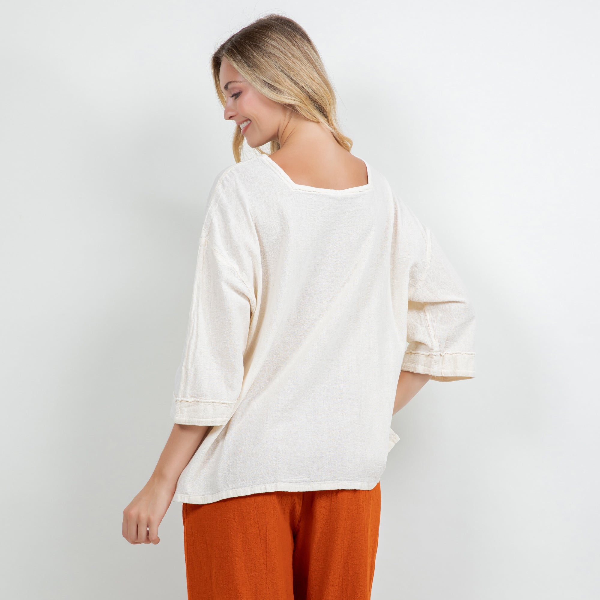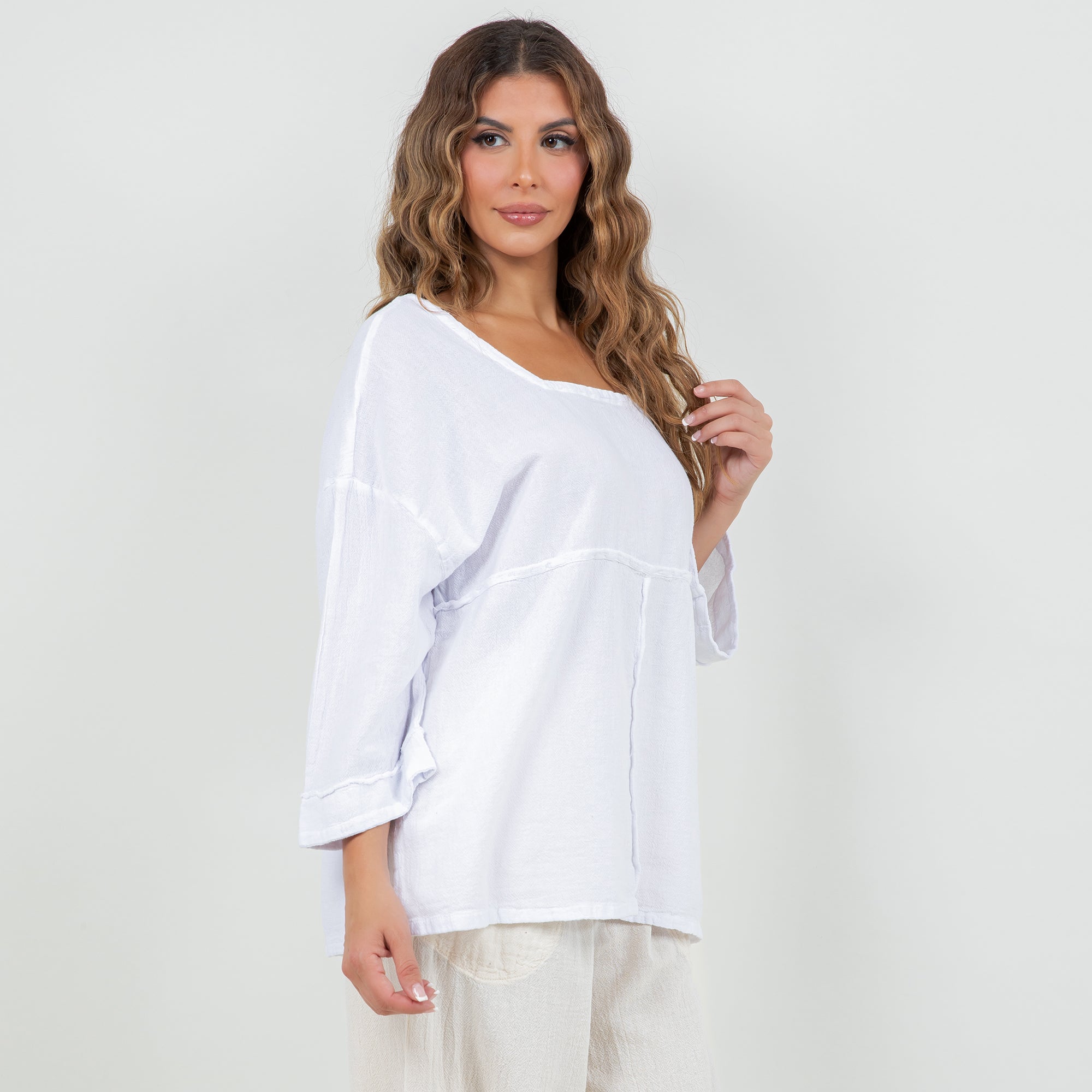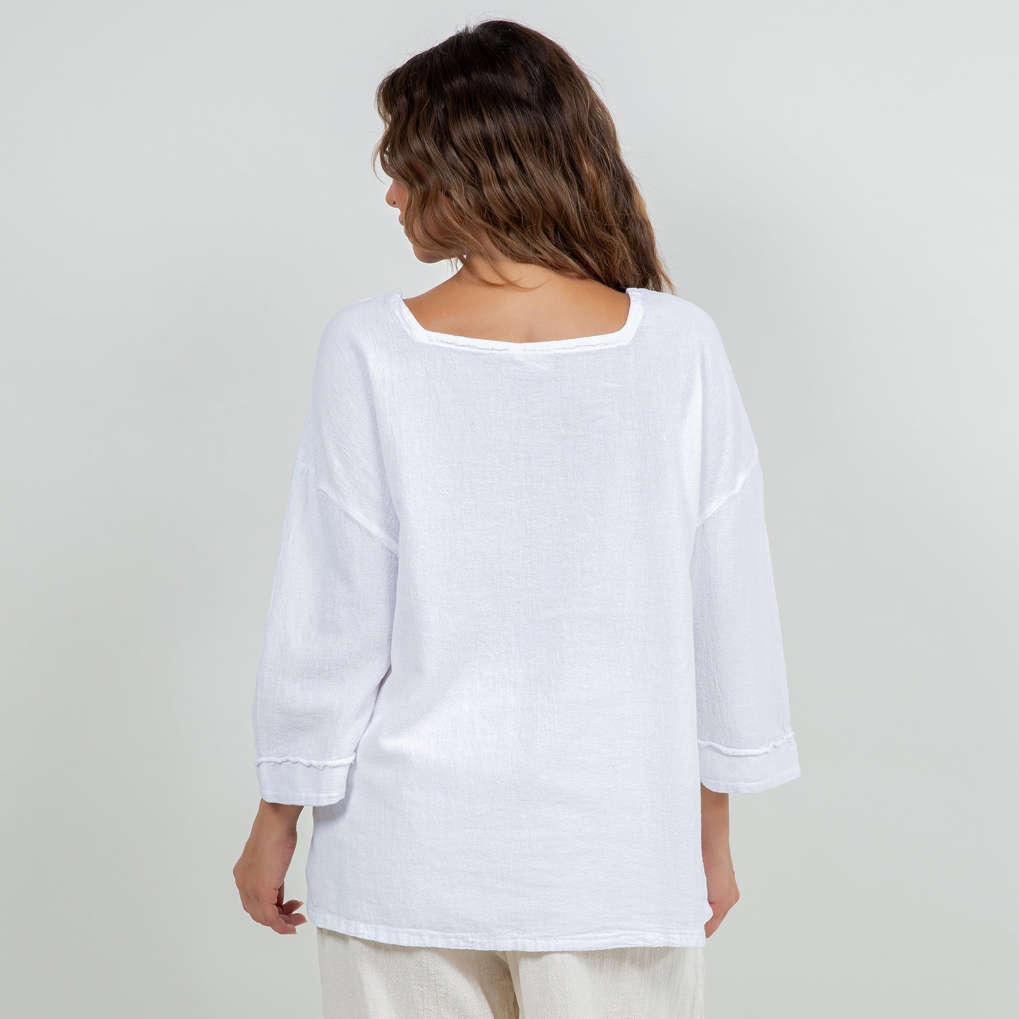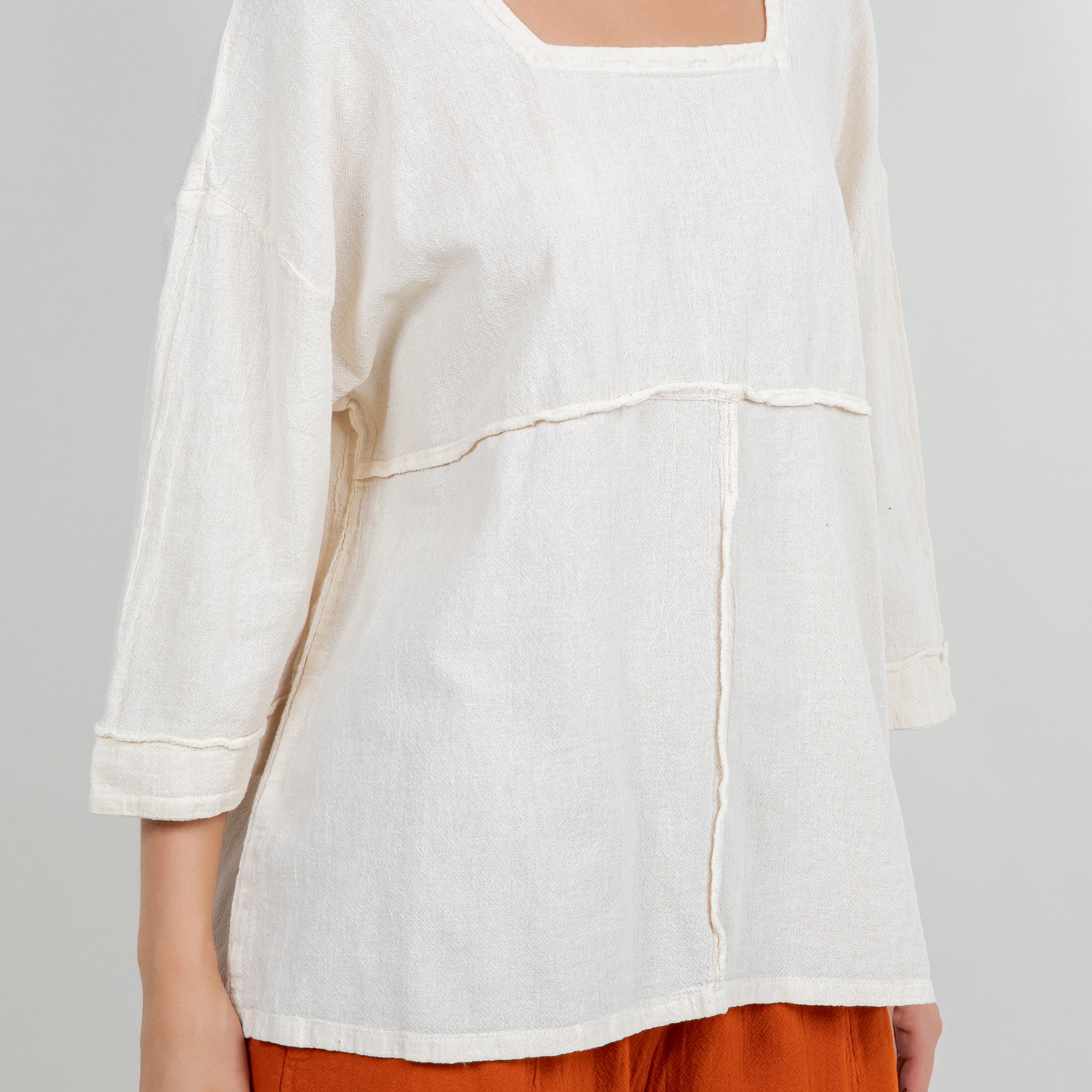 Elena is detailed with a flattering square neck, 3/4 sleeves and overlock detailing across the front.