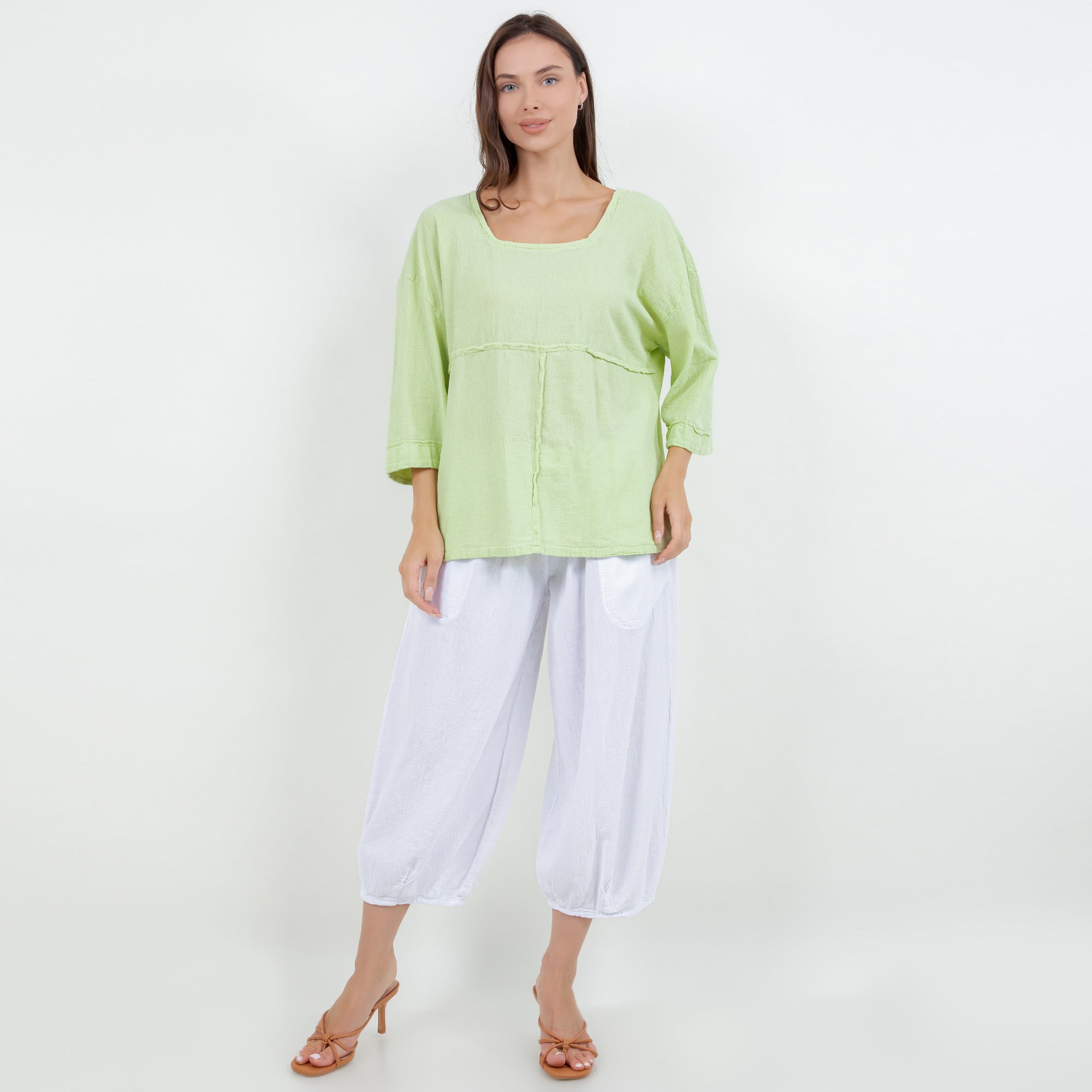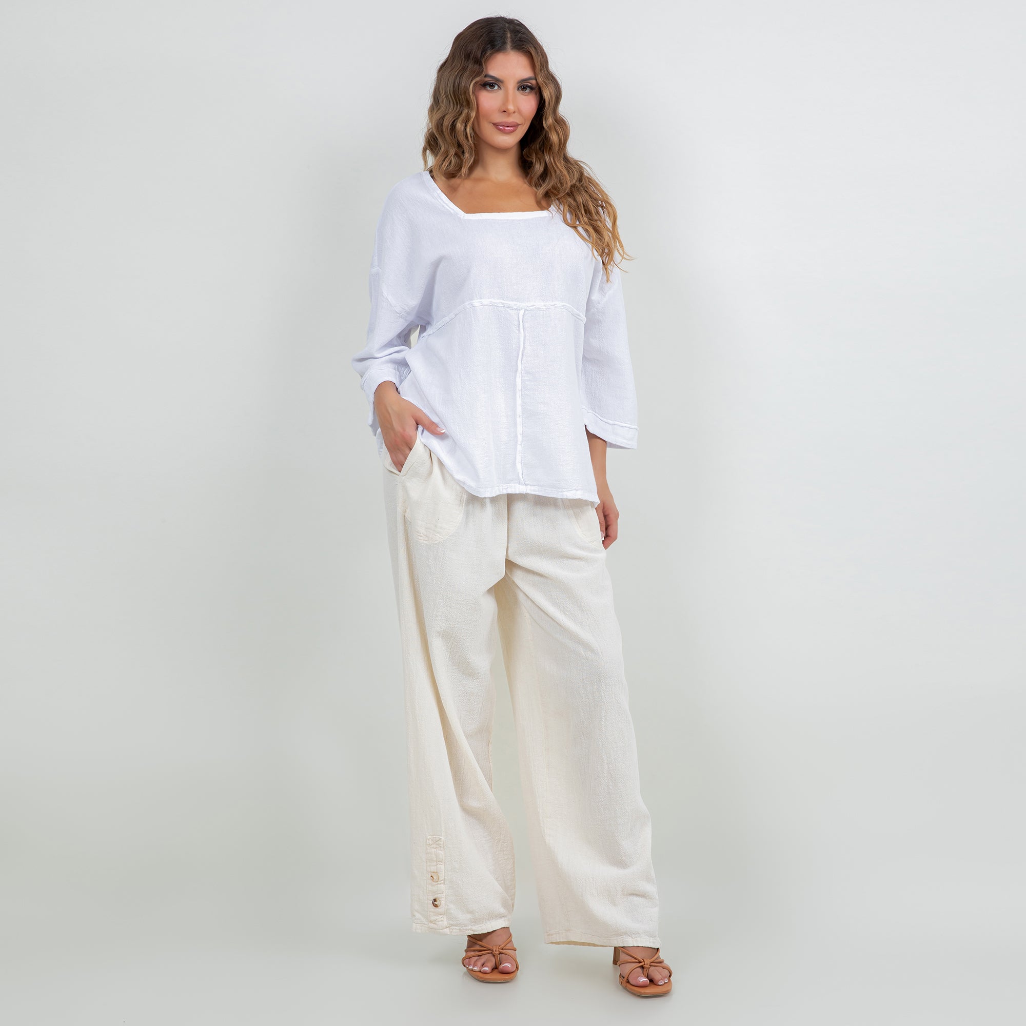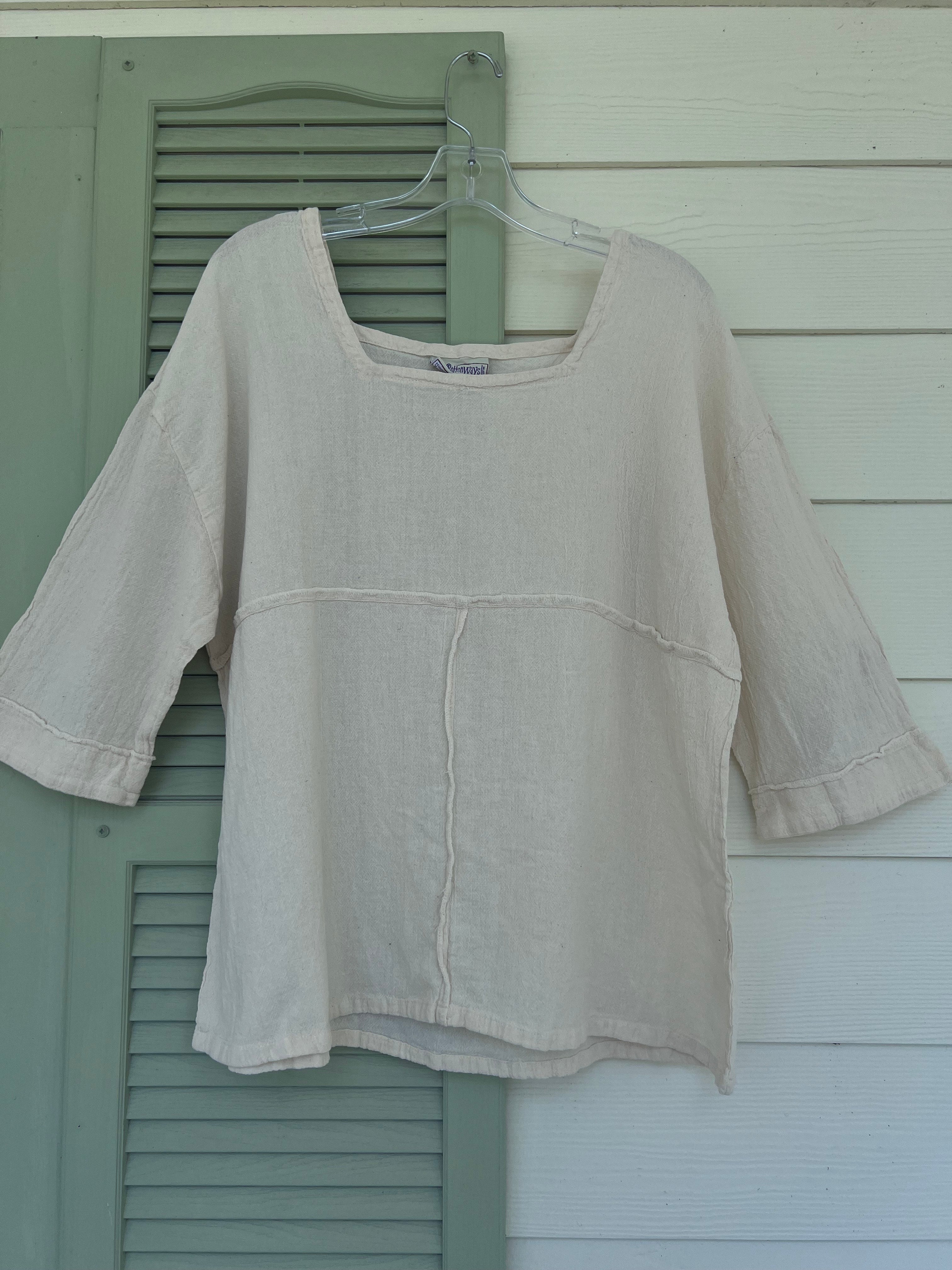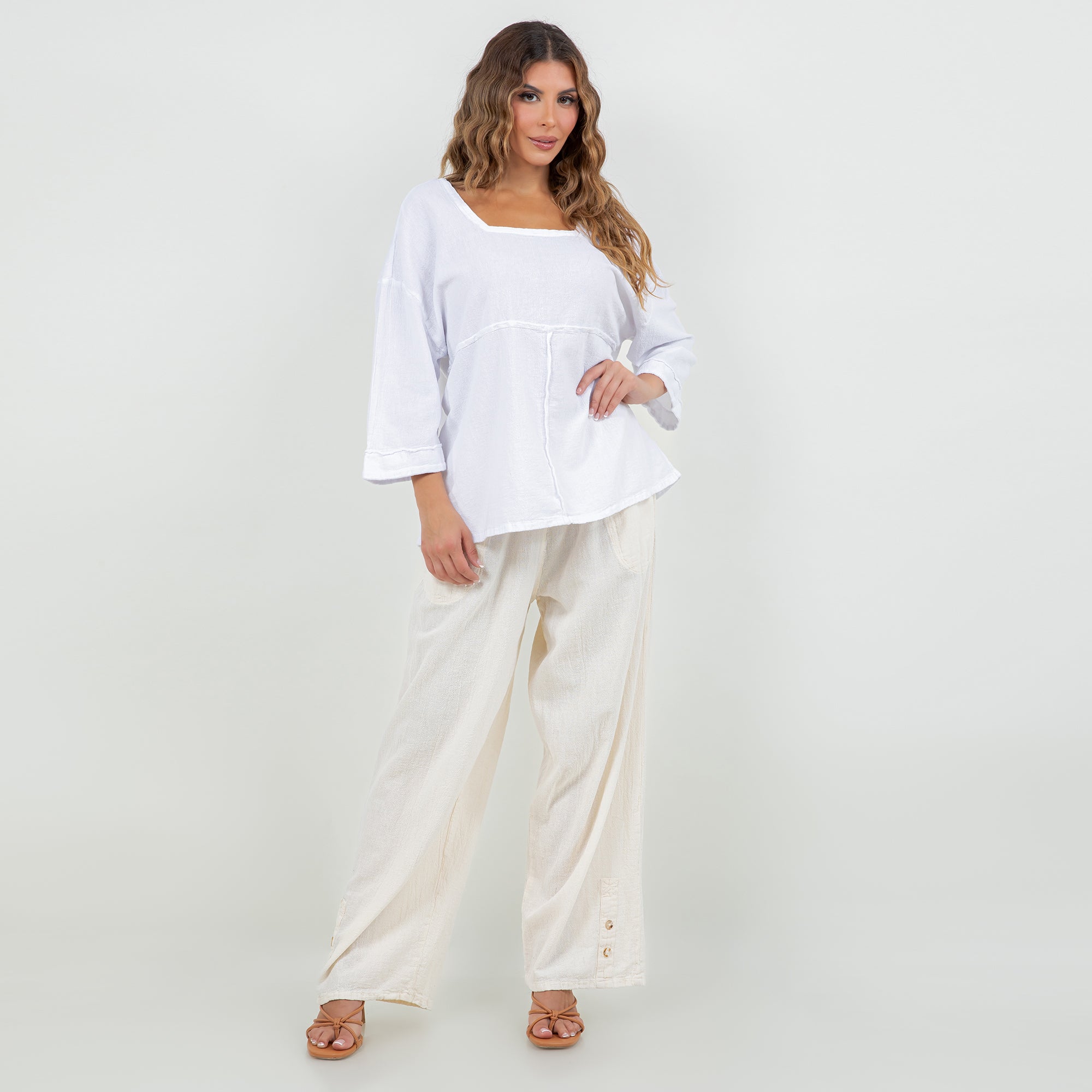 Elena is detailed with a flattering square neck, 3/4 sleeves and overlock detailing across the front.
