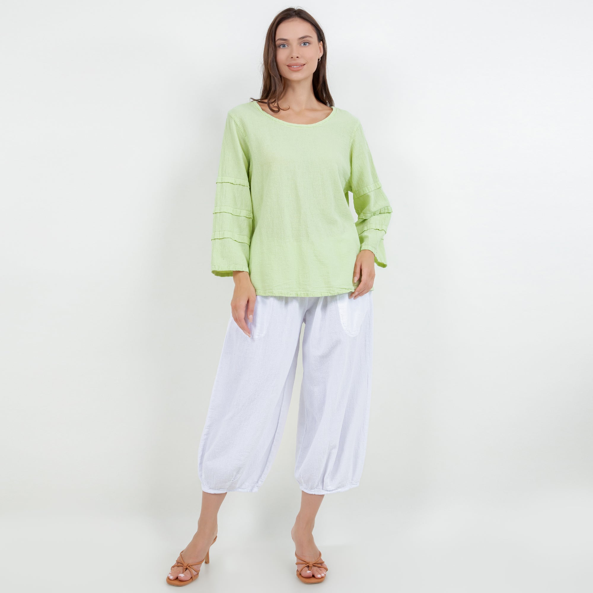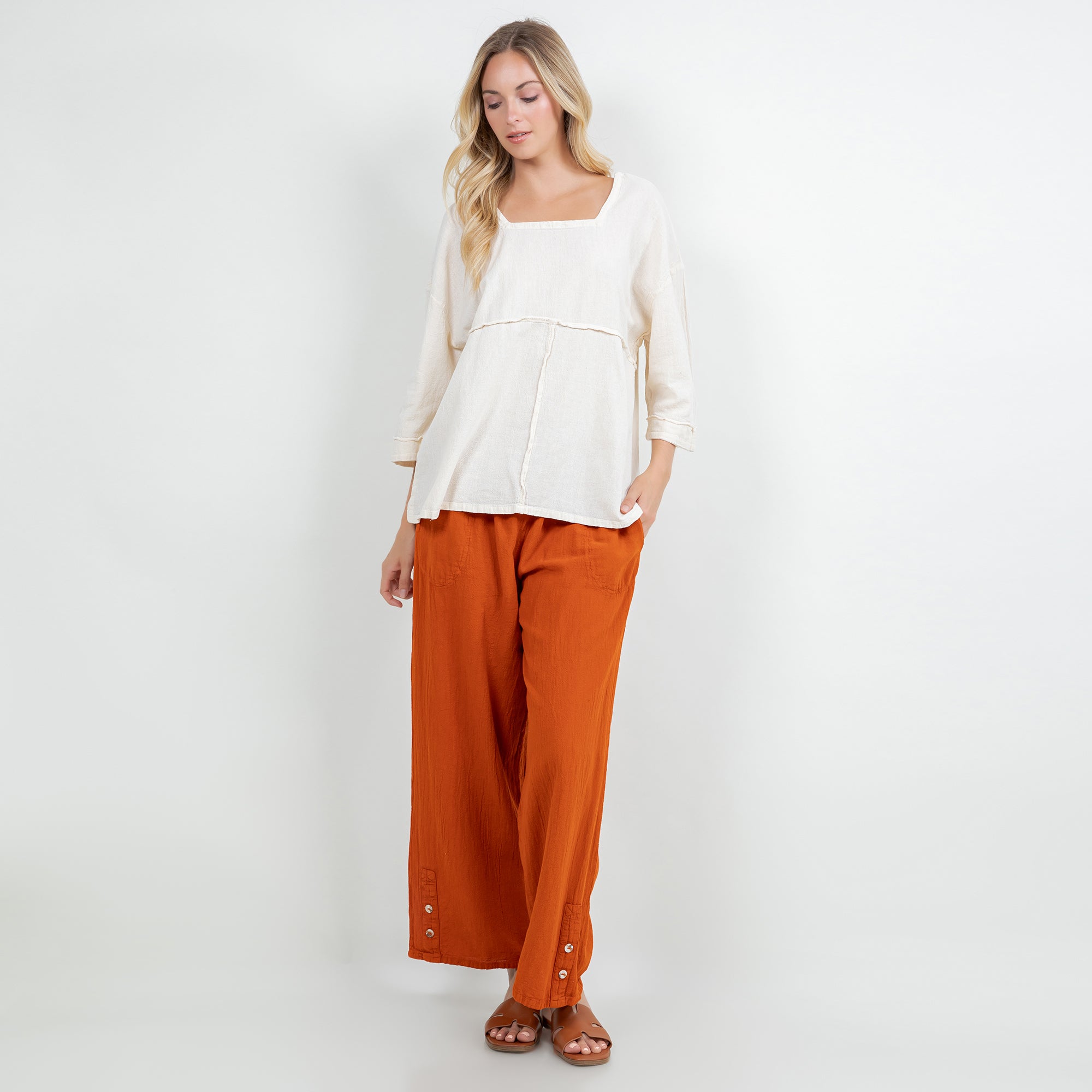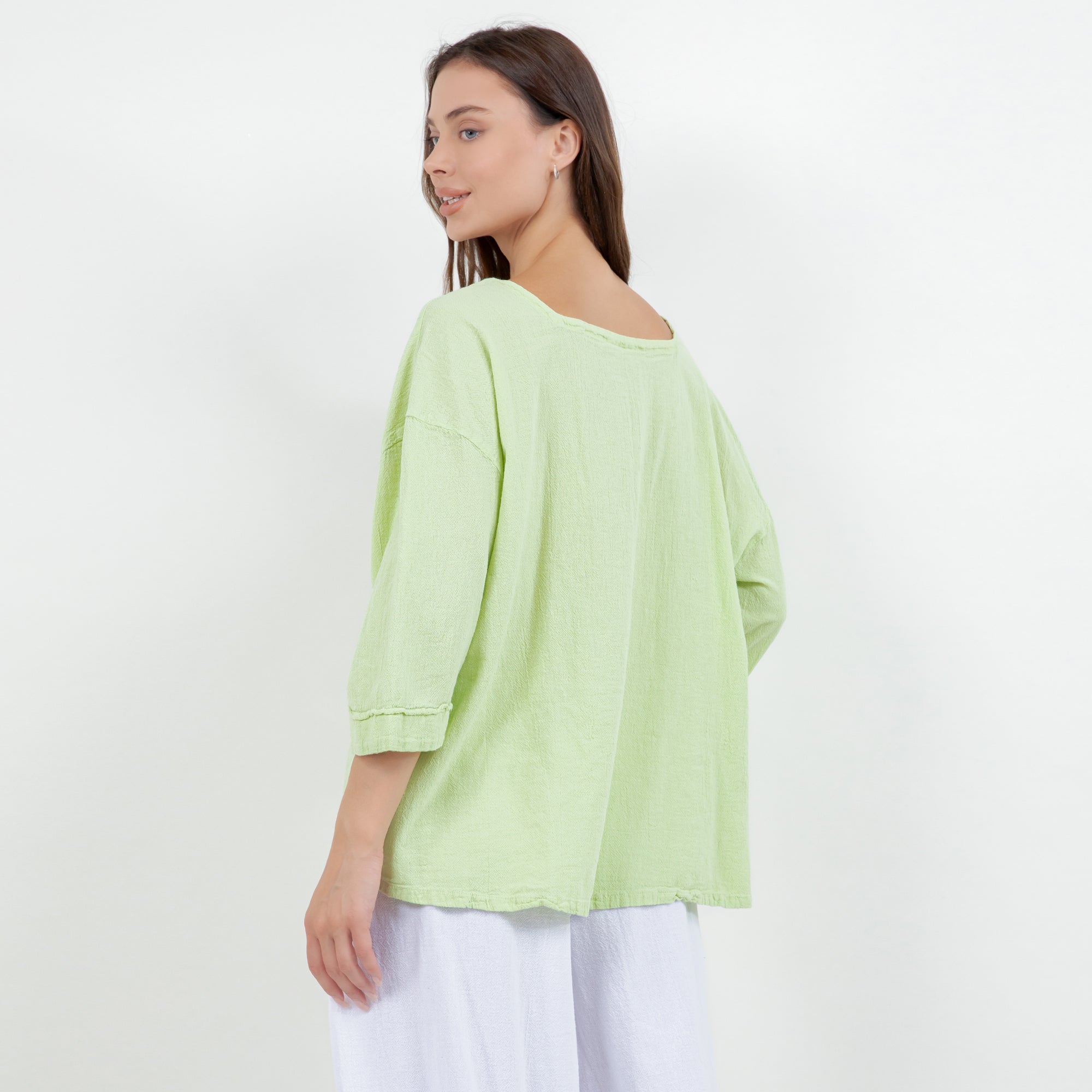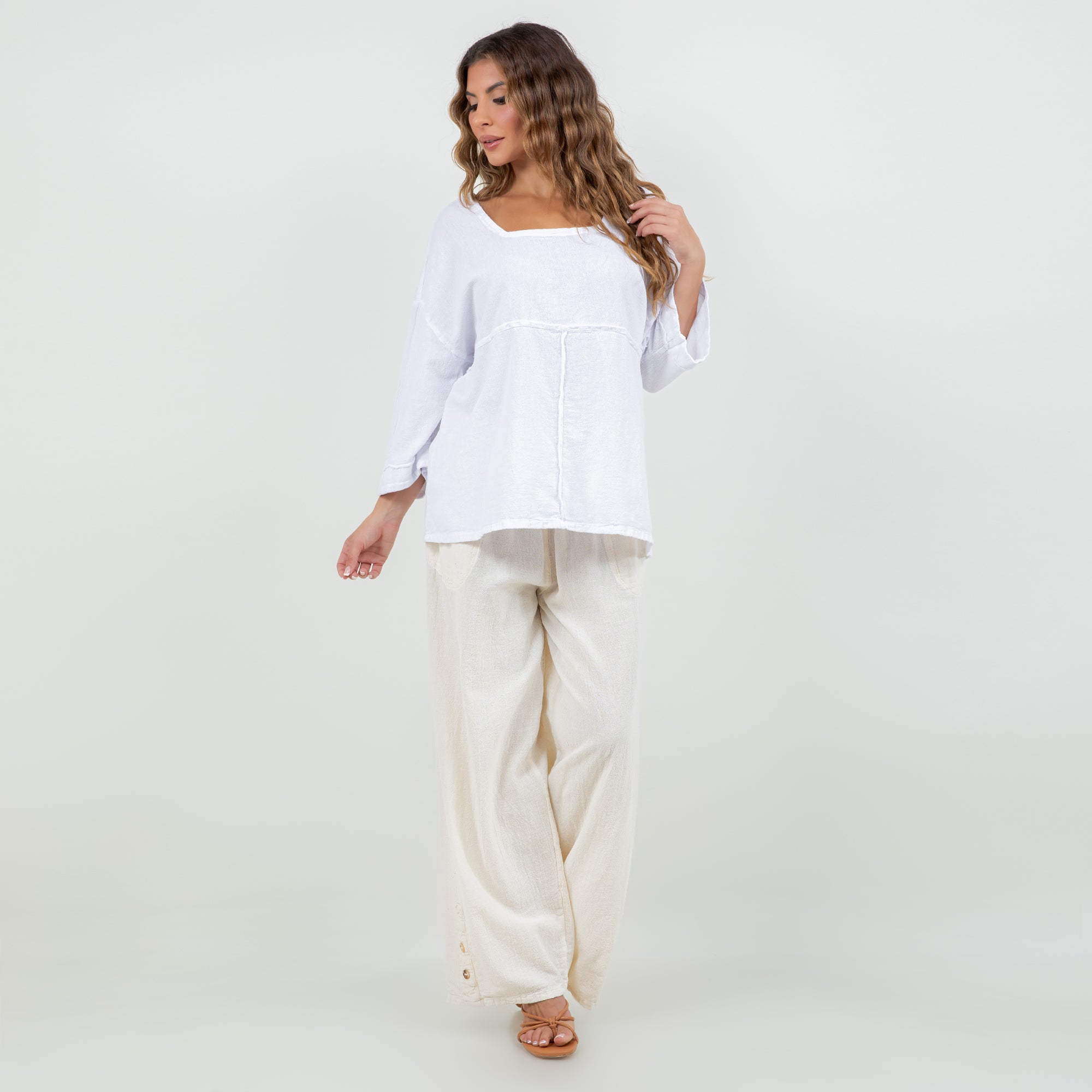 Elena is detailed with a flattering square neck, 3/4 sleeves and overlock detailing across the front.