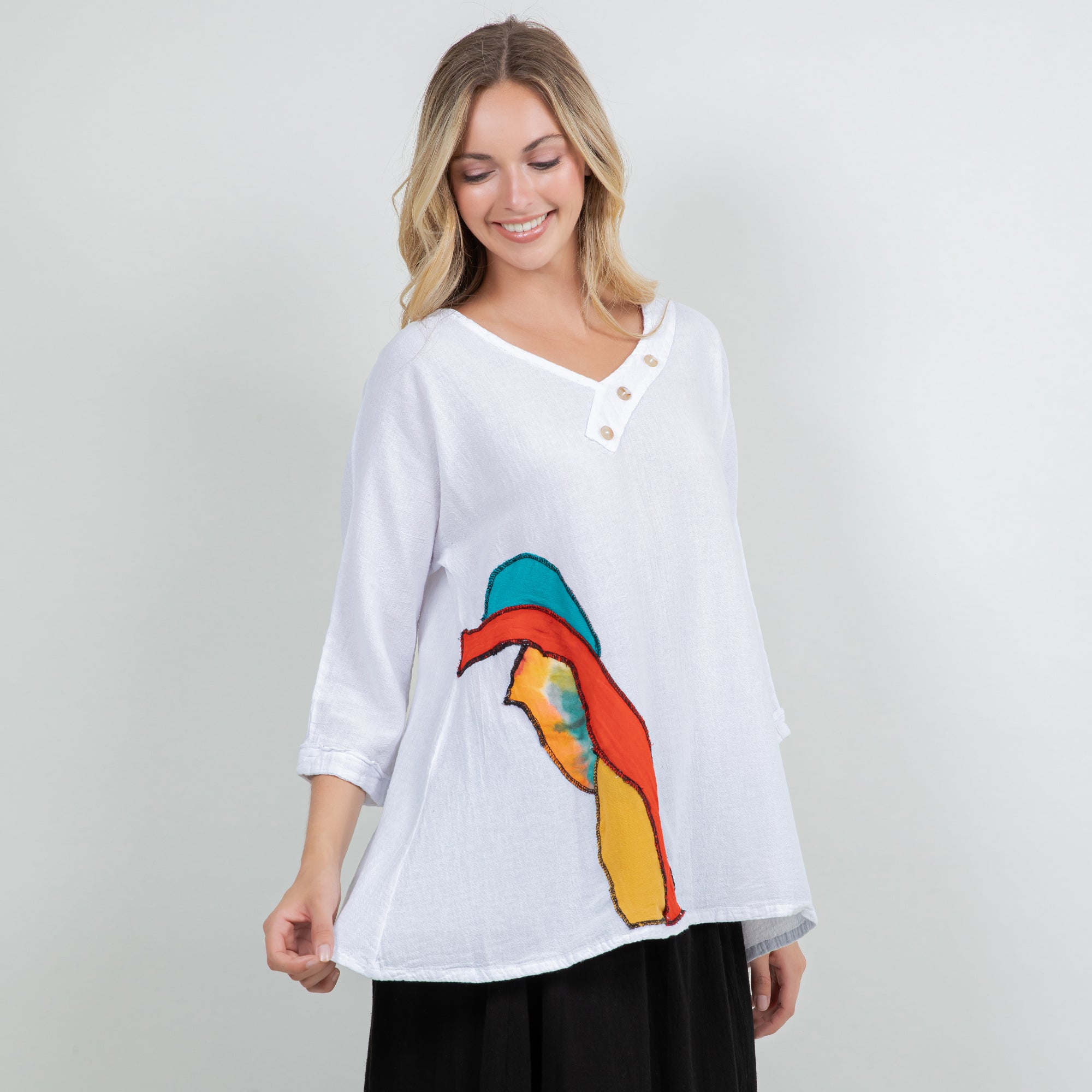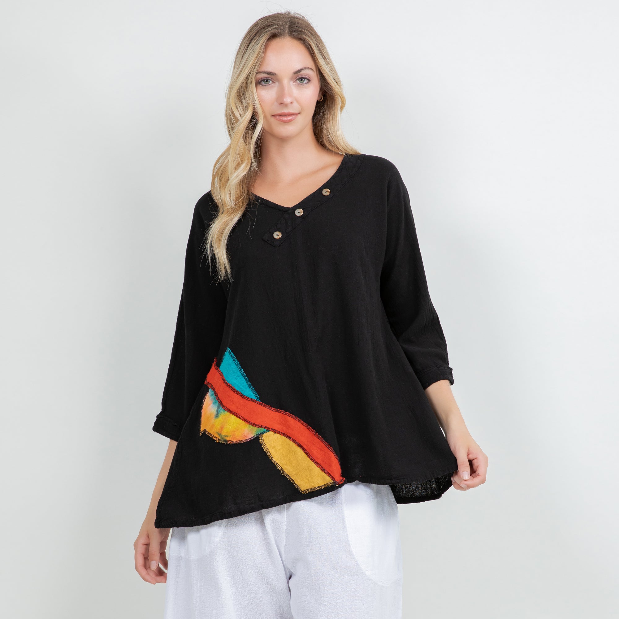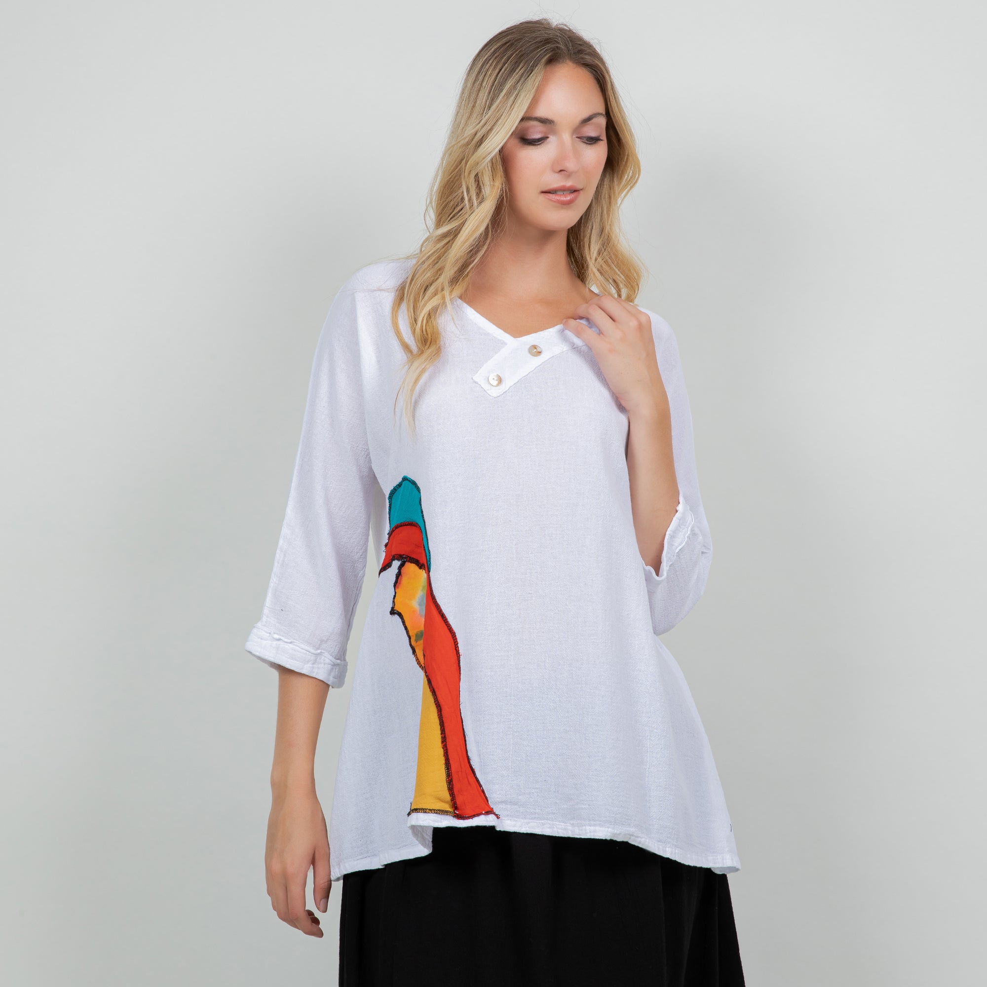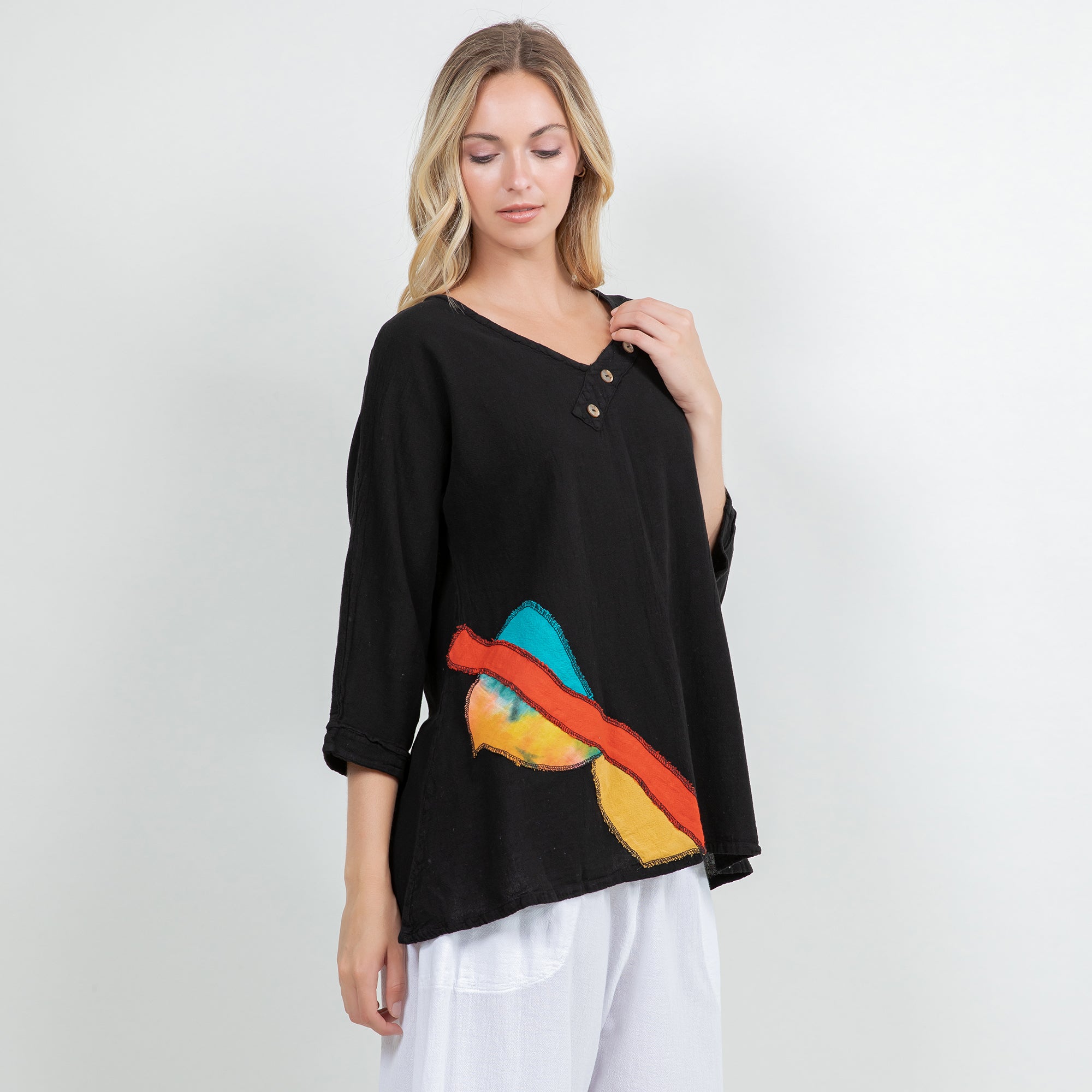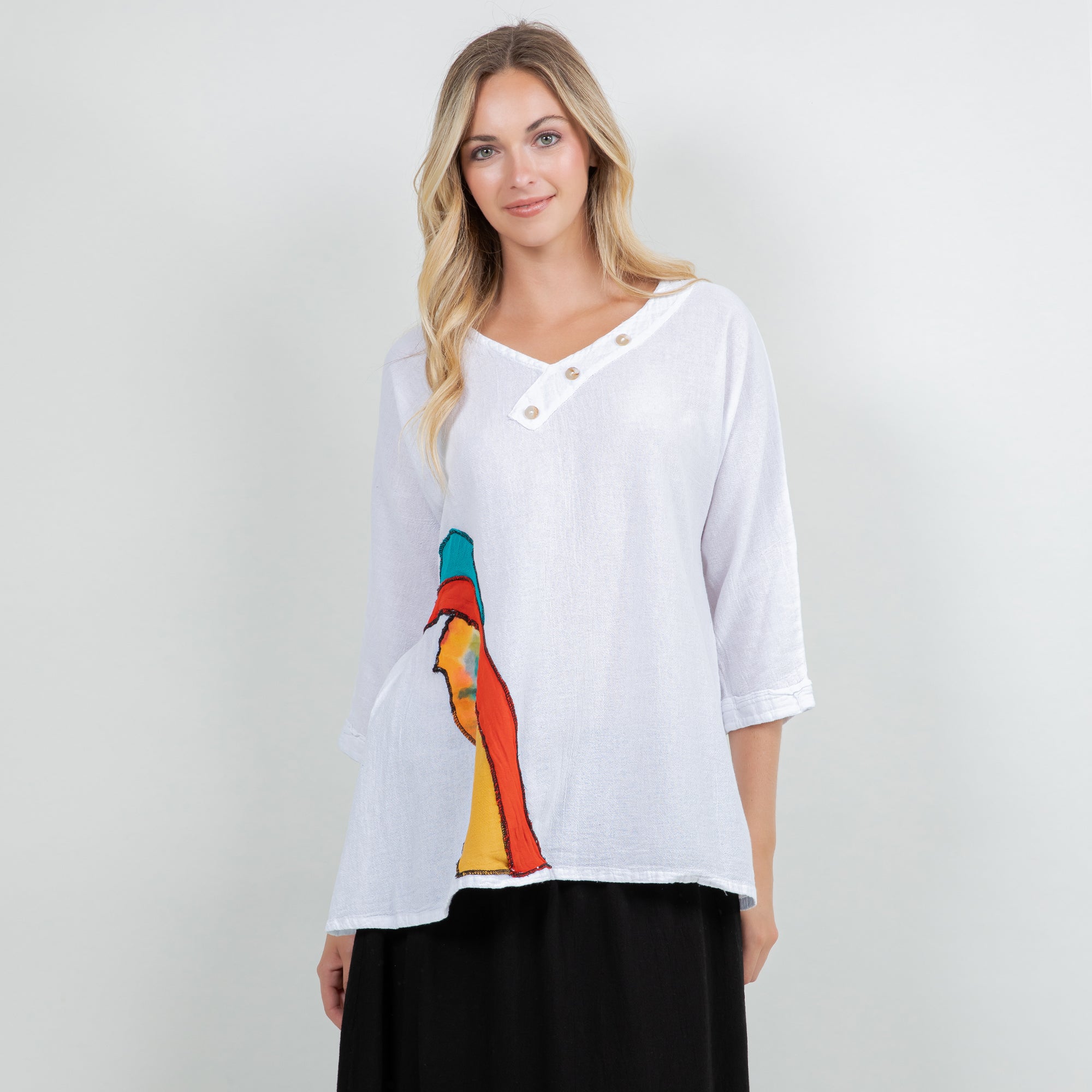 Lucia is a beautiful v-neck top with fun flowy sleeves and a shell button detail at the neckline, it features a hand painted colorful applique on the front.