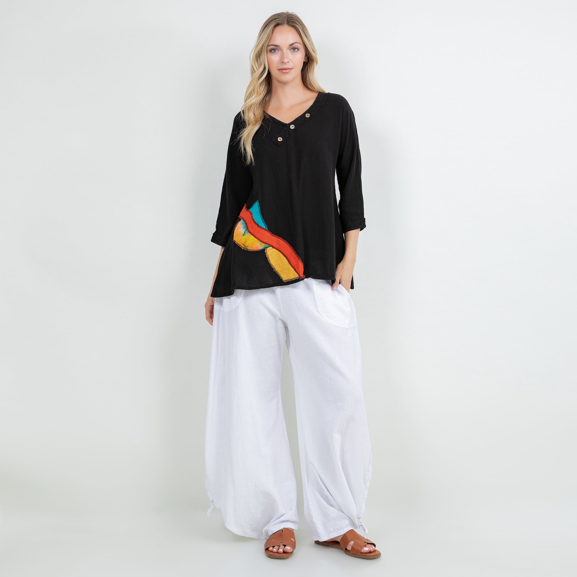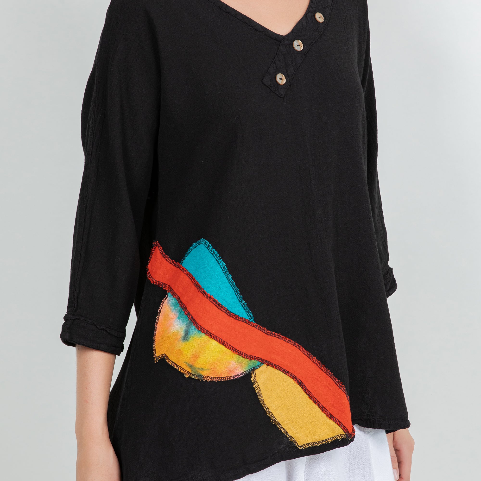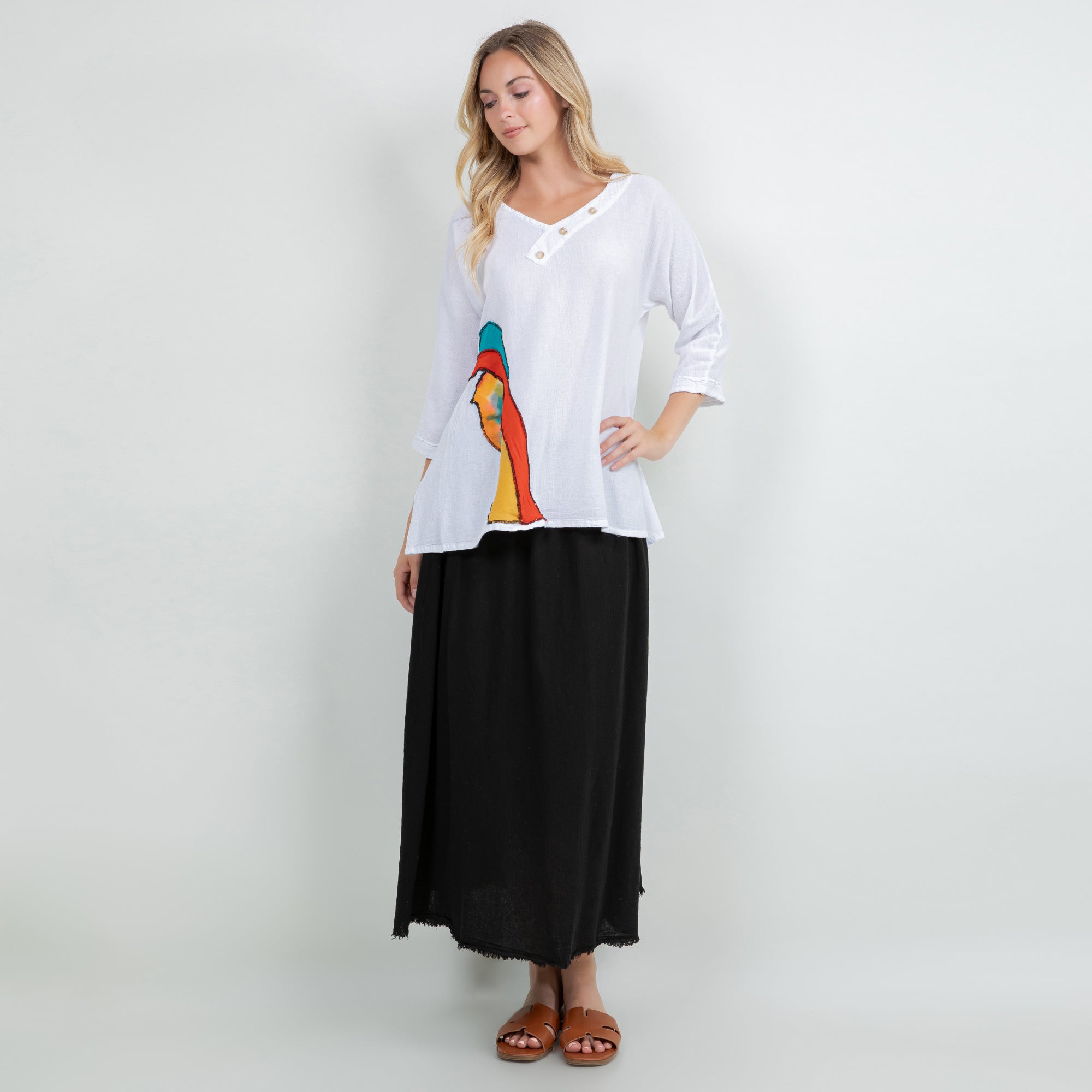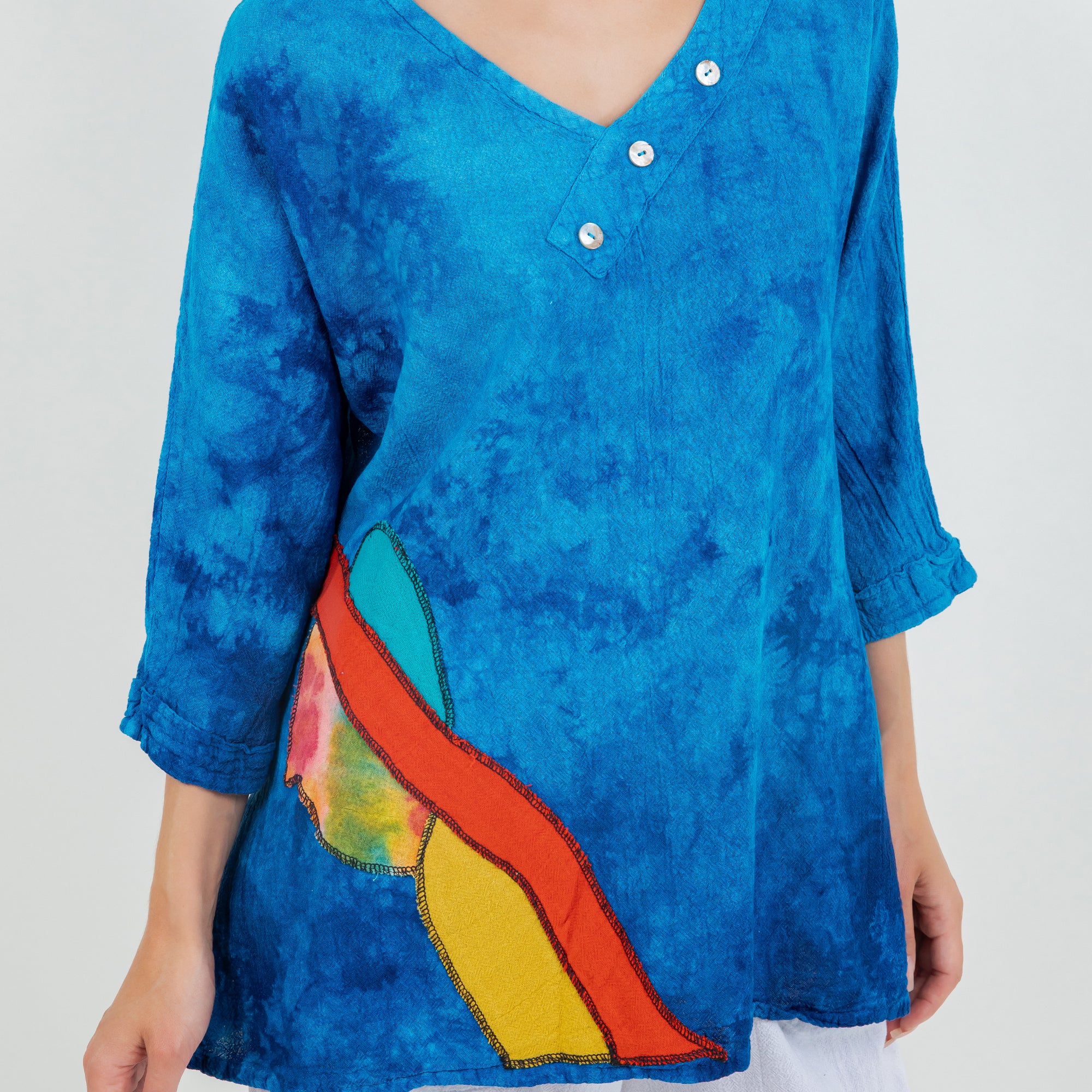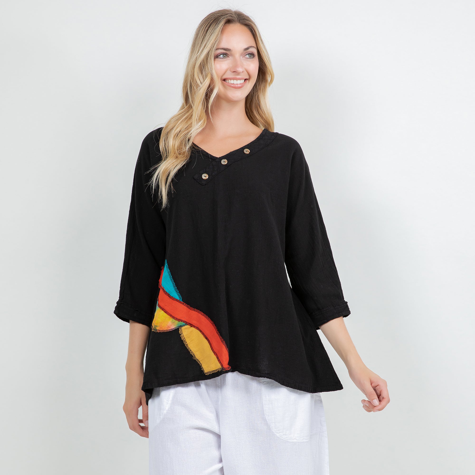 Lucia is a beautiful v-neck top with fun flowy sleeves and a shell button detail at the neckline, it features a hand painted colorful applique on the front.
