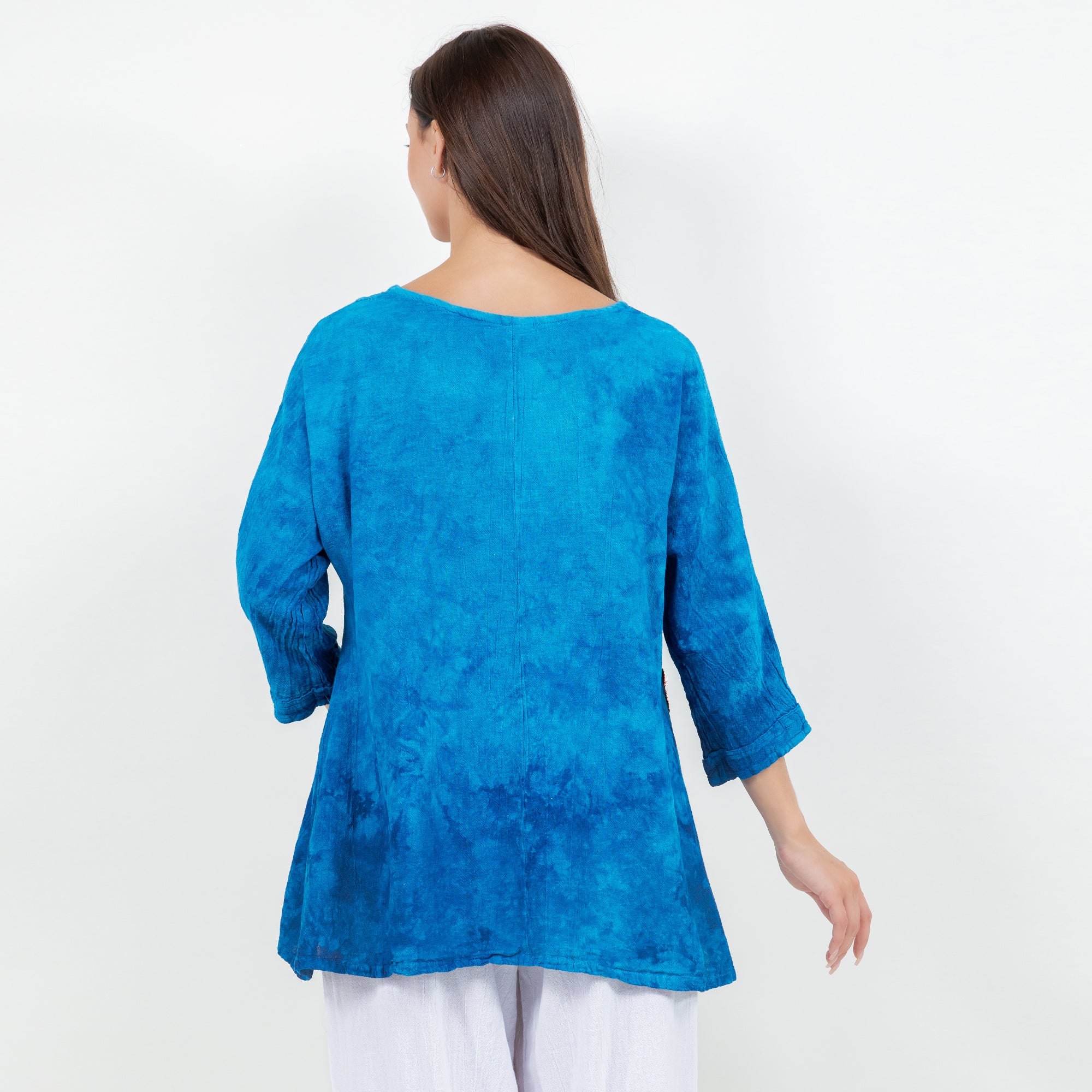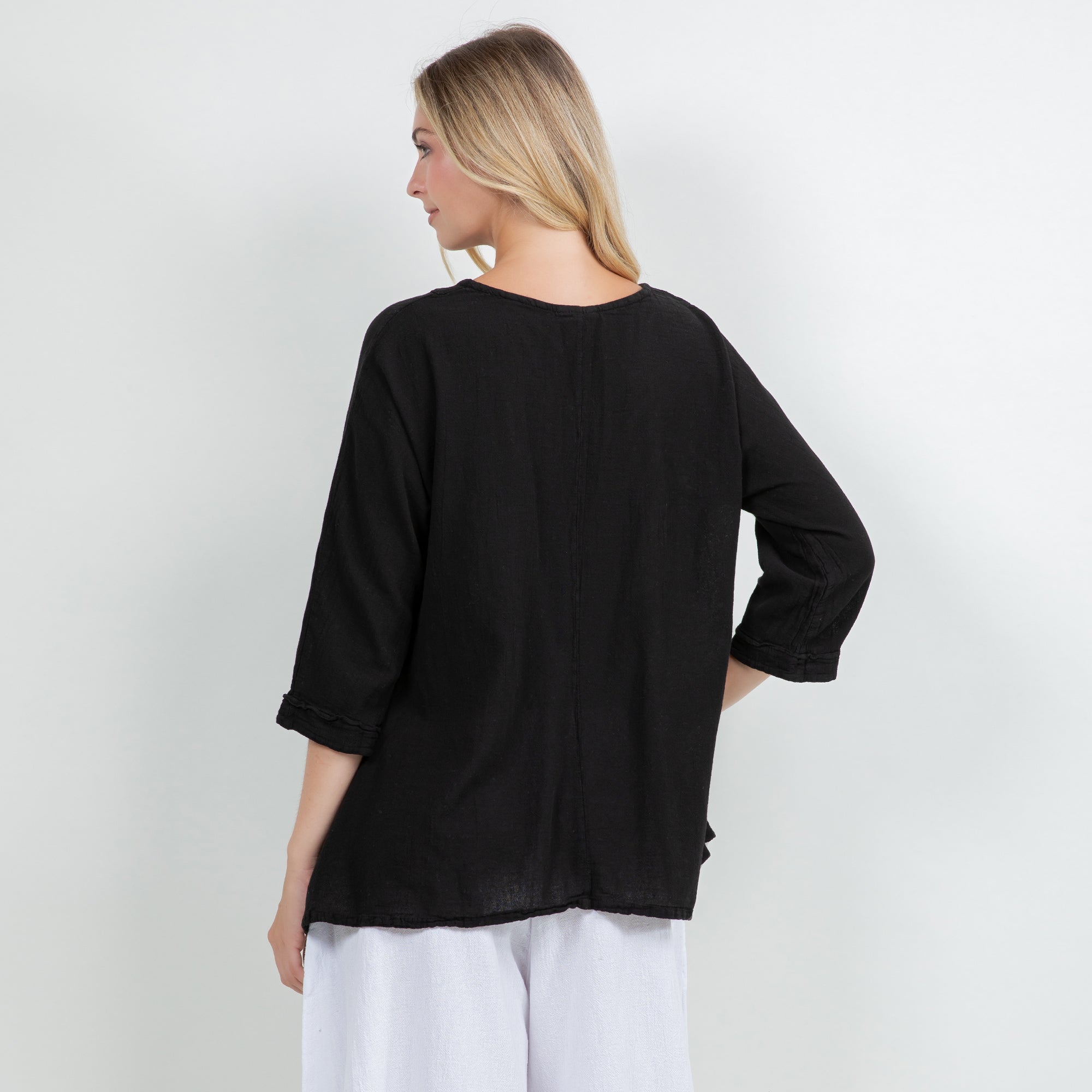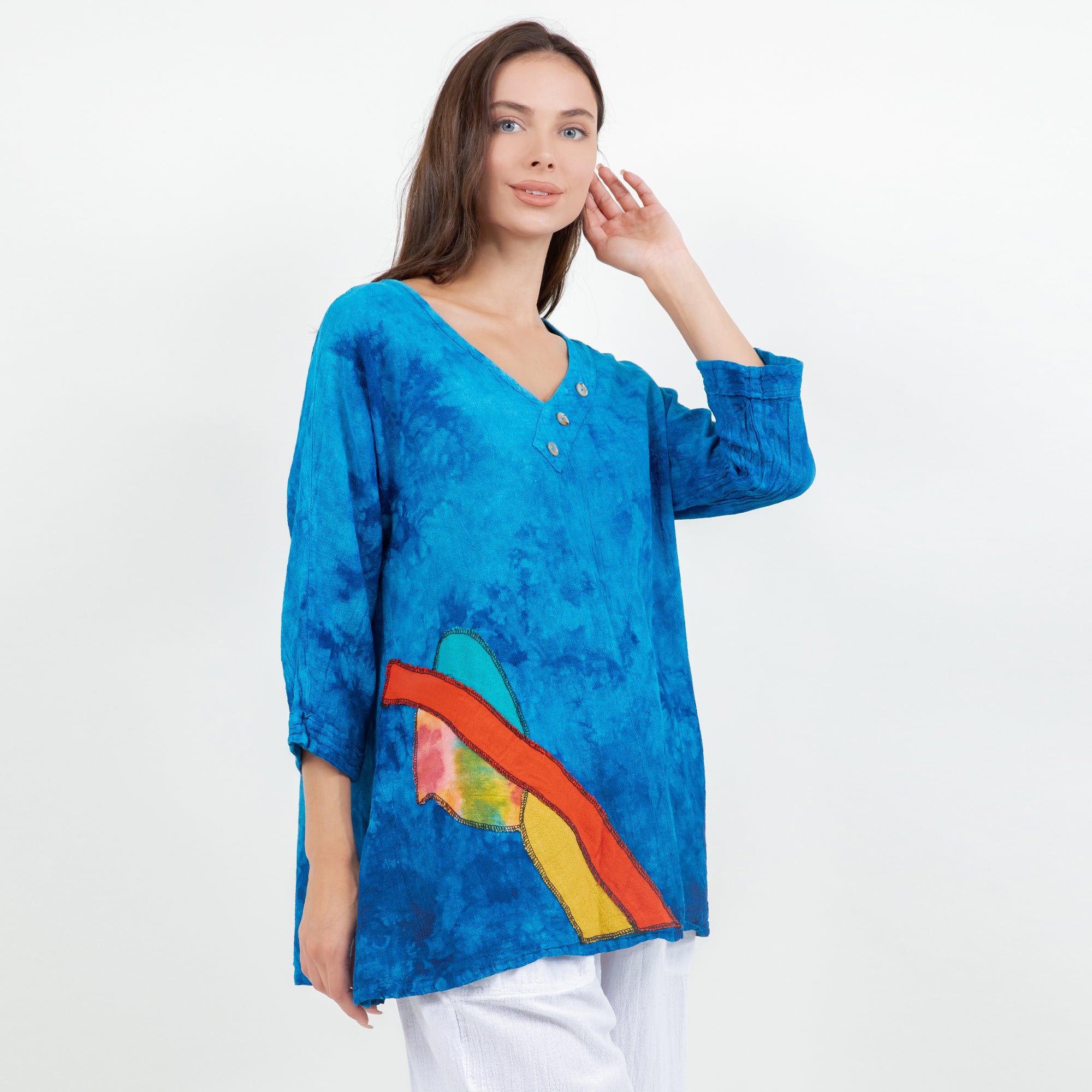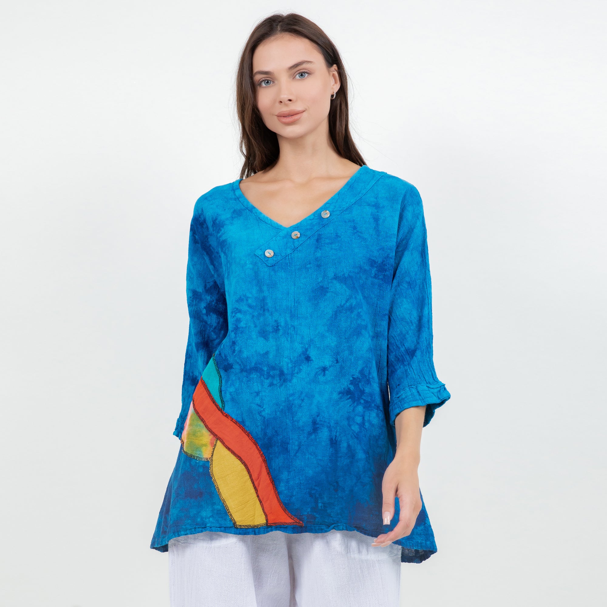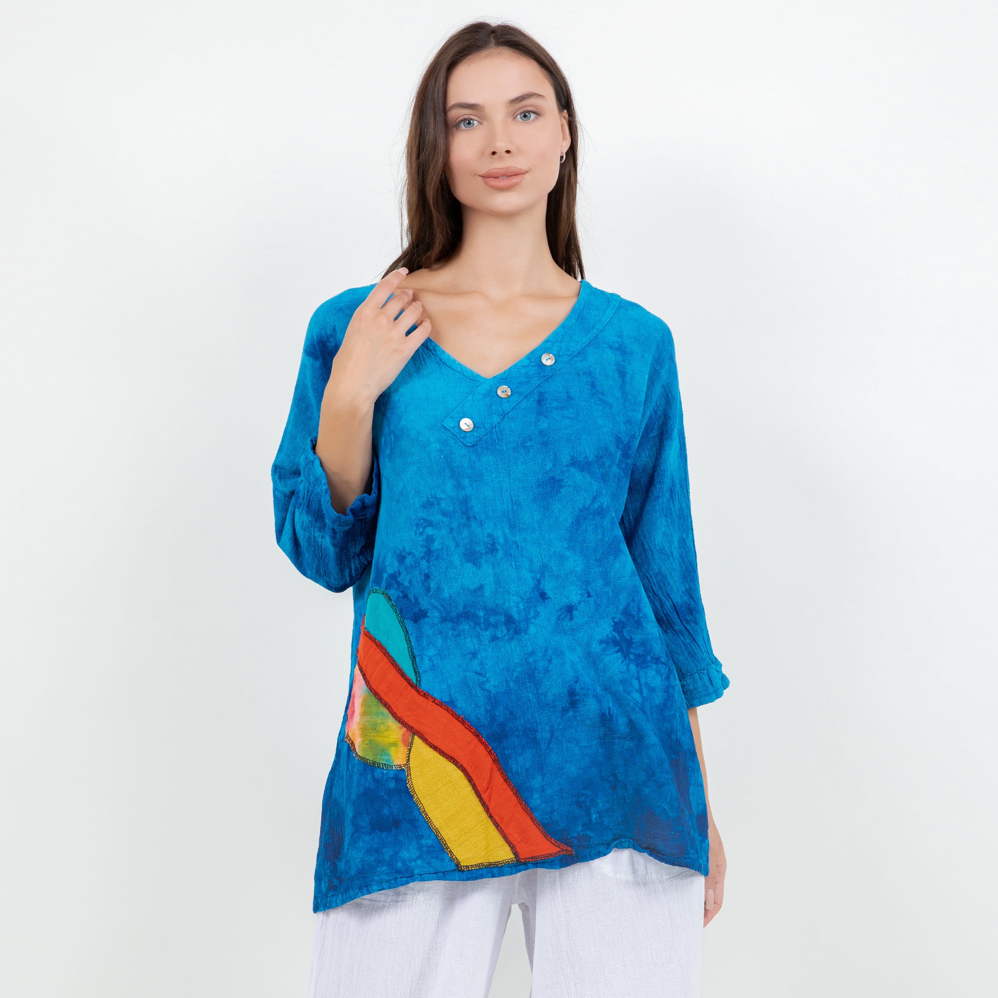 Lucia is a beautiful v-neck top with fun flowy sleeves and a shell button detail at the neckline, it features a hand painted colorful applique on the front.
