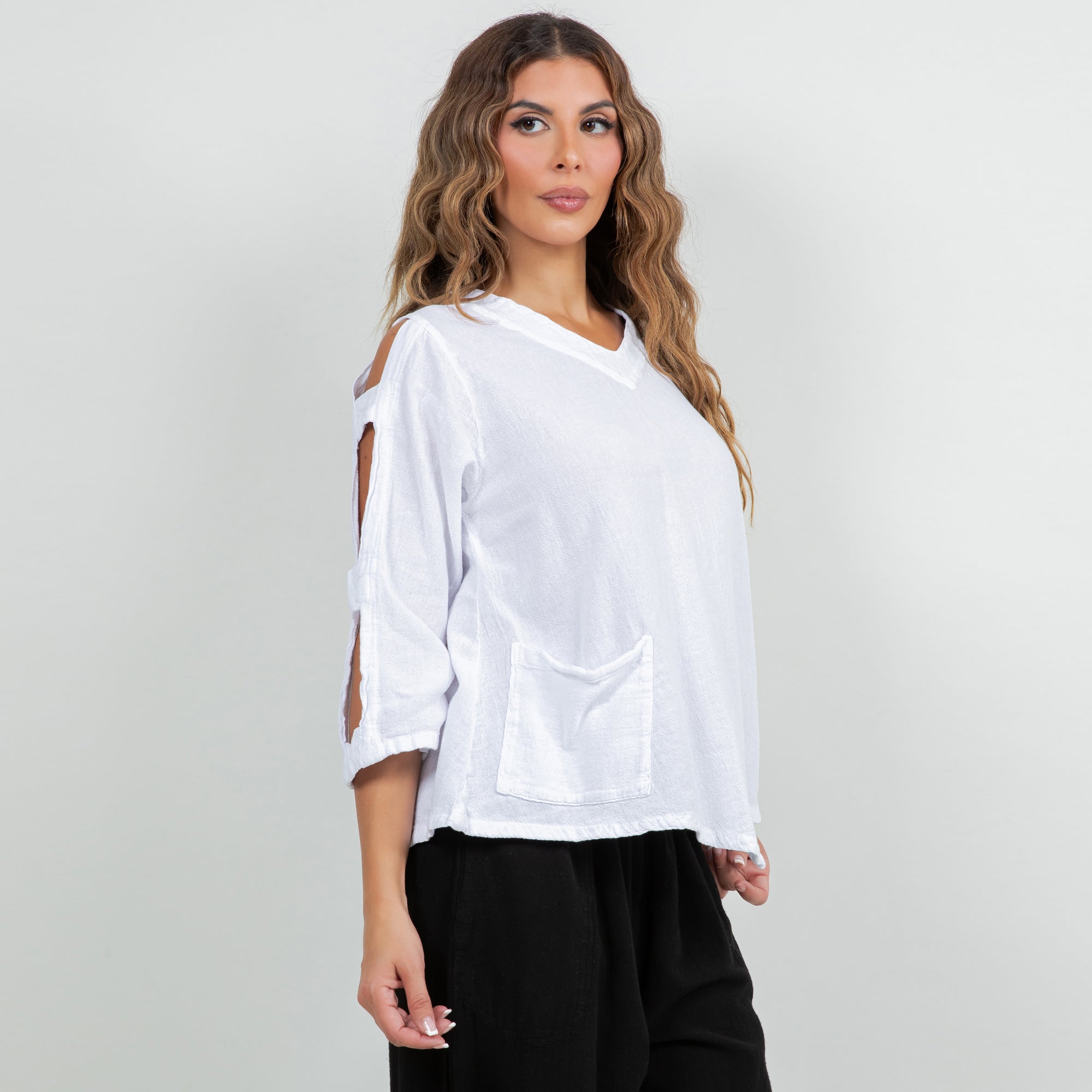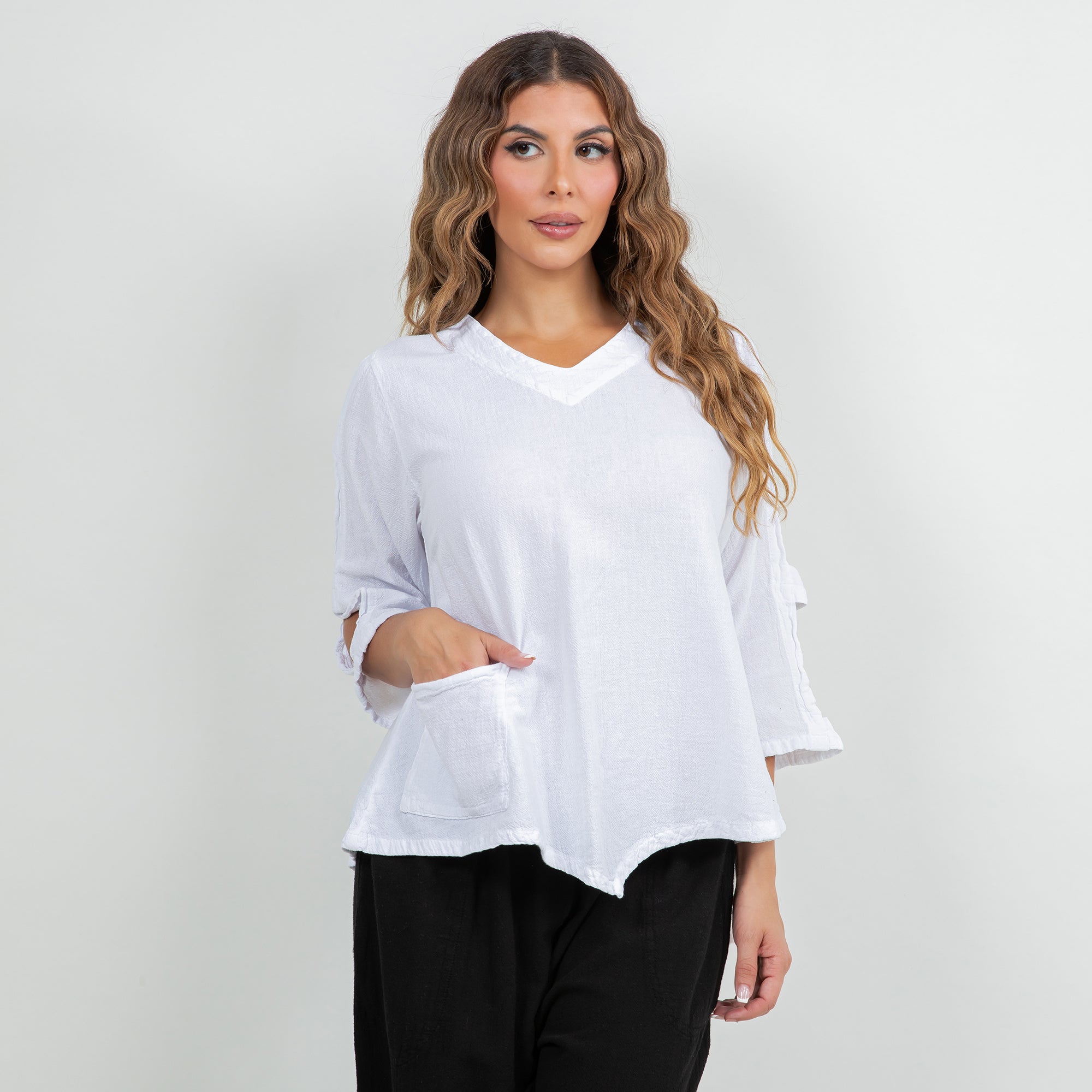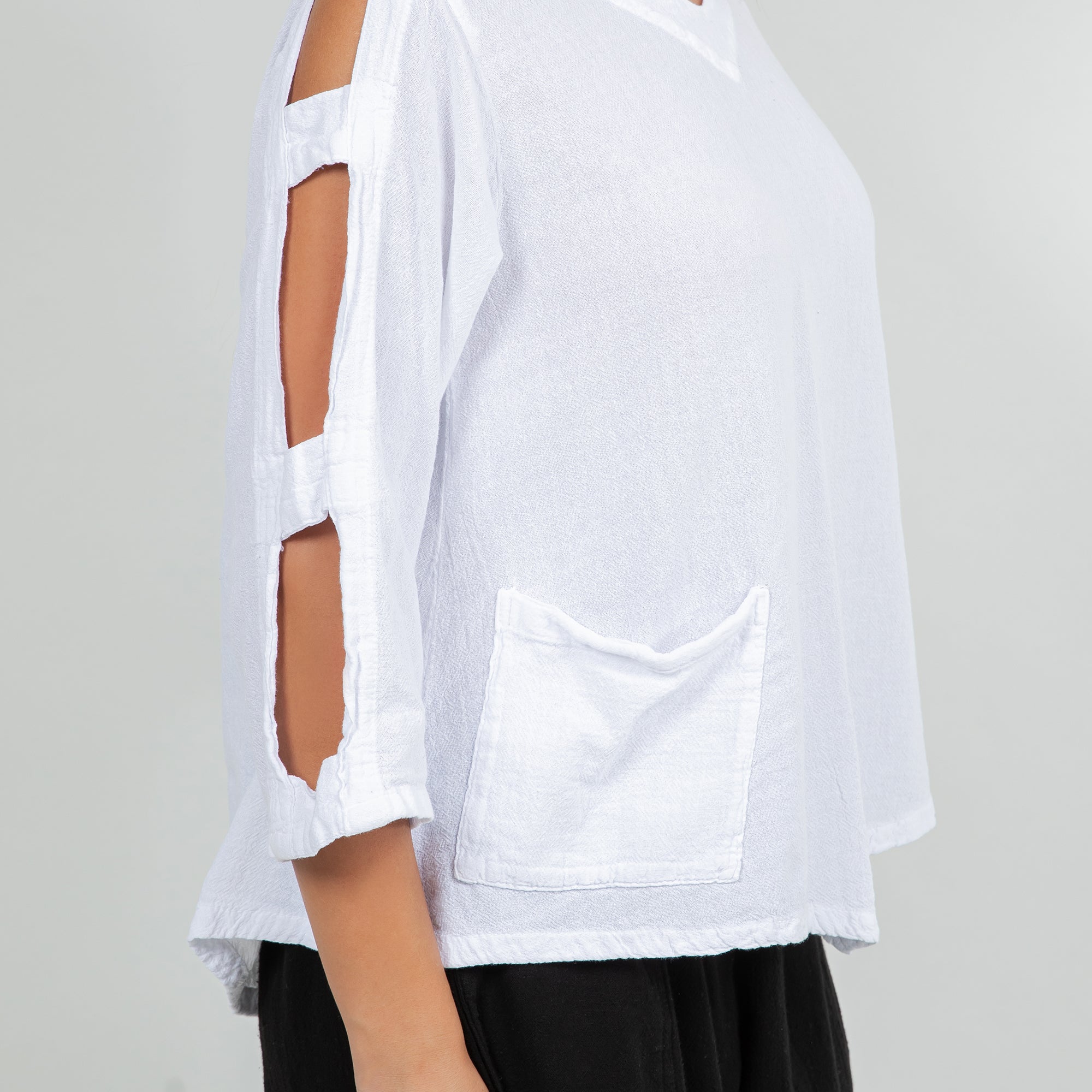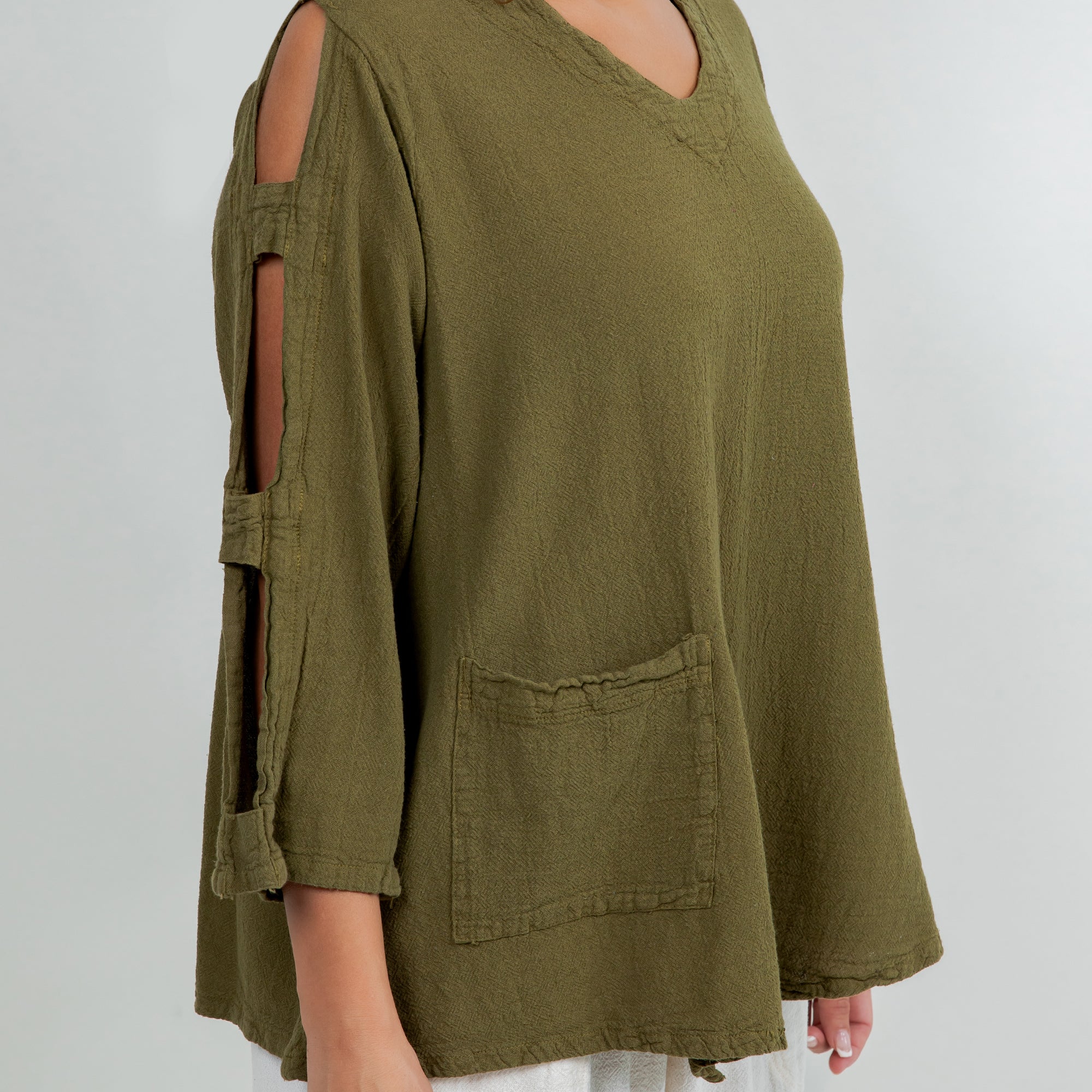 Melanie is a fabulous v point top, with a fun singular pocket, and lattice style sleeves.