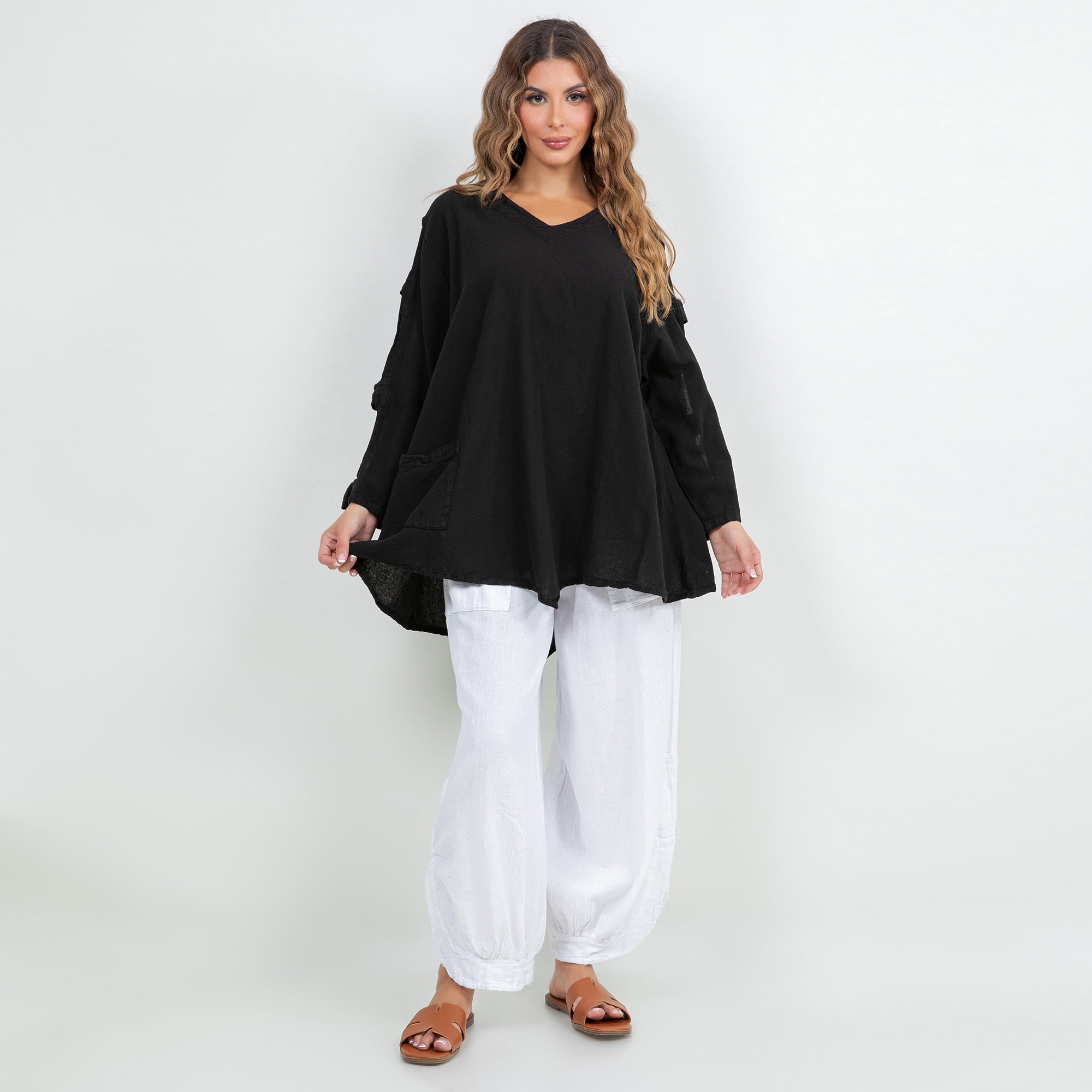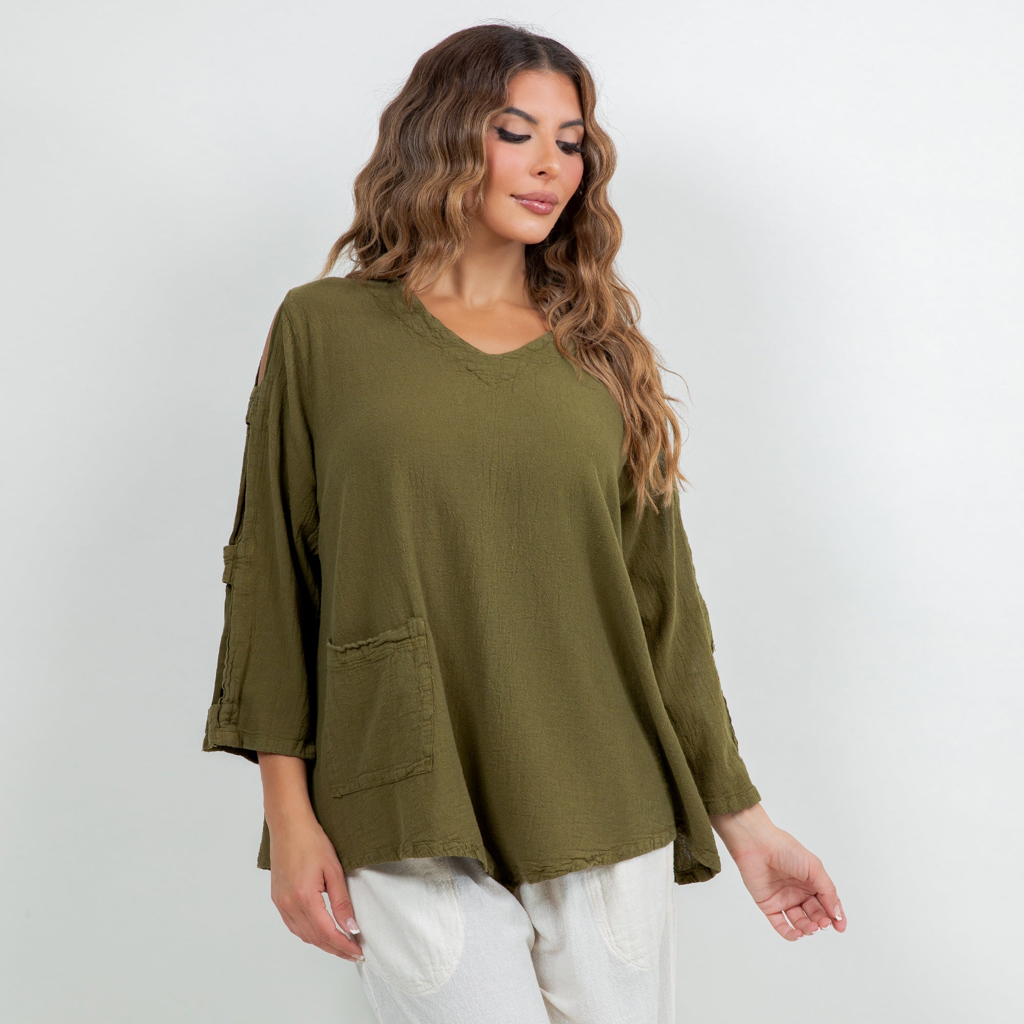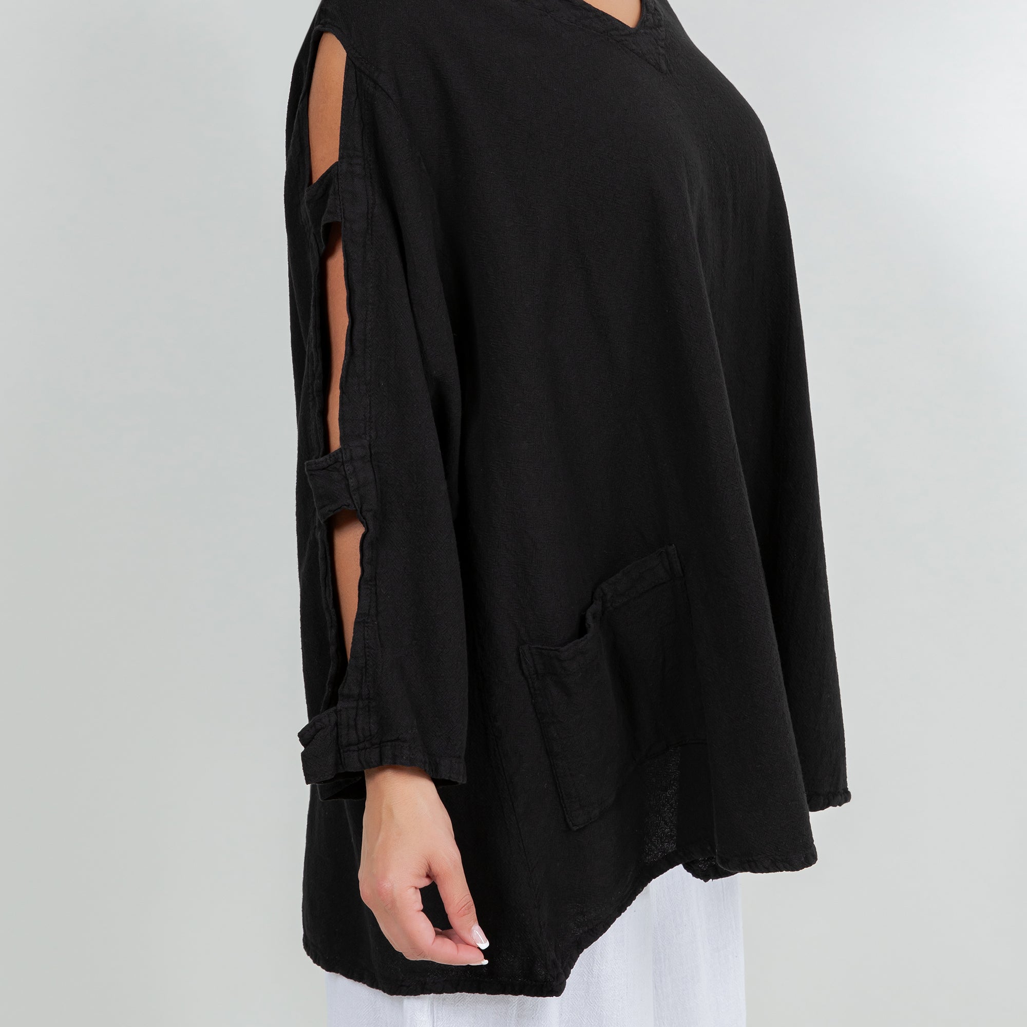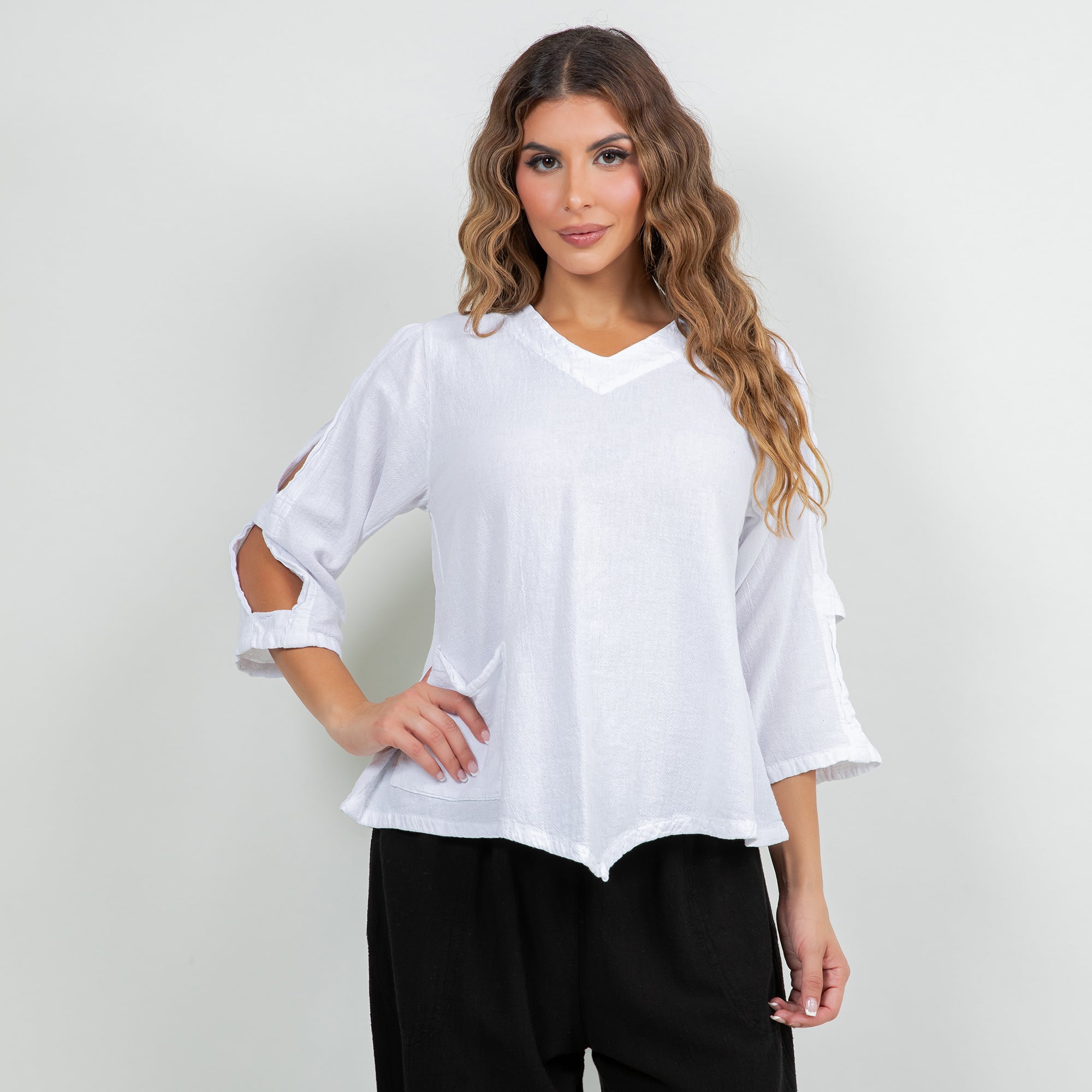 Melanie is a fabulous v point top, with a fun singular pocket, and lattice style sleeves.