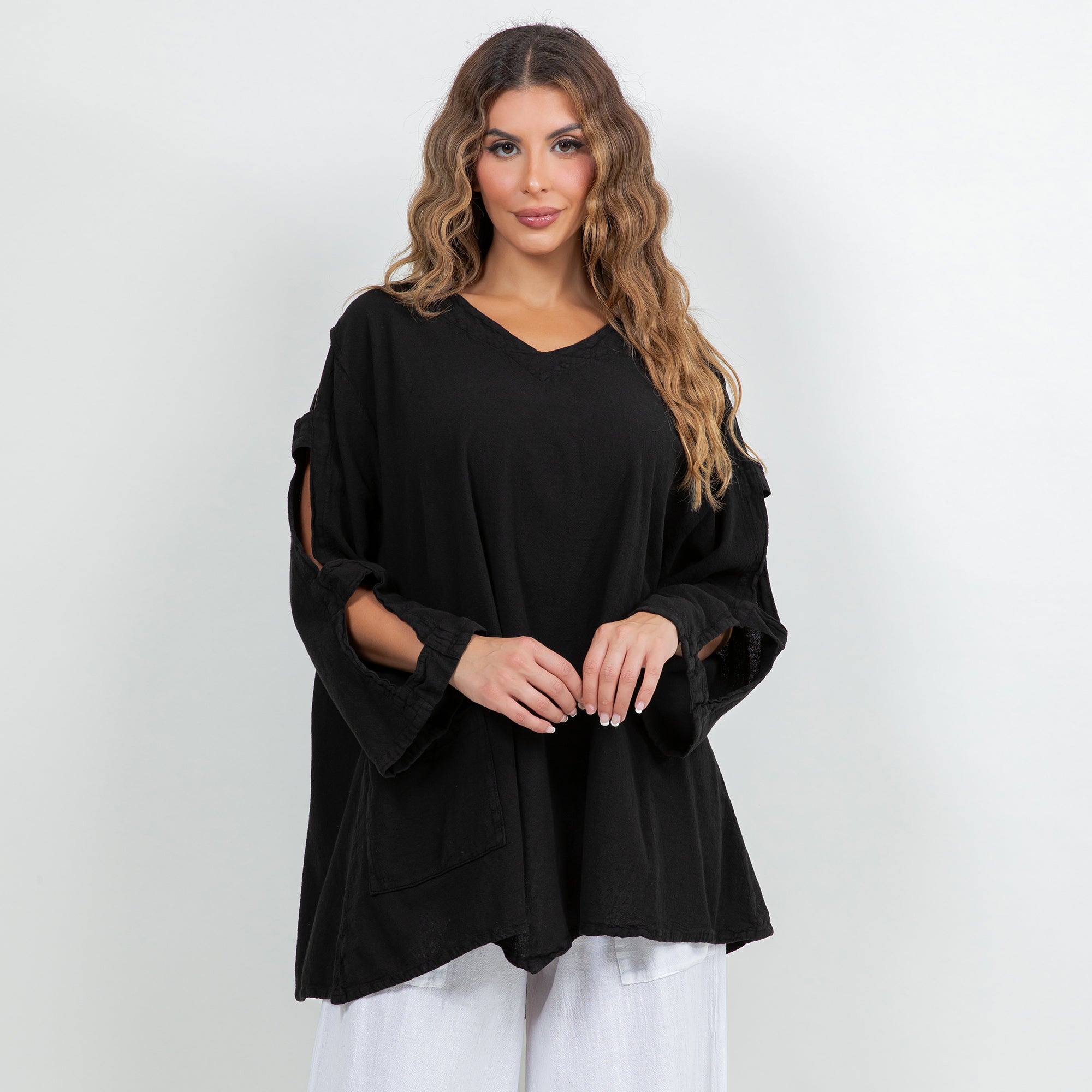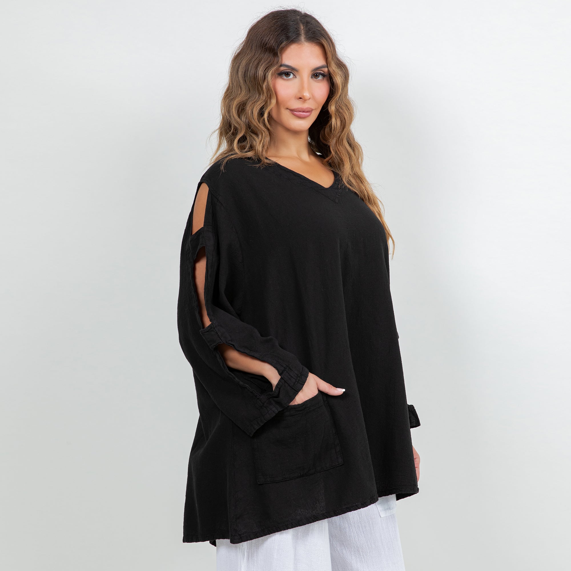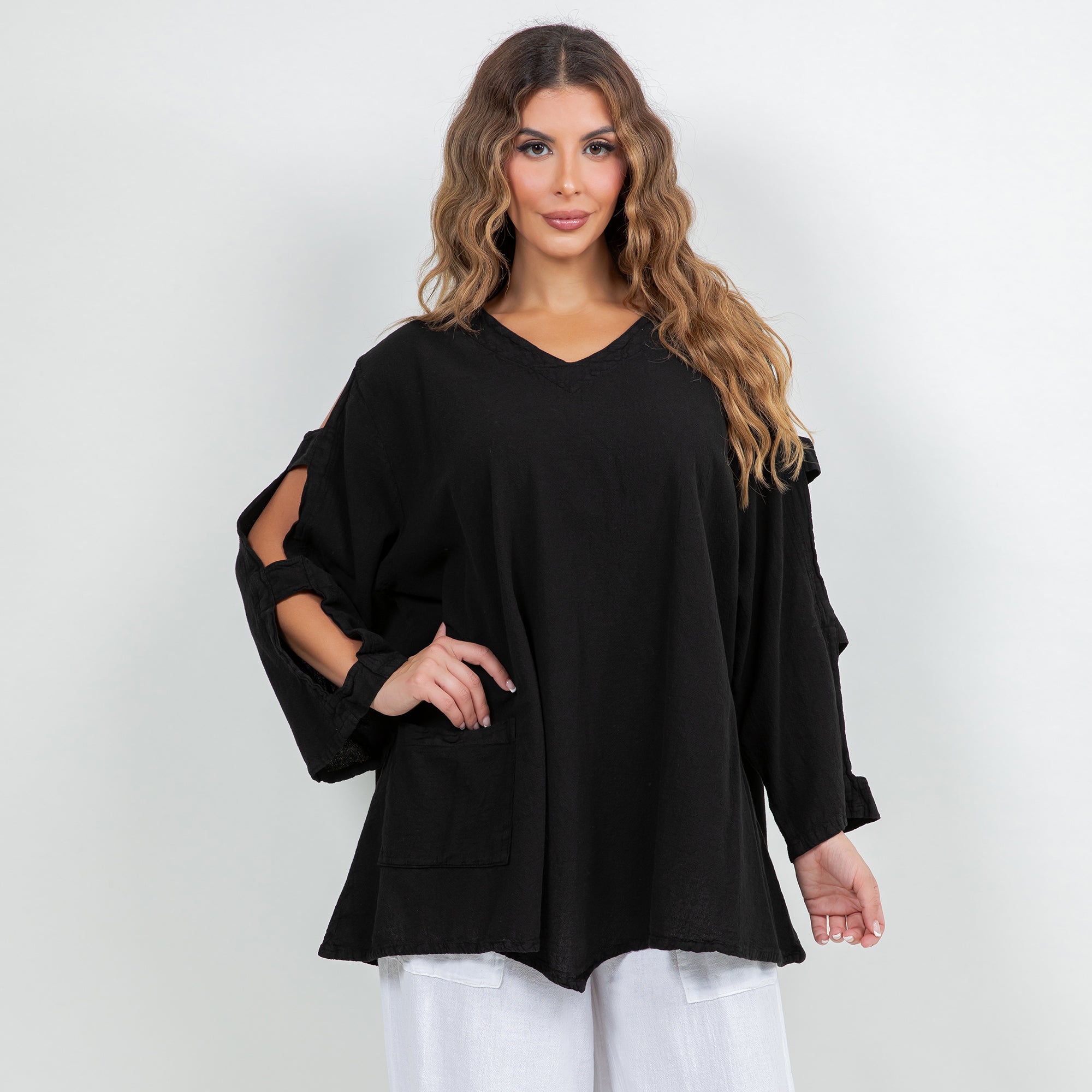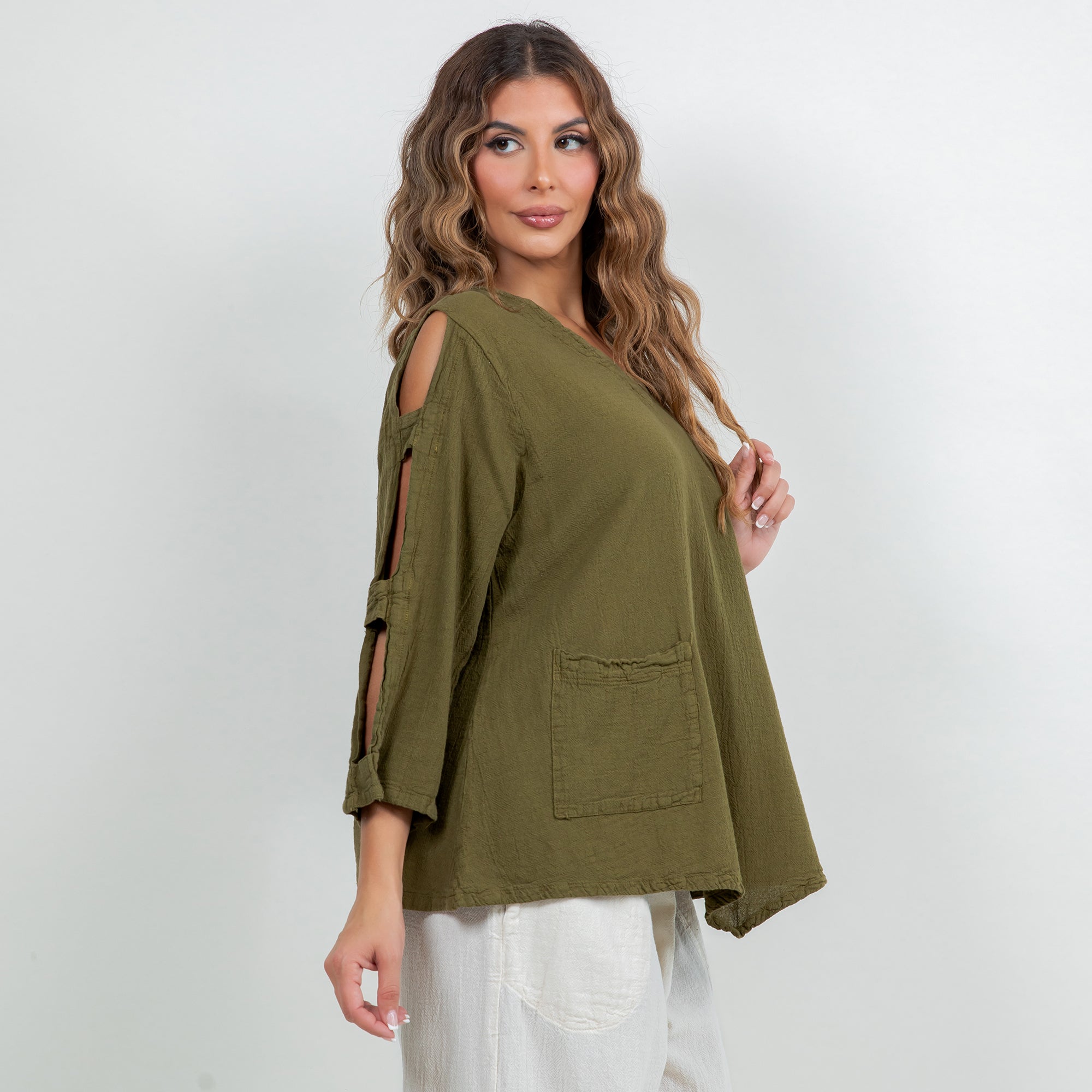 Melanie is a fabulous v point top, with a fun singular pocket, and lattice style sleeves.
