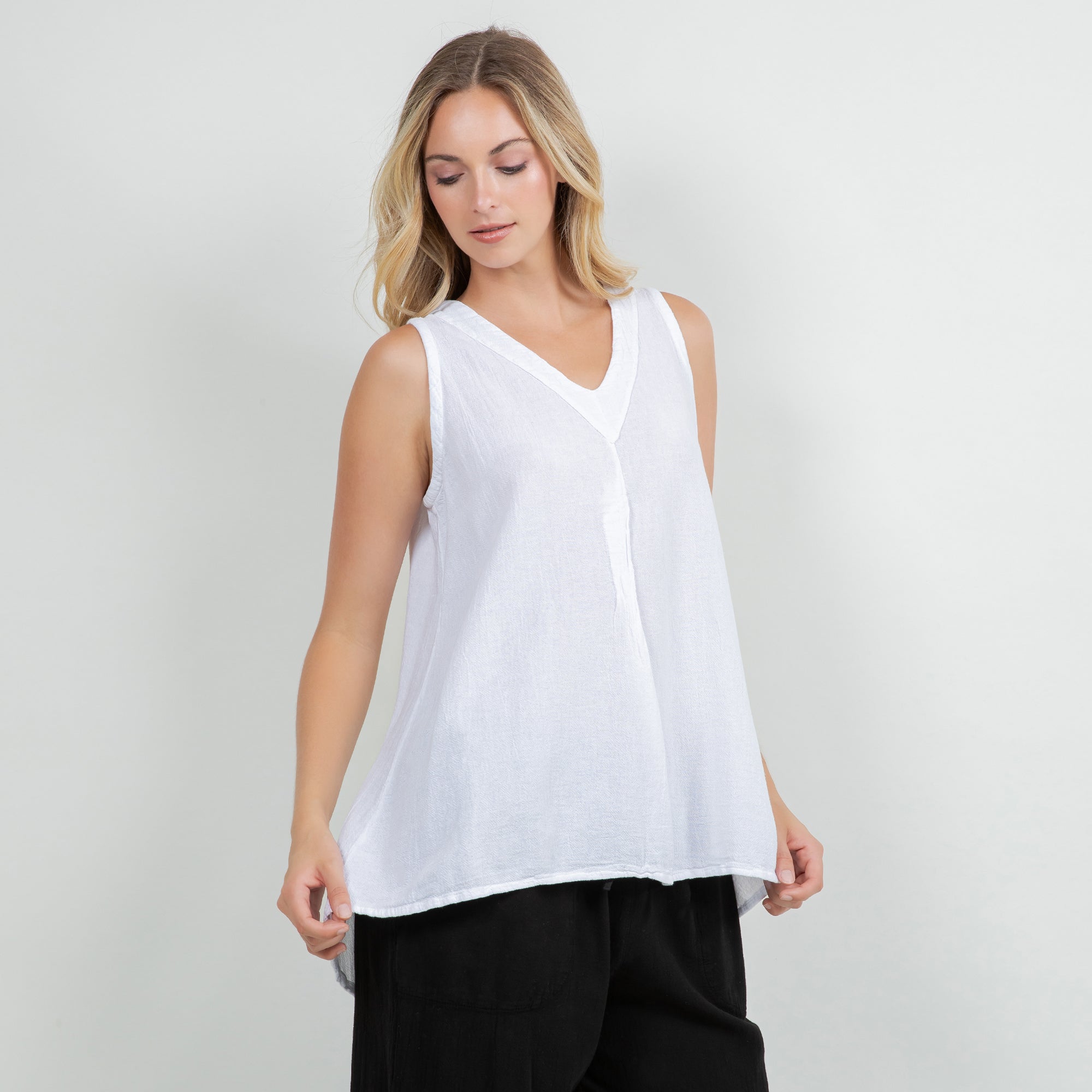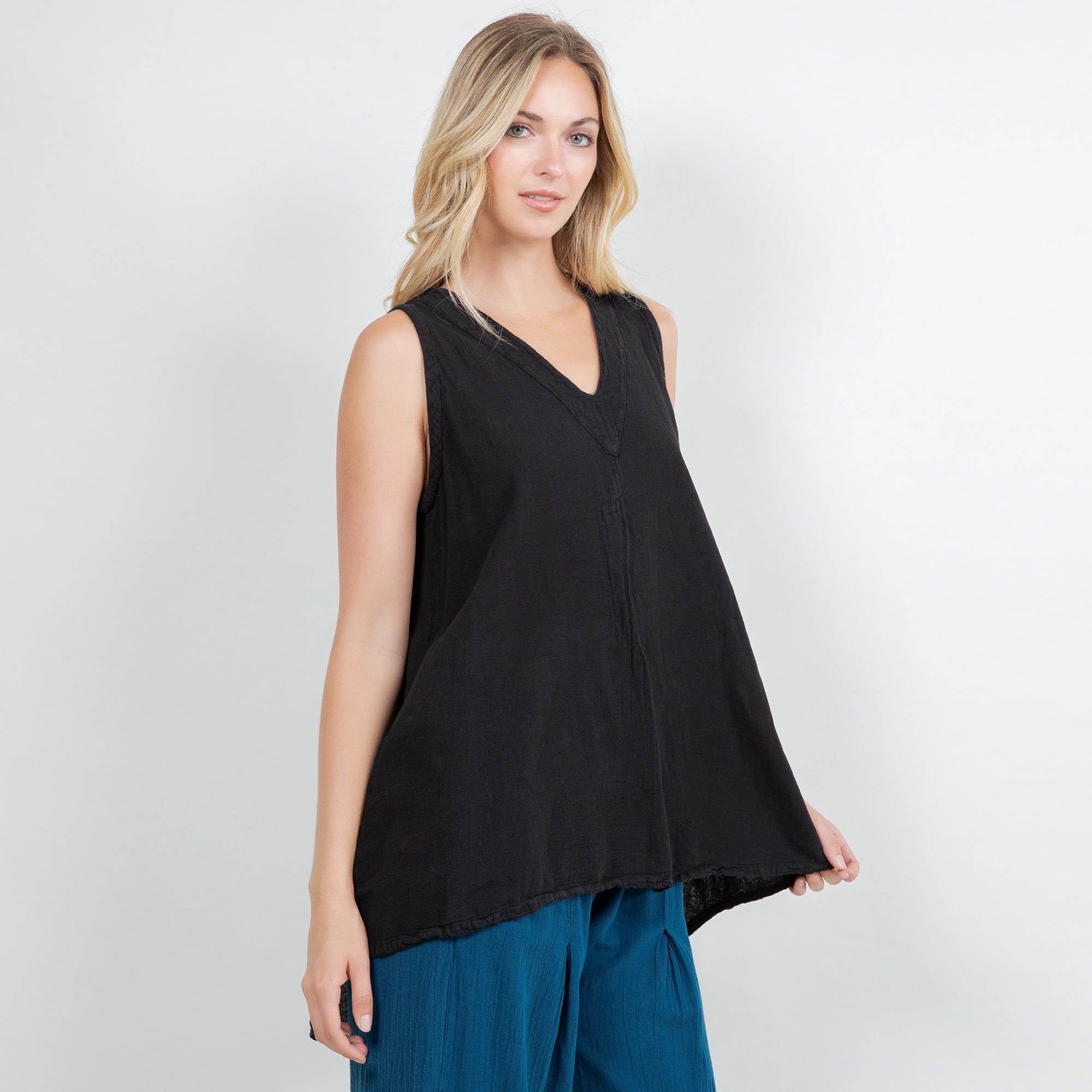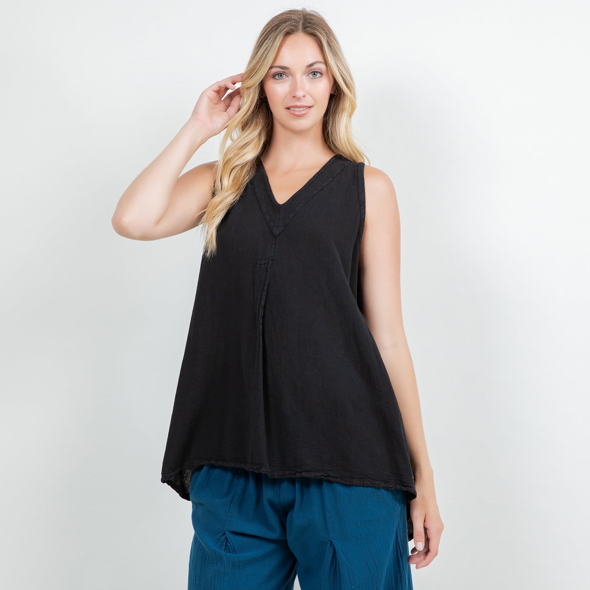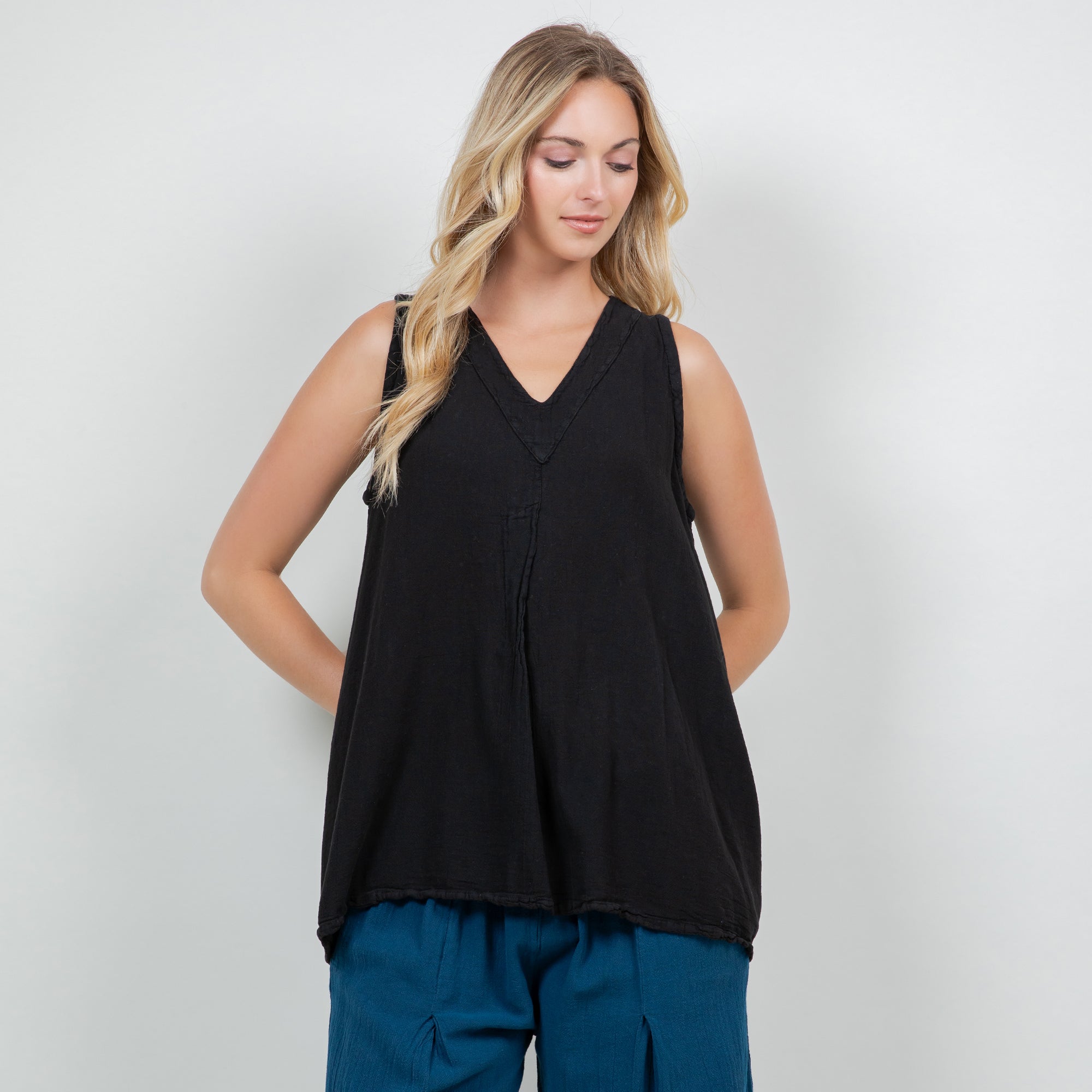 Our tunic tank top style with a fun pleating detail creating a swingy and flowing silhouette.