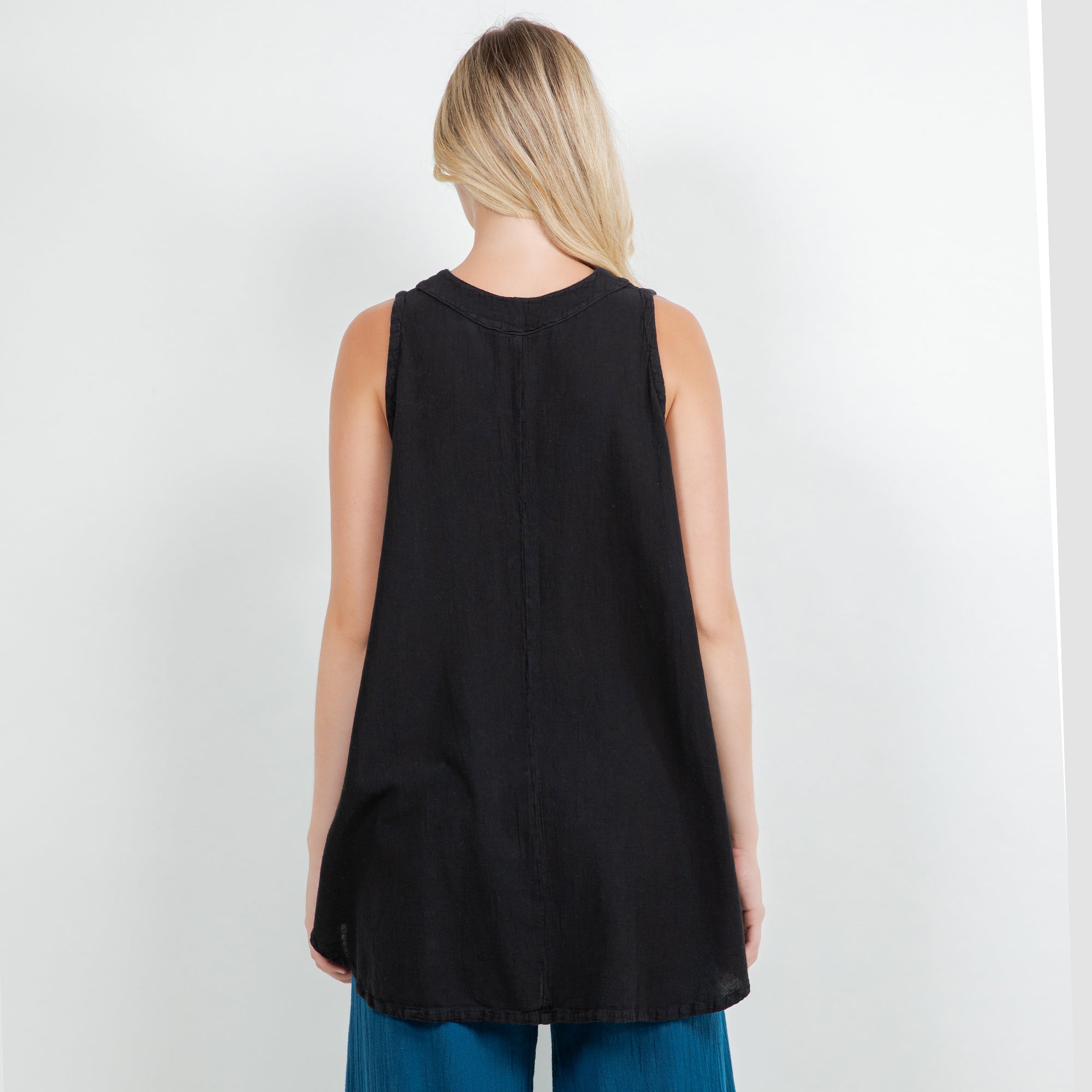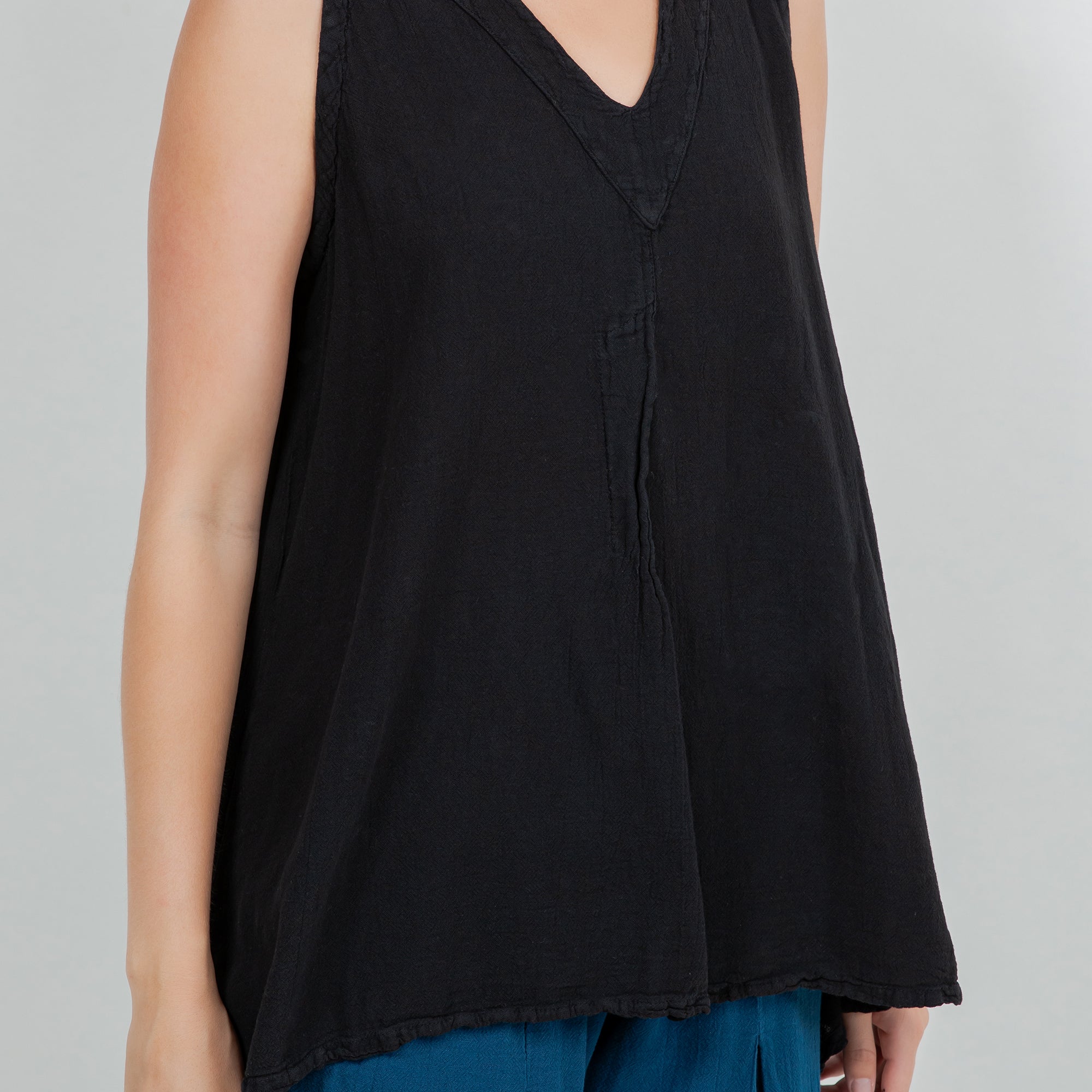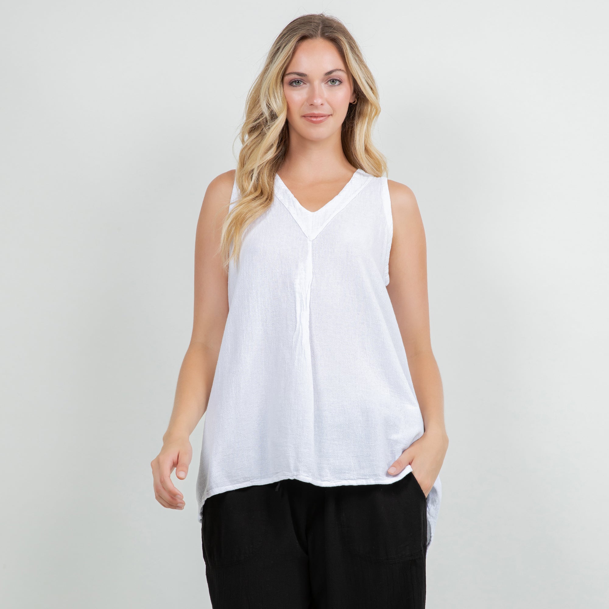 Our tunic tank top style with a fun pleating detail creating a swingy and flowing silhouette.