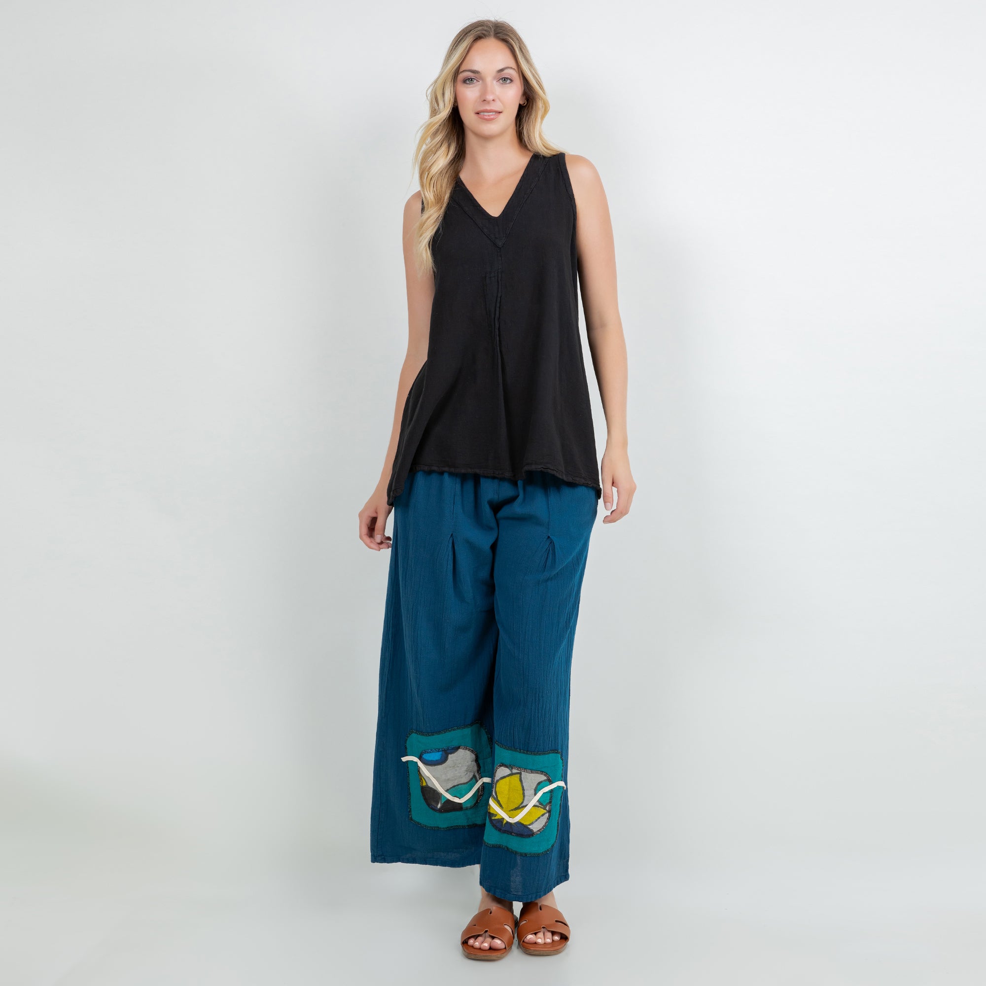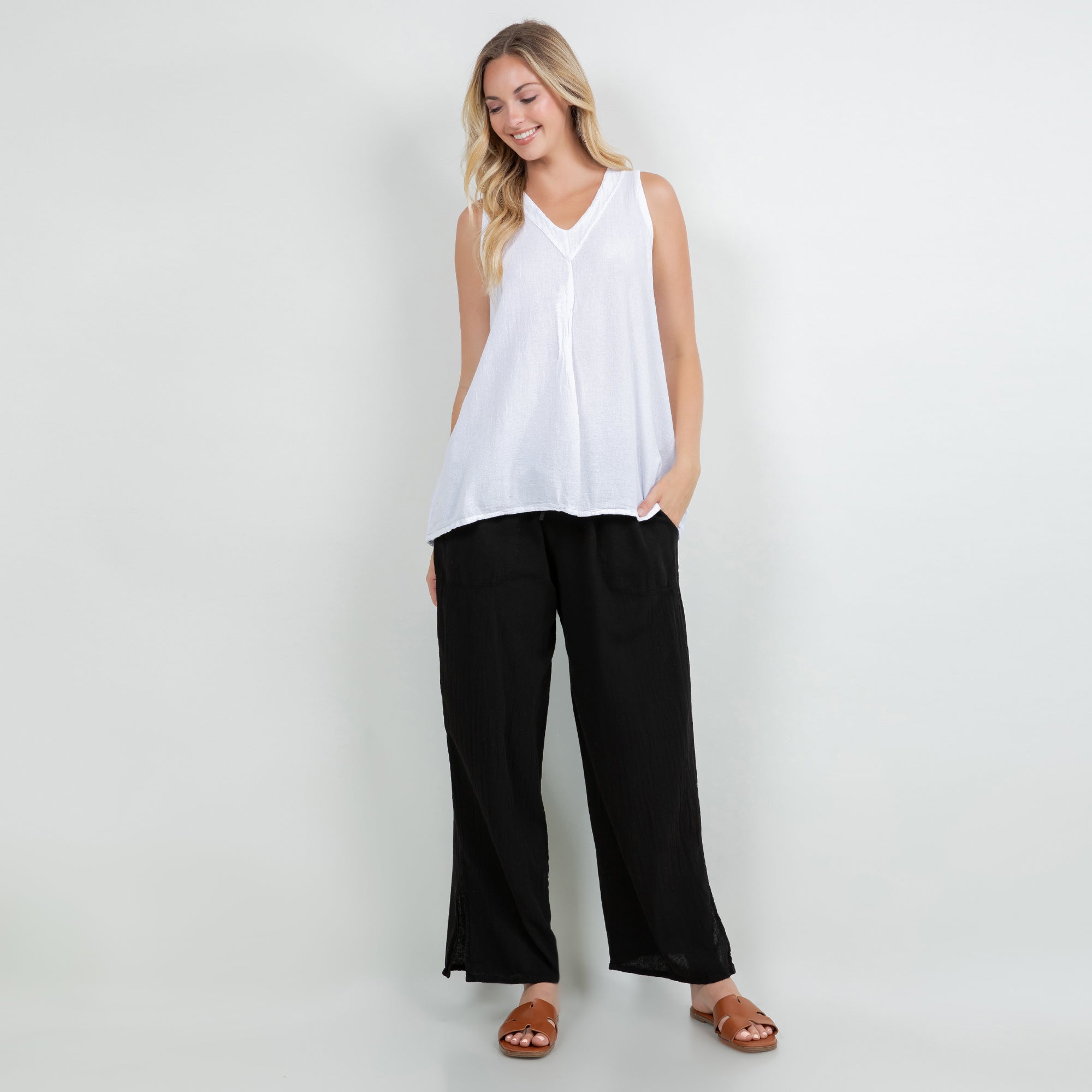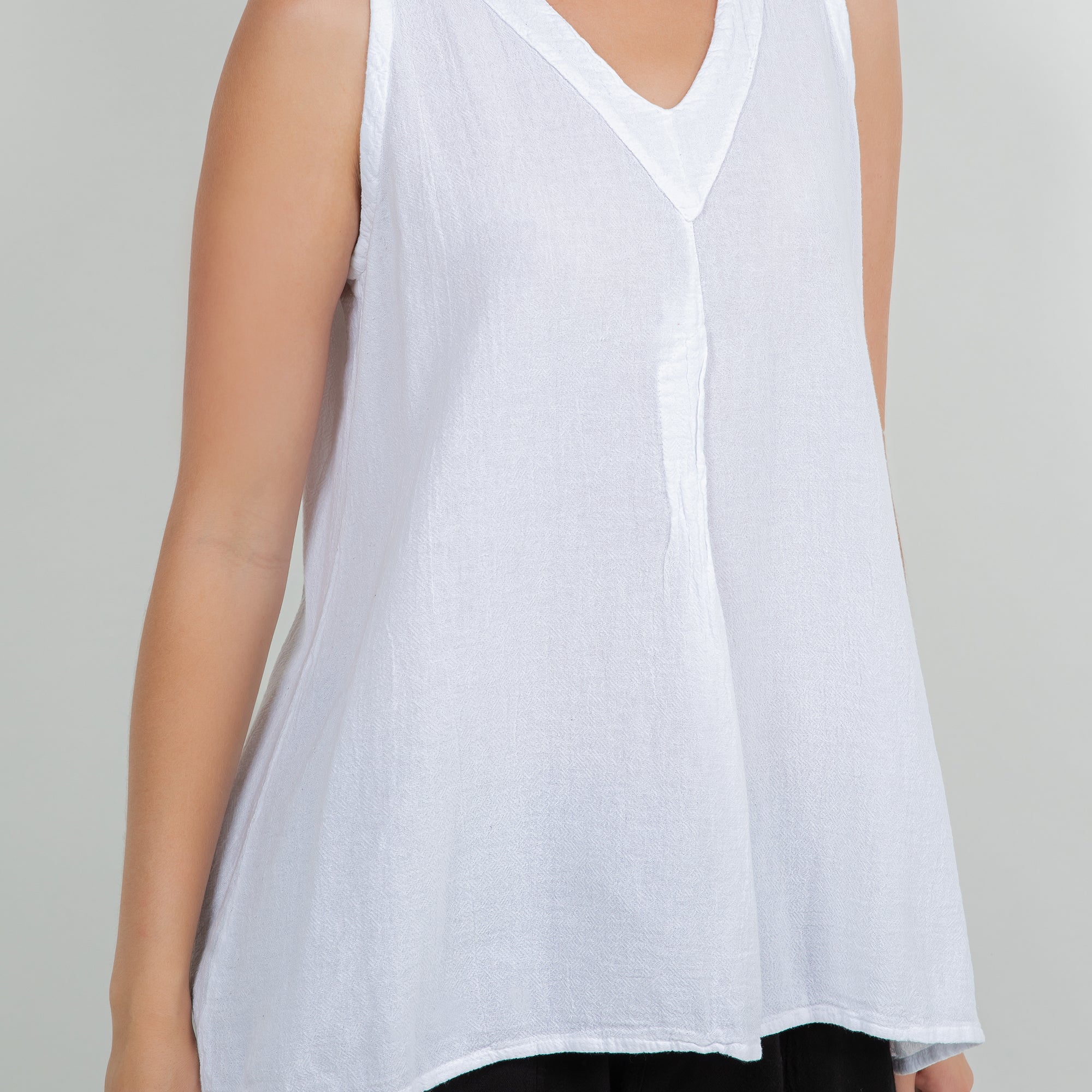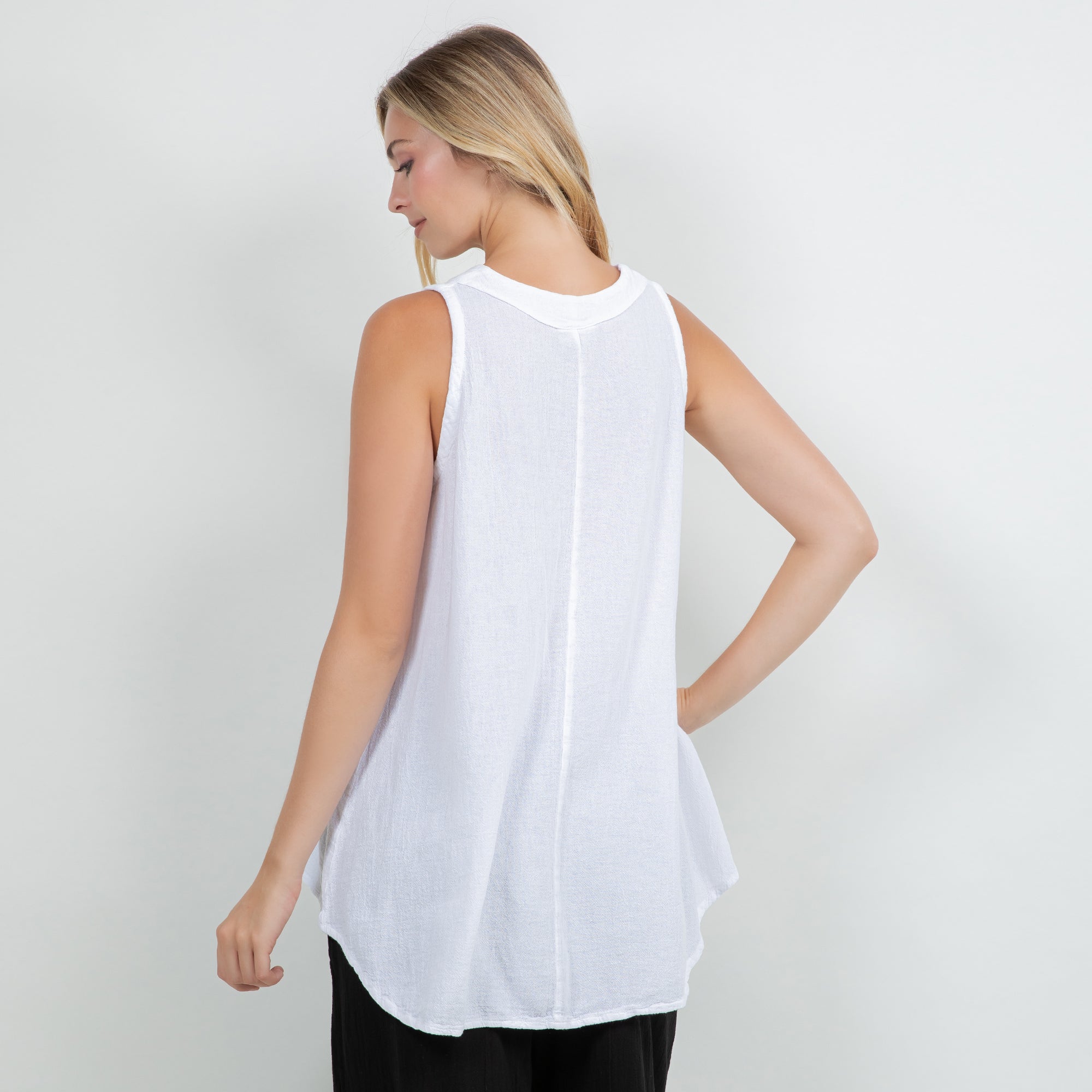 Our tunic tank top style with a fun pleating detail creating a swingy and flowing silhouette.