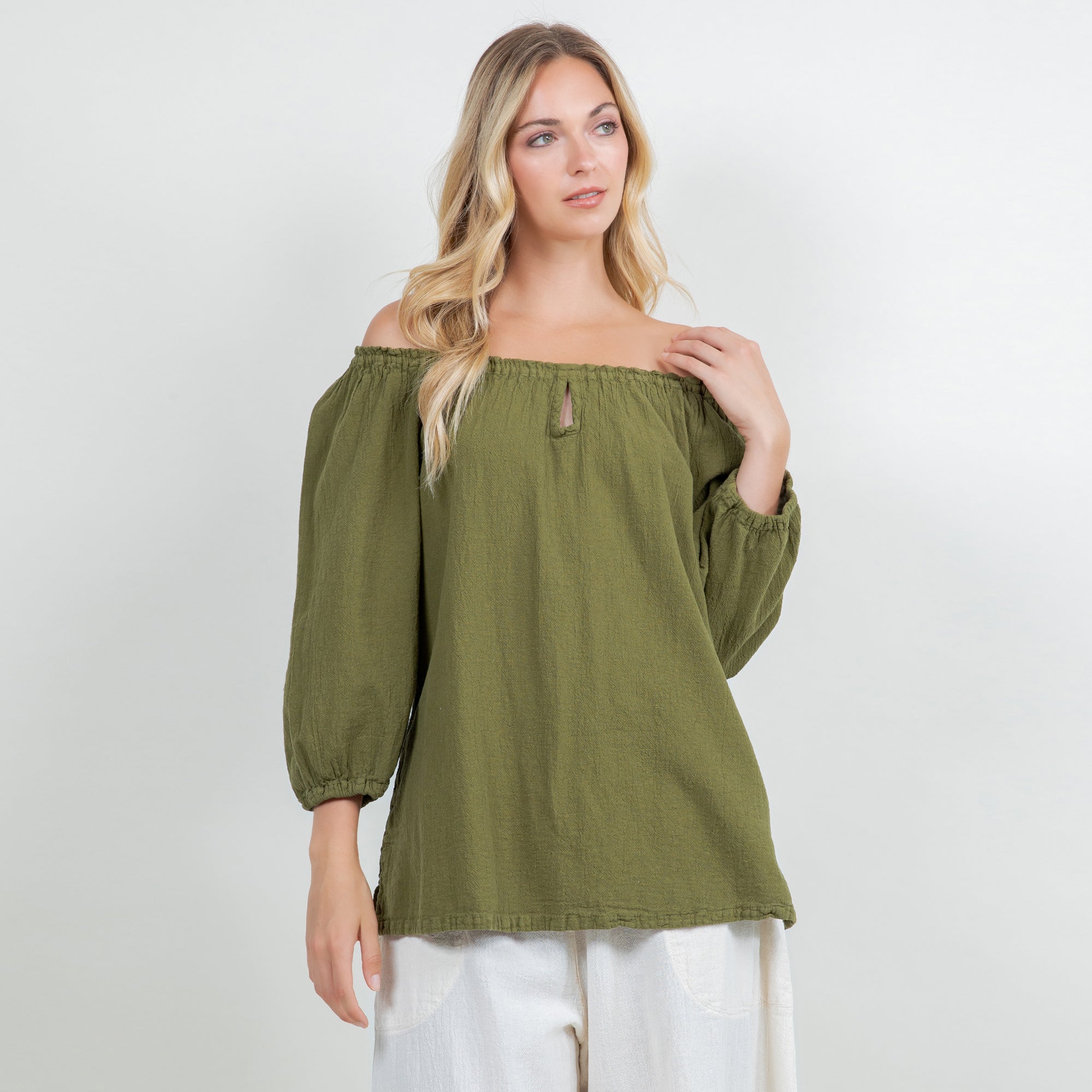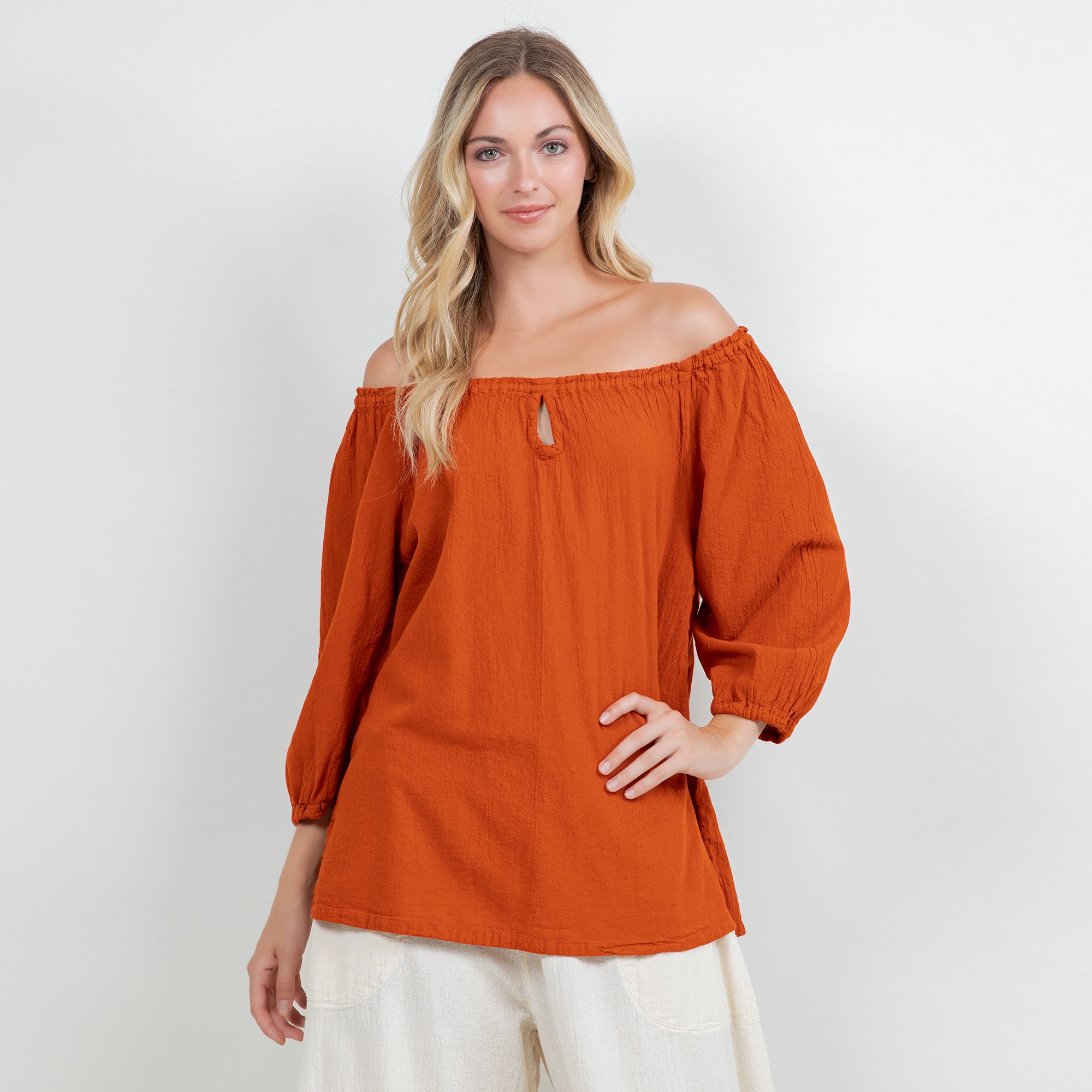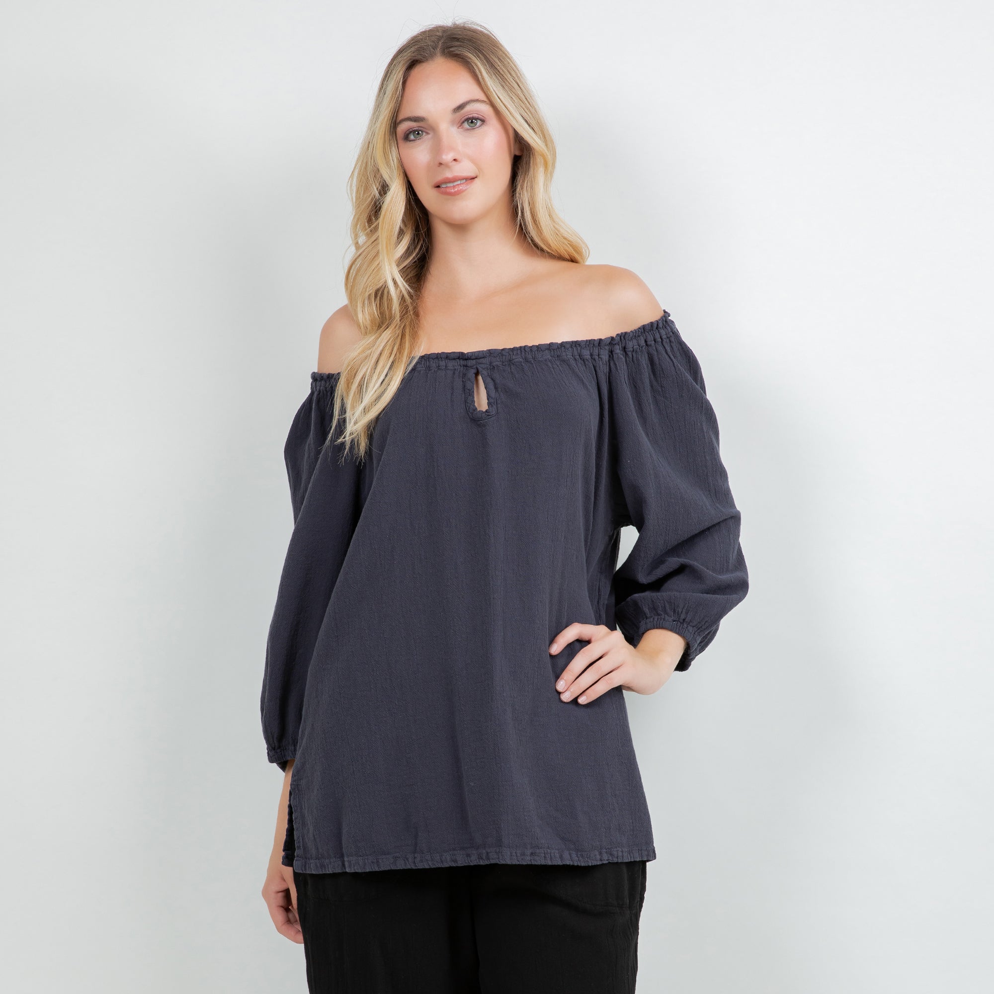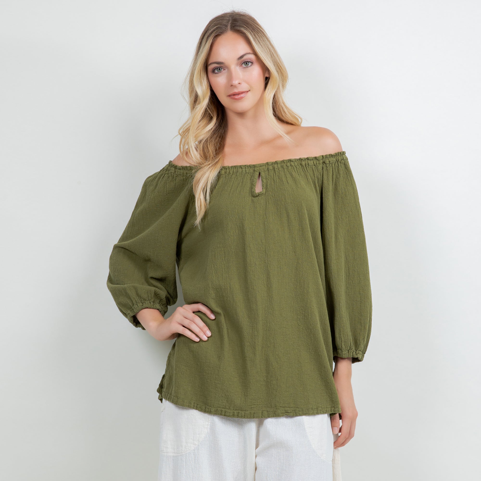The Presley Top flatters everyone! A beautiful off the shoulder top. With 3/4 adjustable length elastic sleeves, and a teardrop cutout at the top!