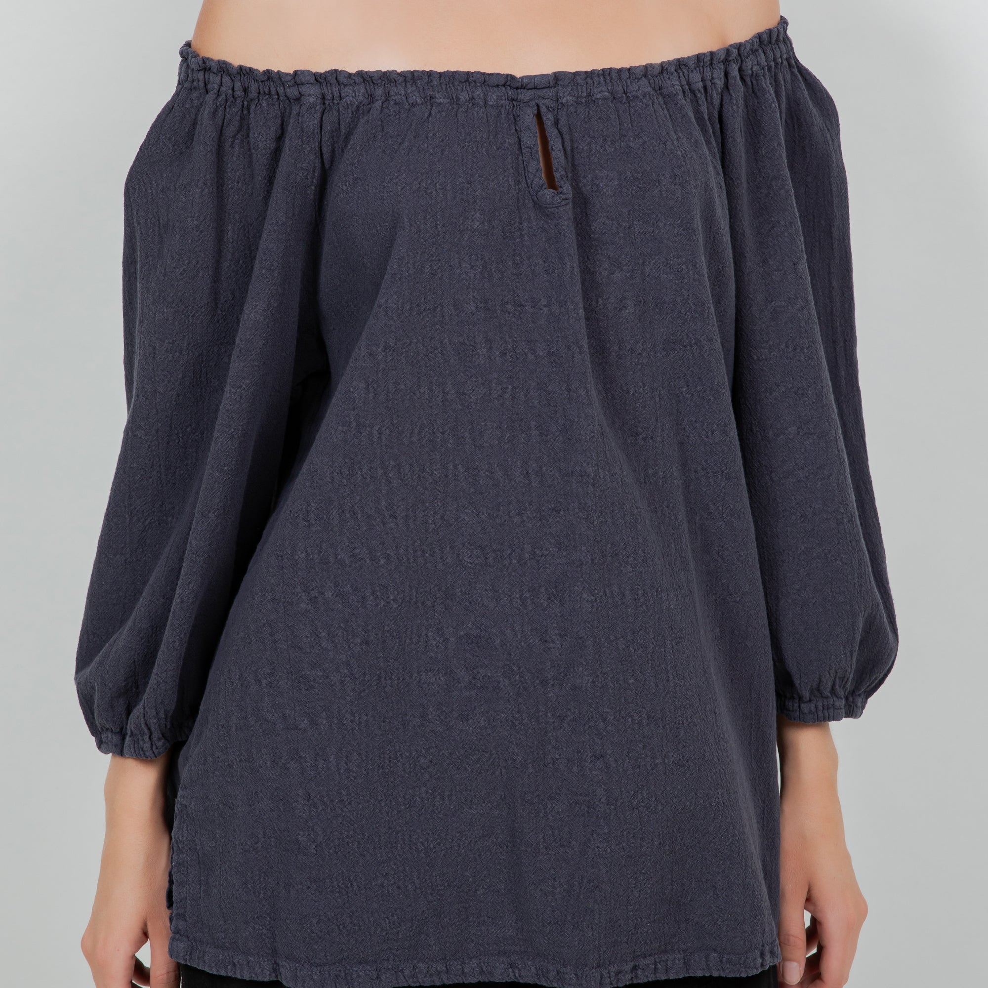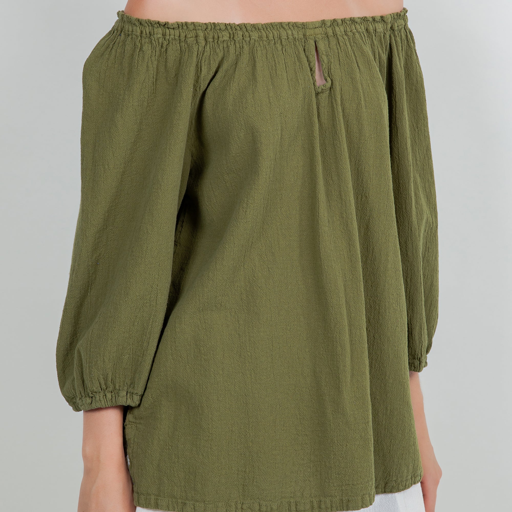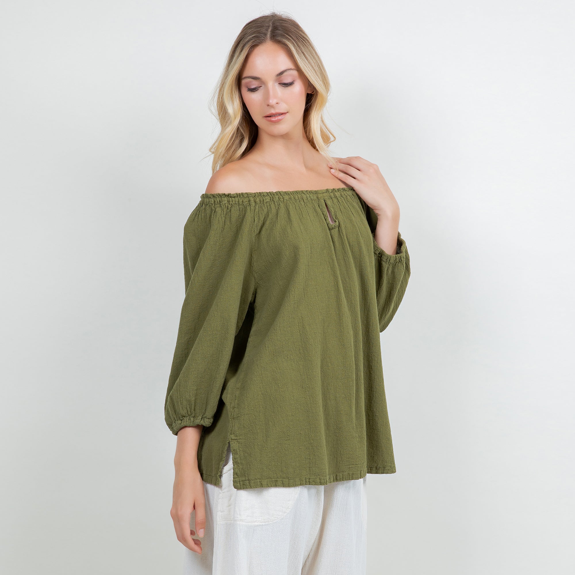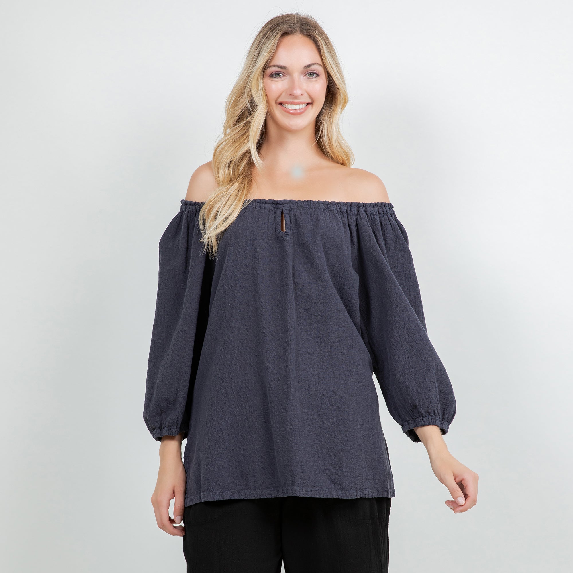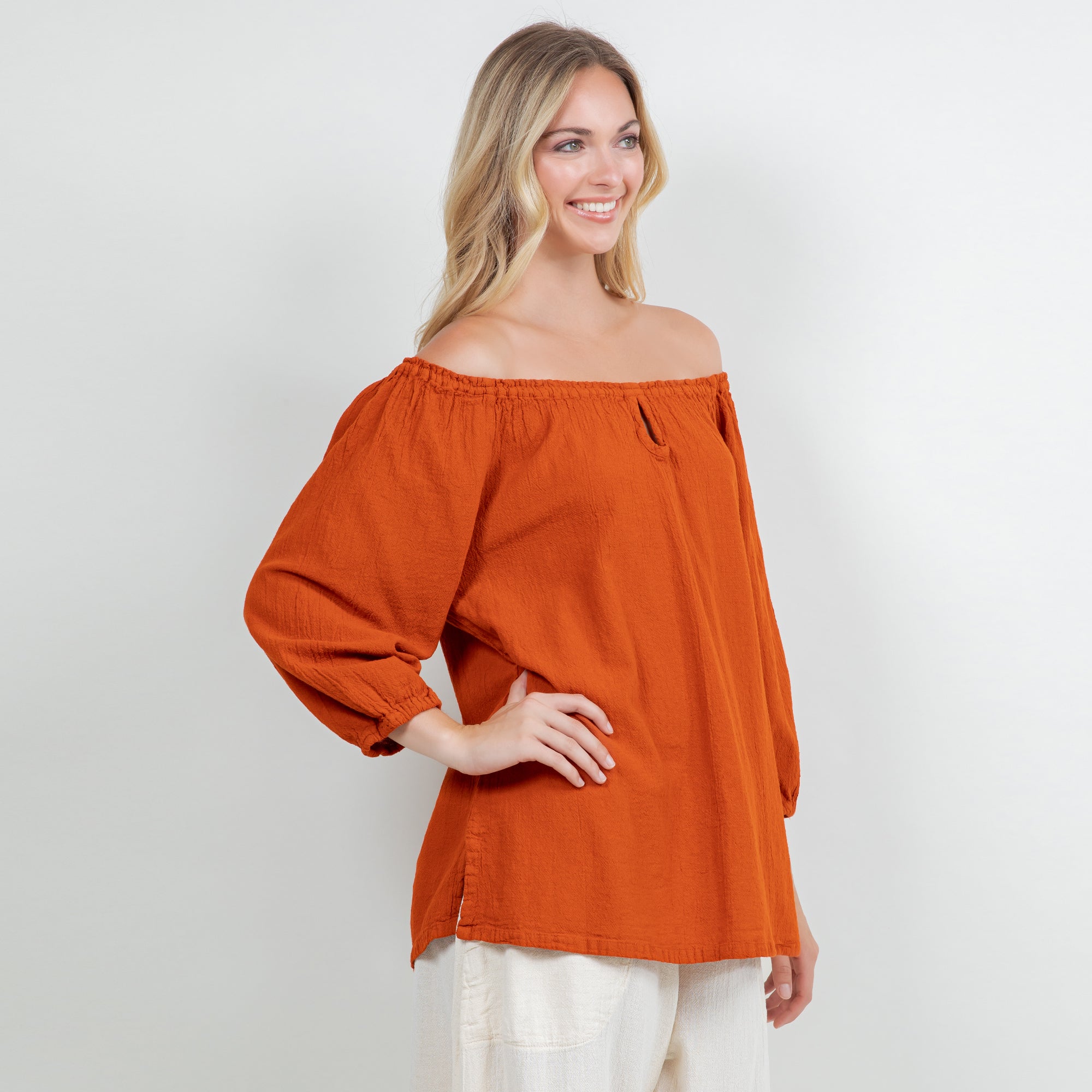 The Presley Top flatters everyone! A beautiful off the shoulder top. With 3/4 adjustable length elastic sleeves, and a teardrop cutout at the top!