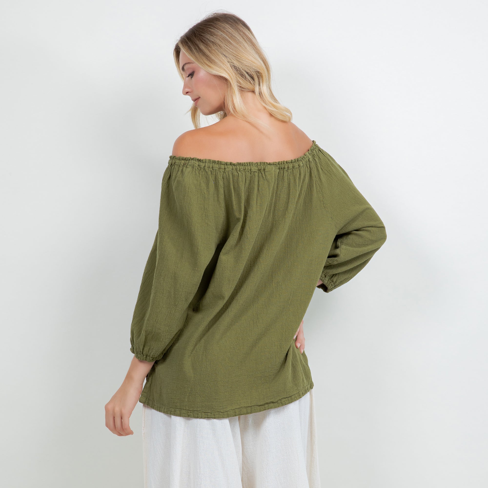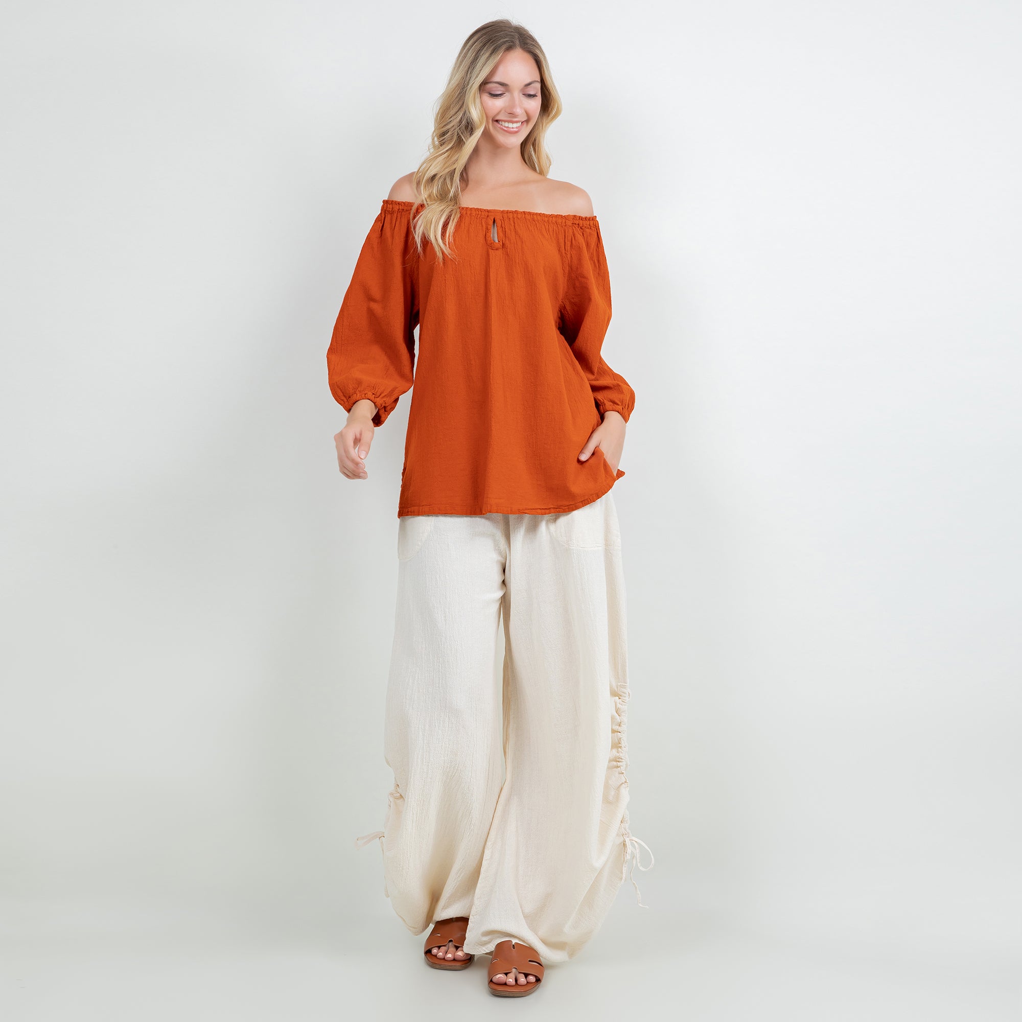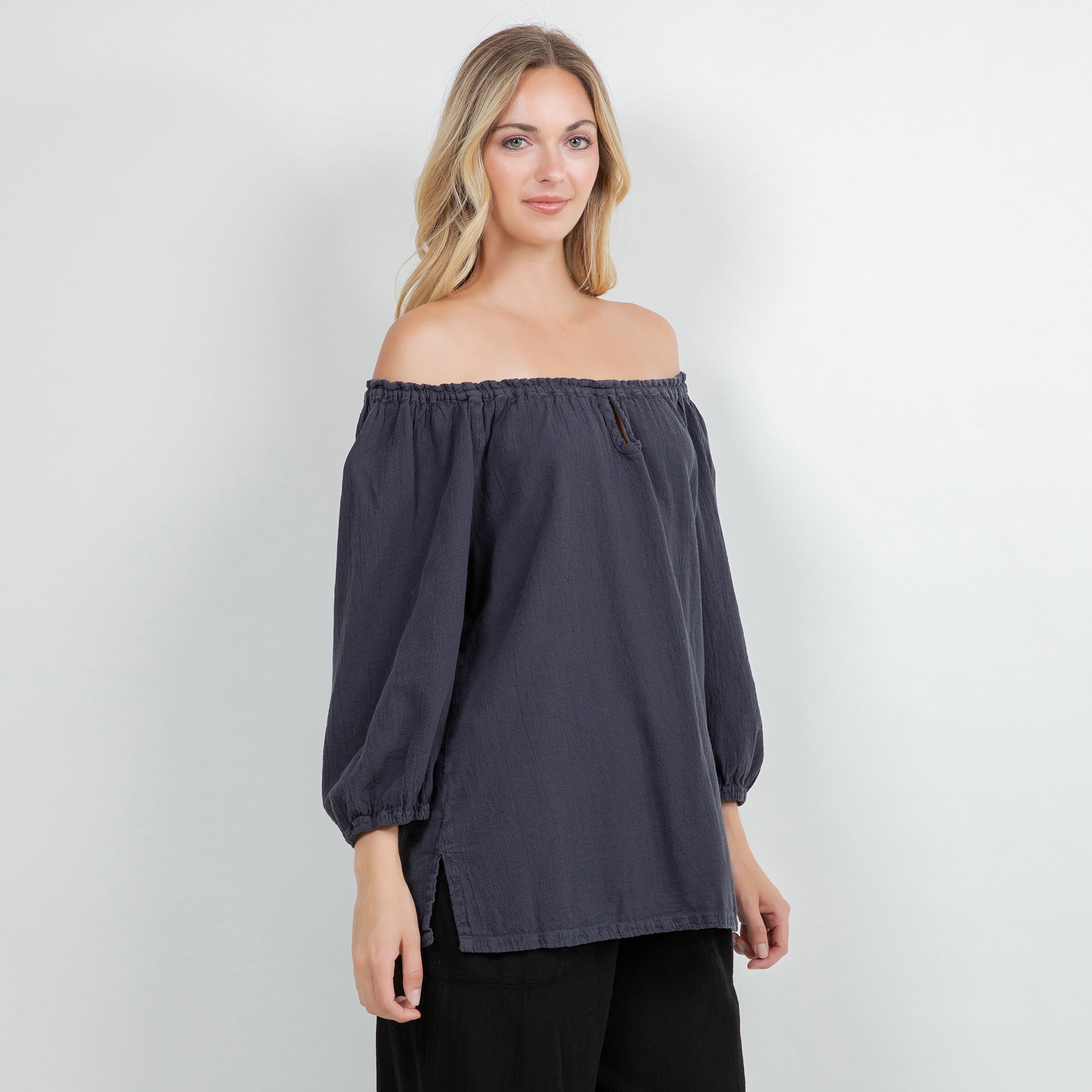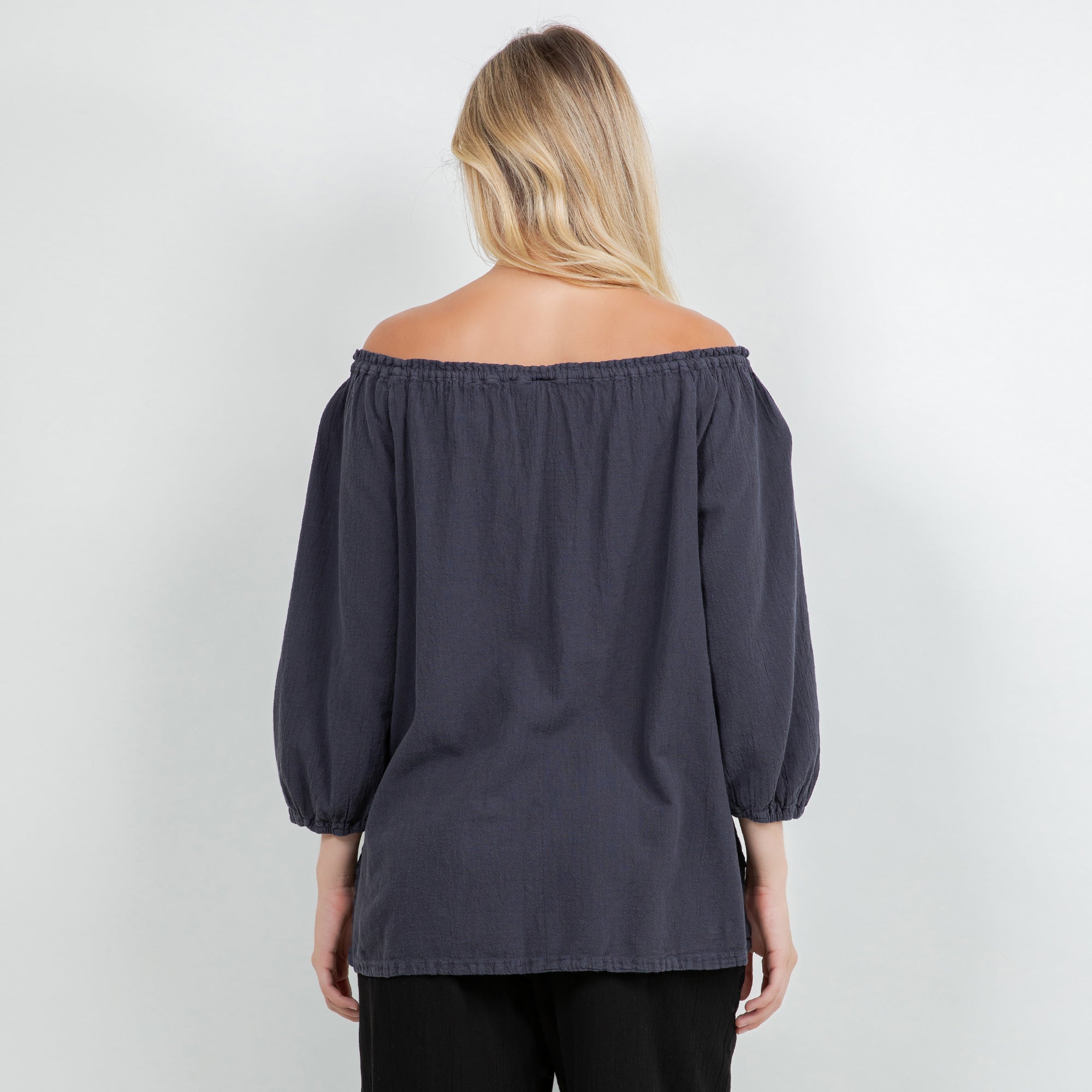 The Presley Top flatters everyone! A beautiful off the shoulder top. With 3/4 adjustable length elastic sleeves, and a teardrop cutout at the top!