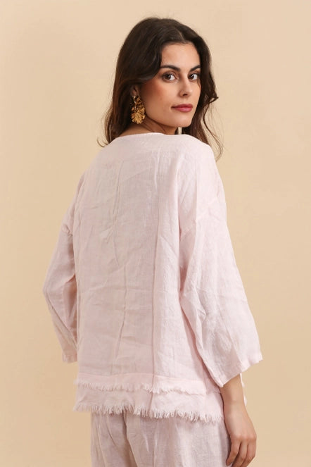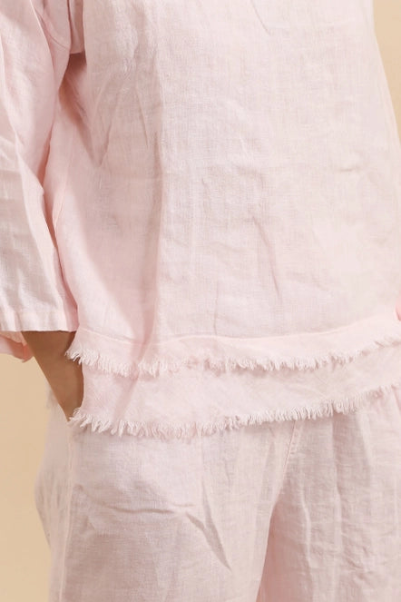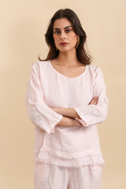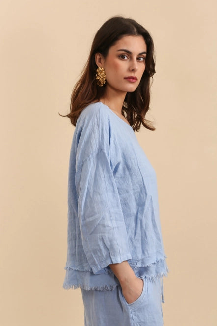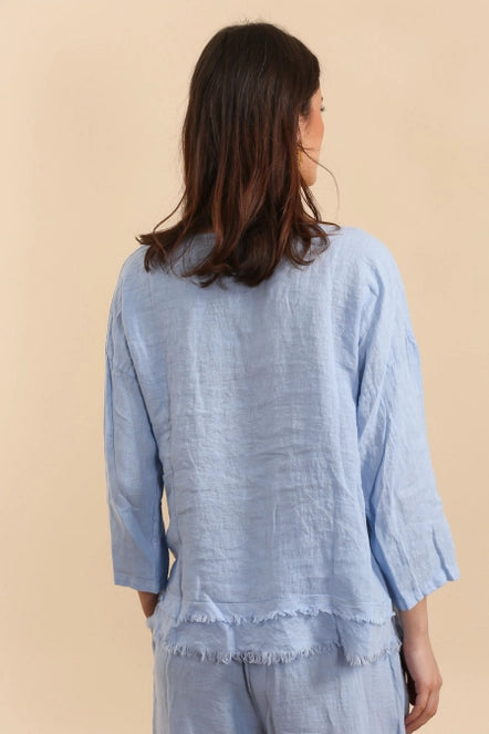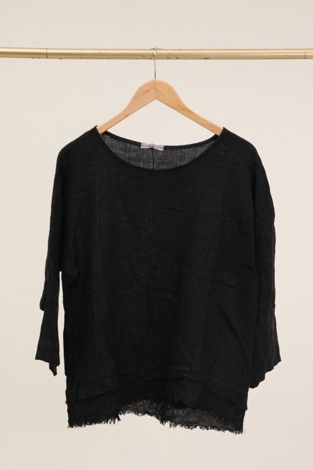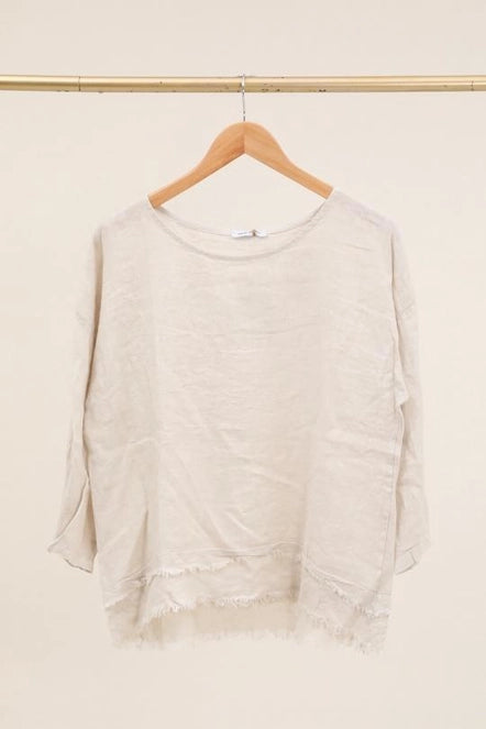 This 100% Linen top is detailed with a scoop neckline and frayed layered bottom.