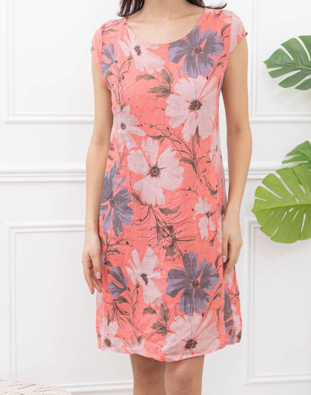 Fun short Linen Dress with fabulous stretchy gusseted waist, cap sleeves and pockets. Features a fun floral print.