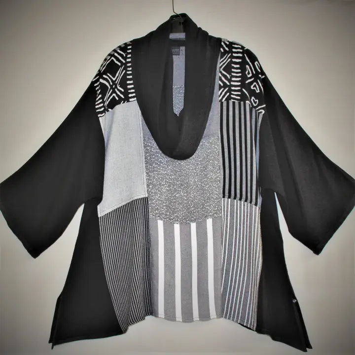 This combo top features a V-neck design with unique fabric patches, adding a bold and creative touch to the style. Its versatile look blends comfort with standout details, making it perfect for both casual and dressed-up occasions.