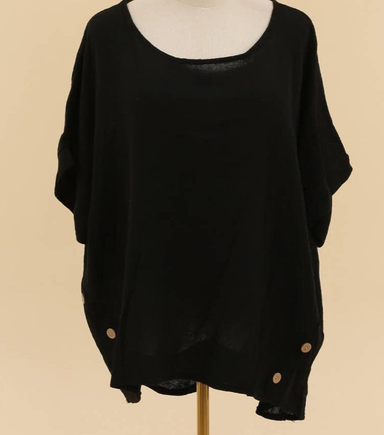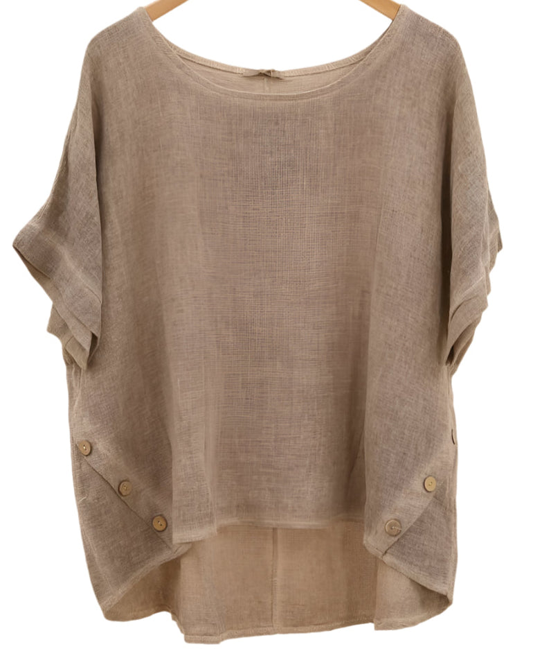 Blouse in 50% linen and 50% cotton with a round neck, short sleeves, and 2 buttons on the sides at the bottom of the blouse.