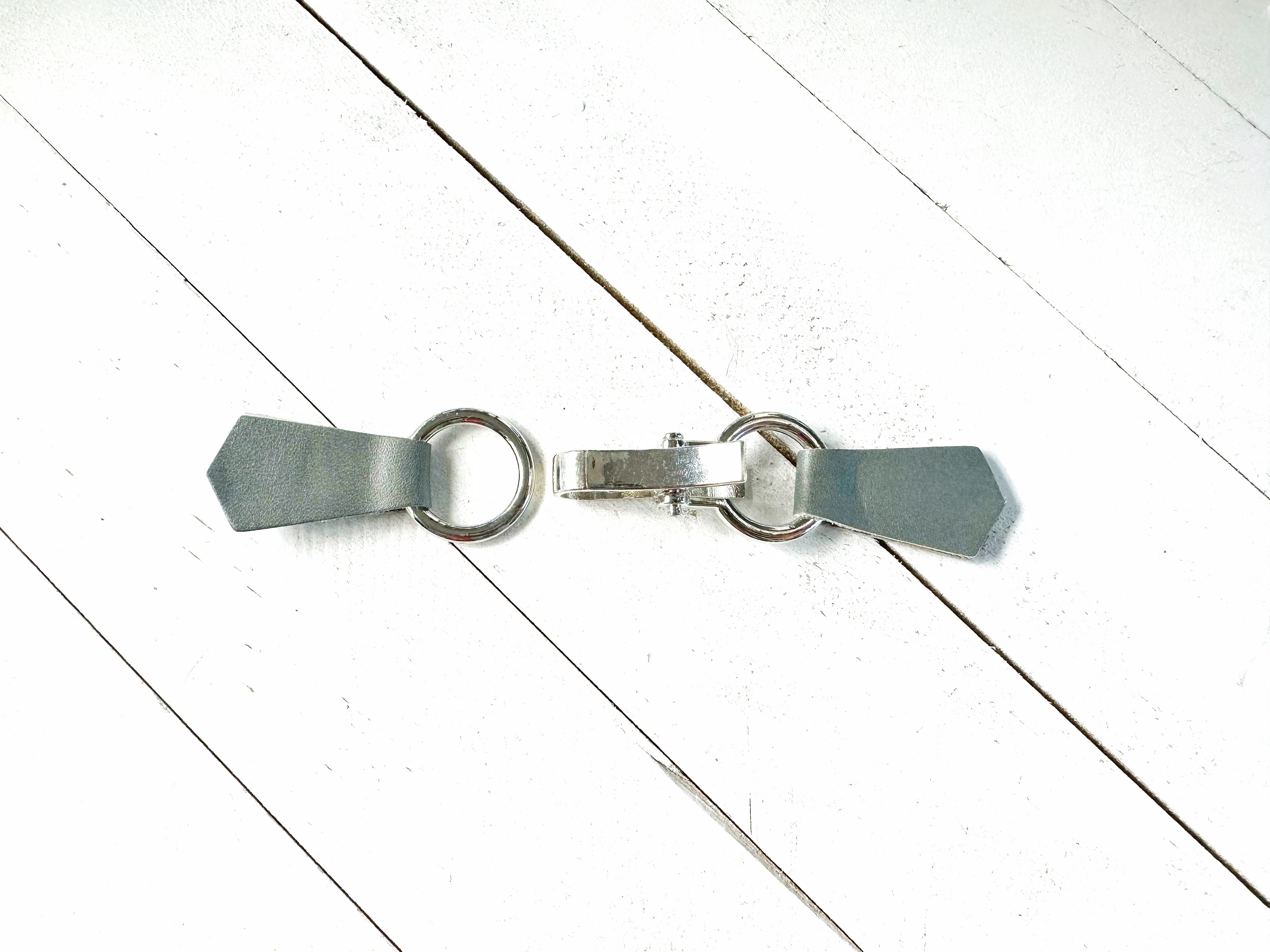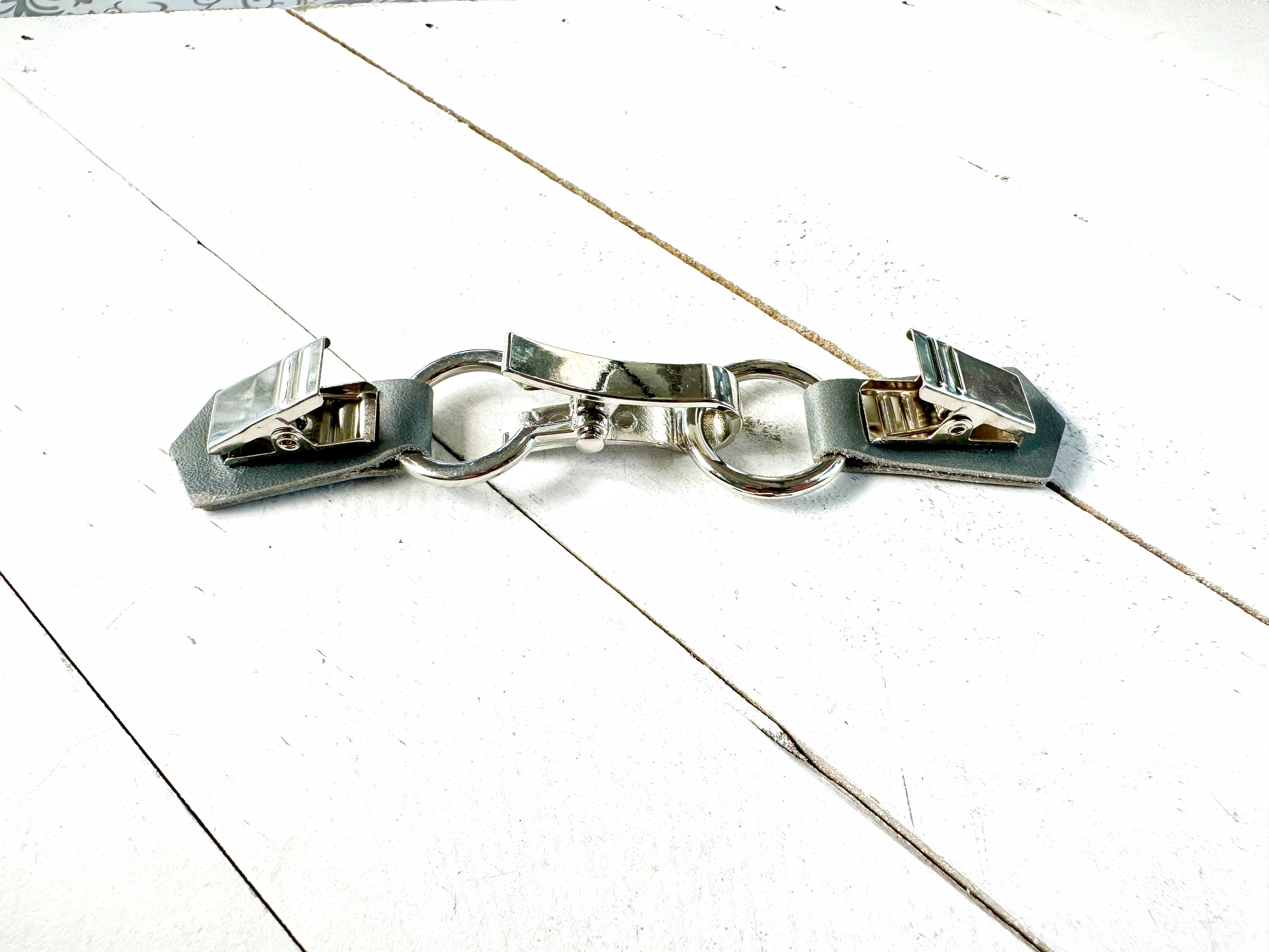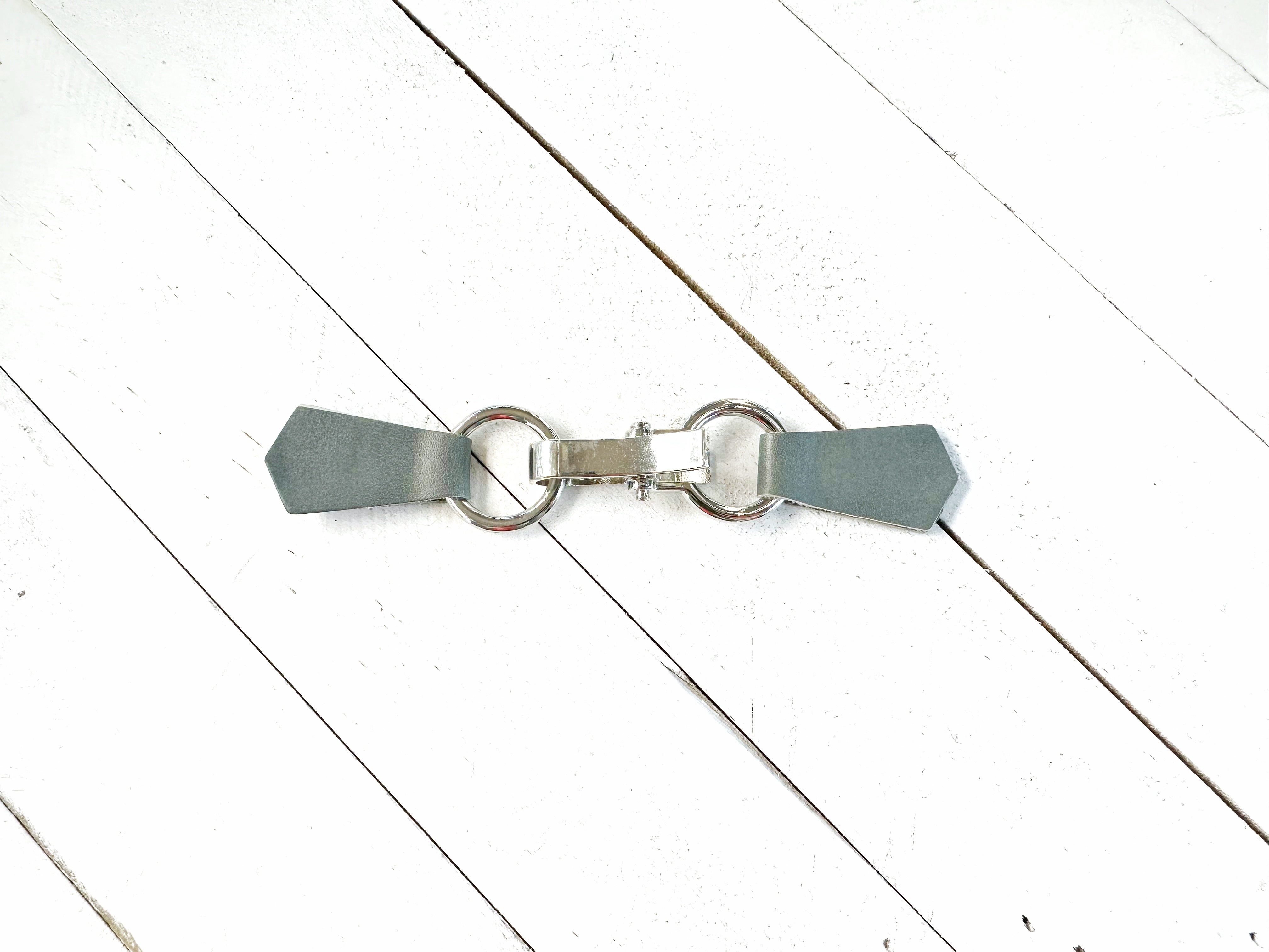 Buckle hardware with easy open/close & gray leather tabs on either side with grip clips hidden on back.