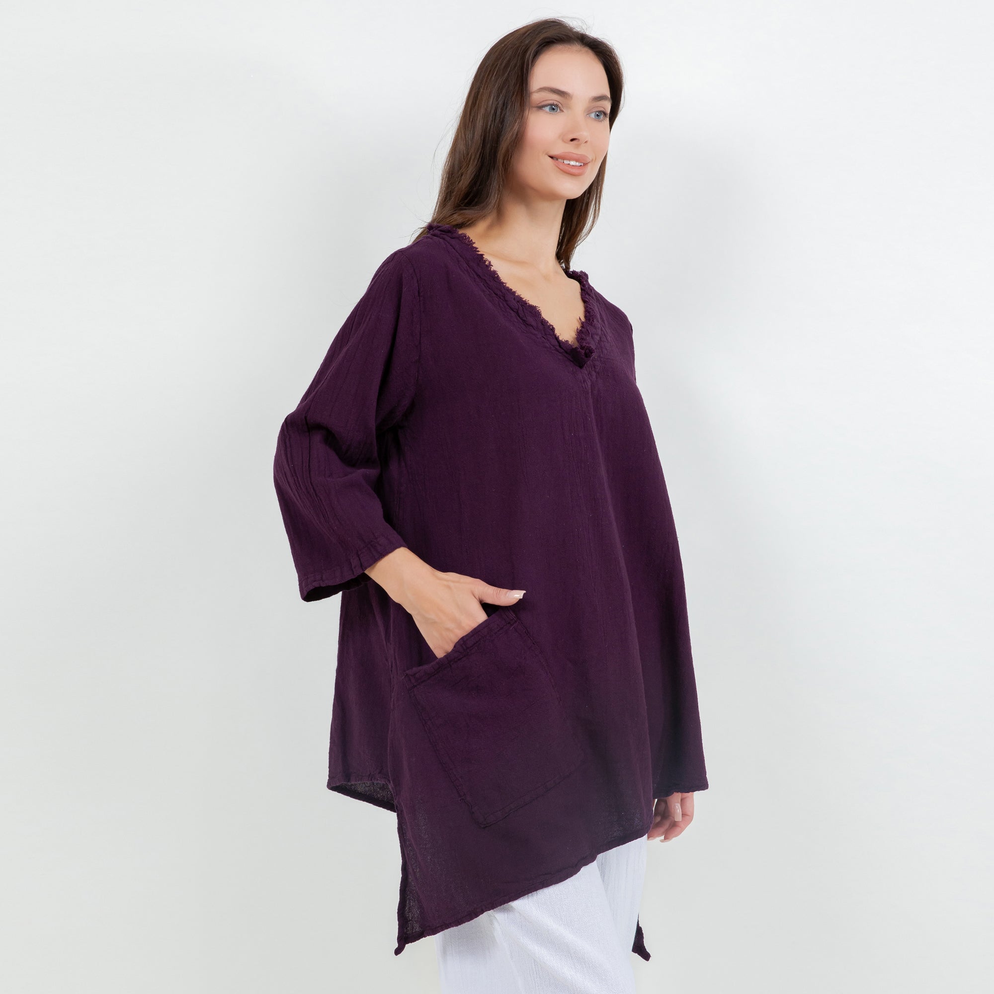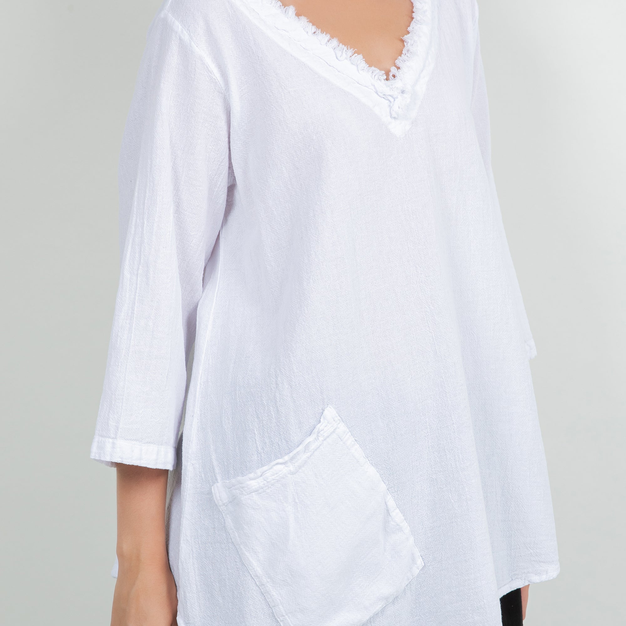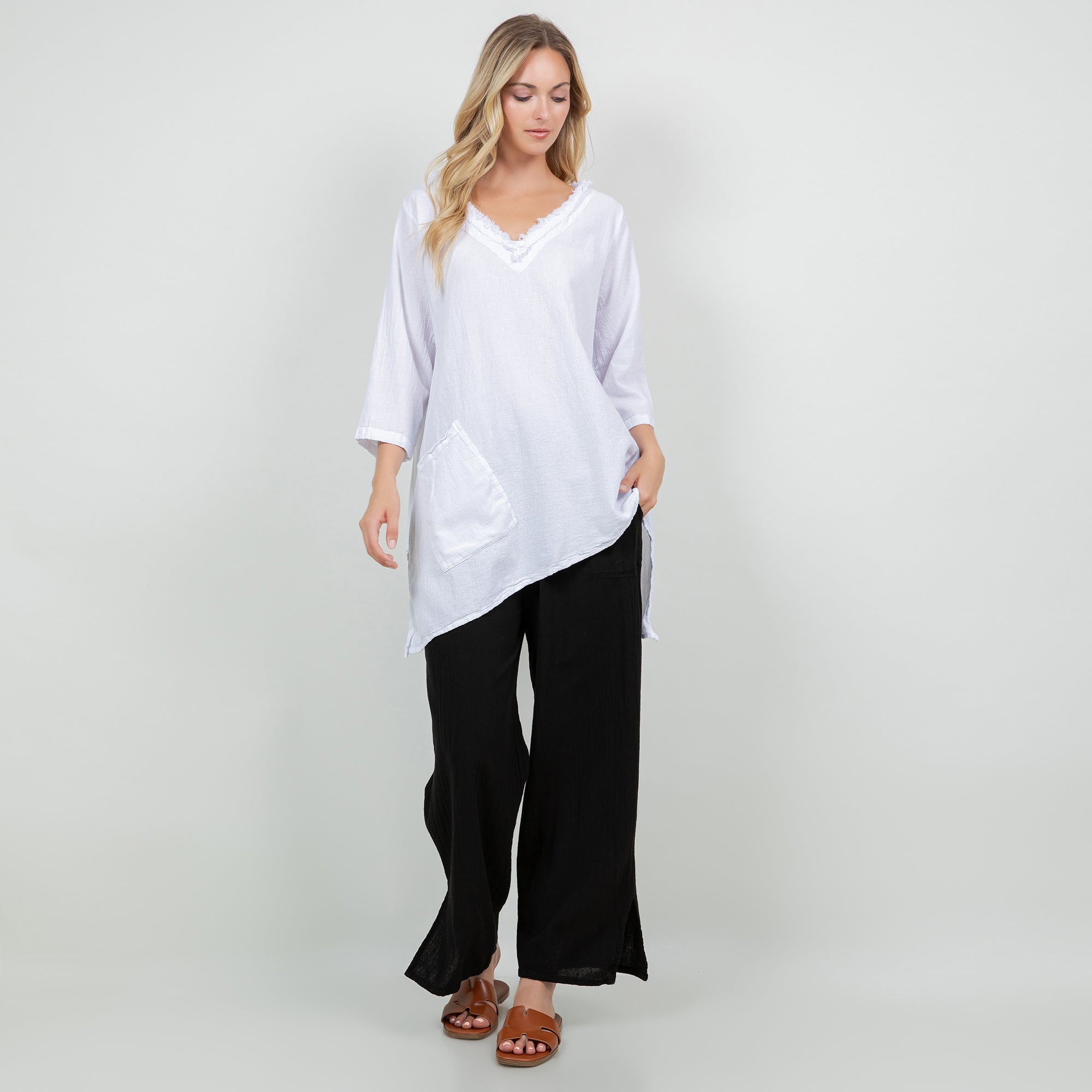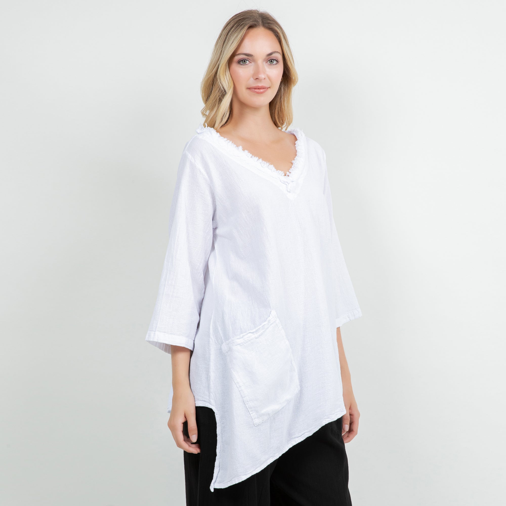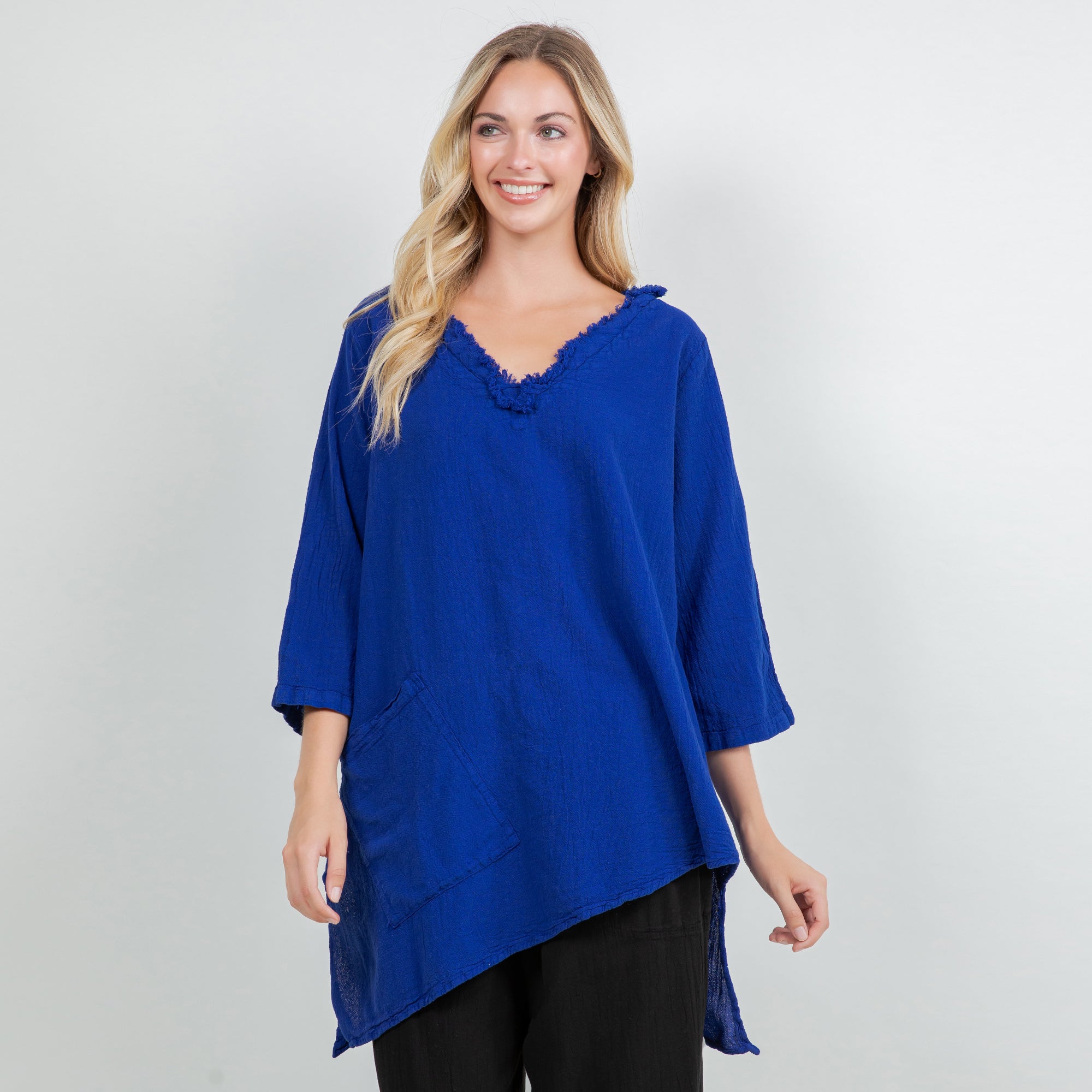 A flowy style, Zoe features a fringed v-neck, 3/4 sleeves, right side pocket, with an angled bottom in front & back.