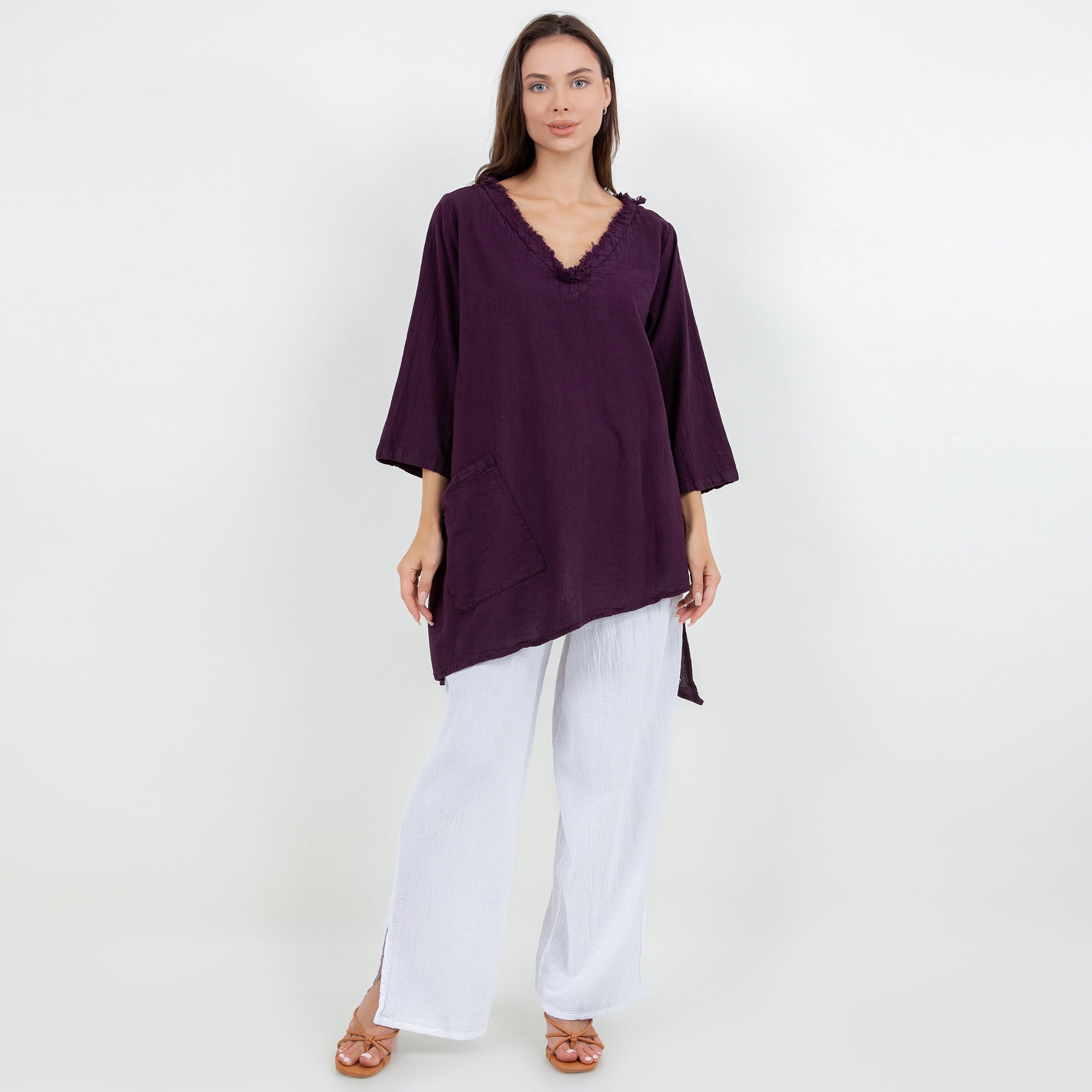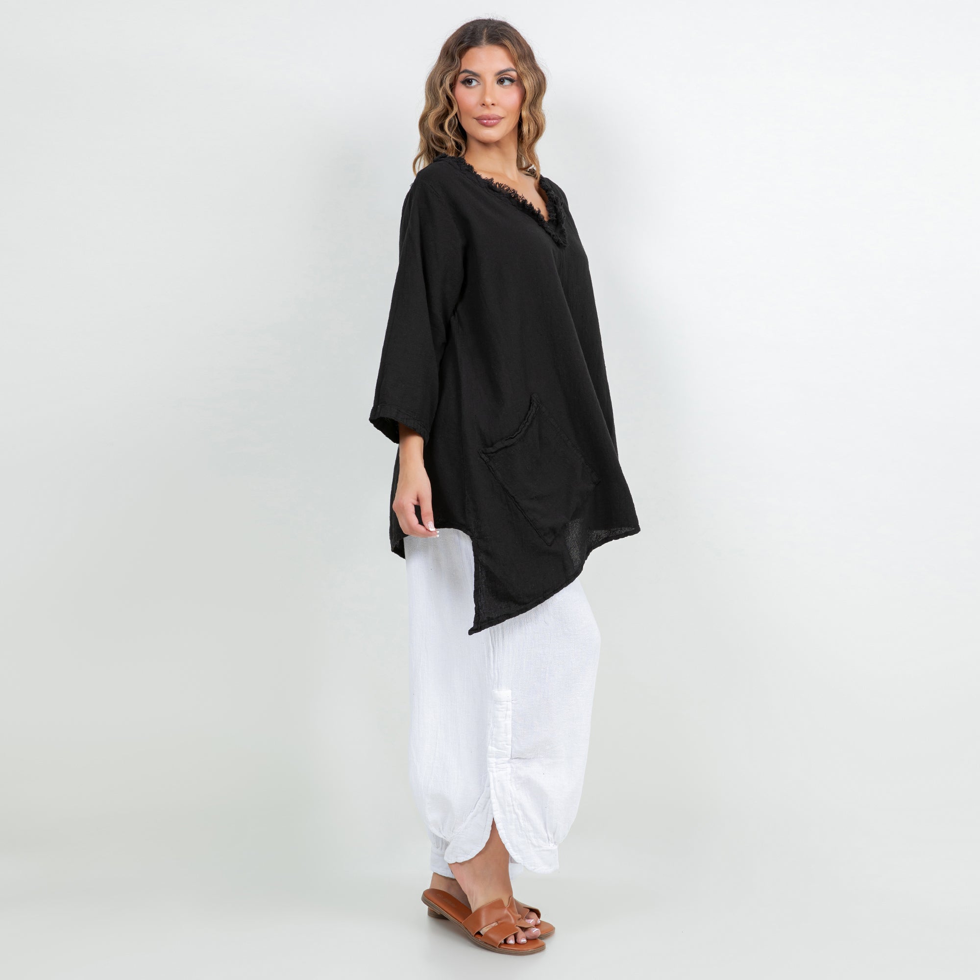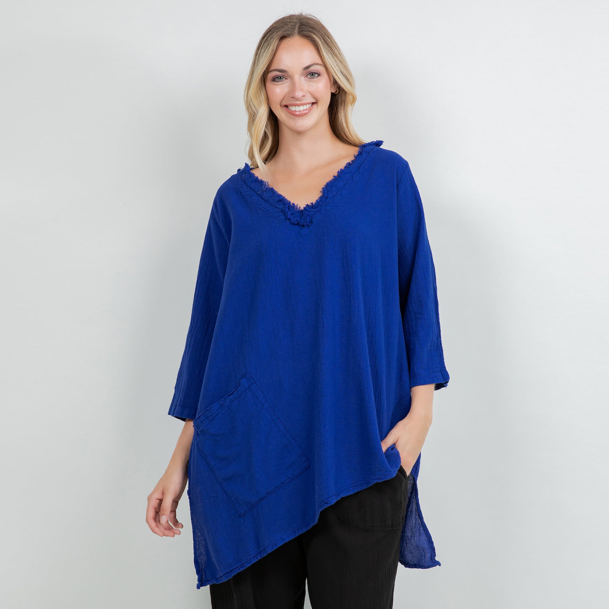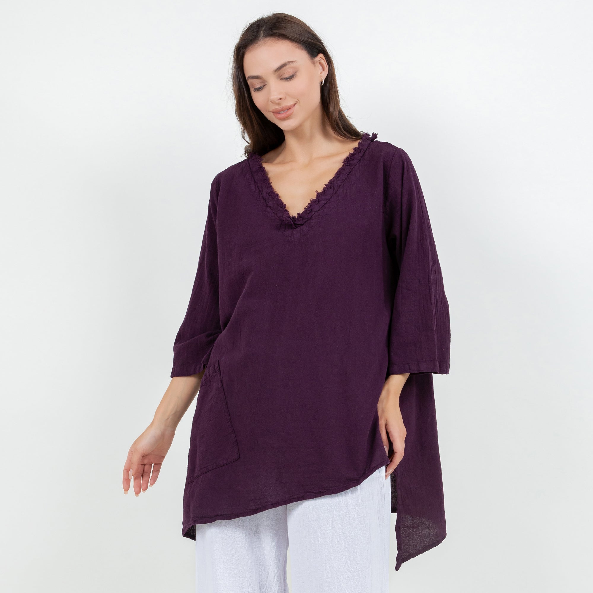 A flowy style, Zoe features a fringed v-neck, 3/4 sleeves, right side pocket, with an angled bottom in front & back.