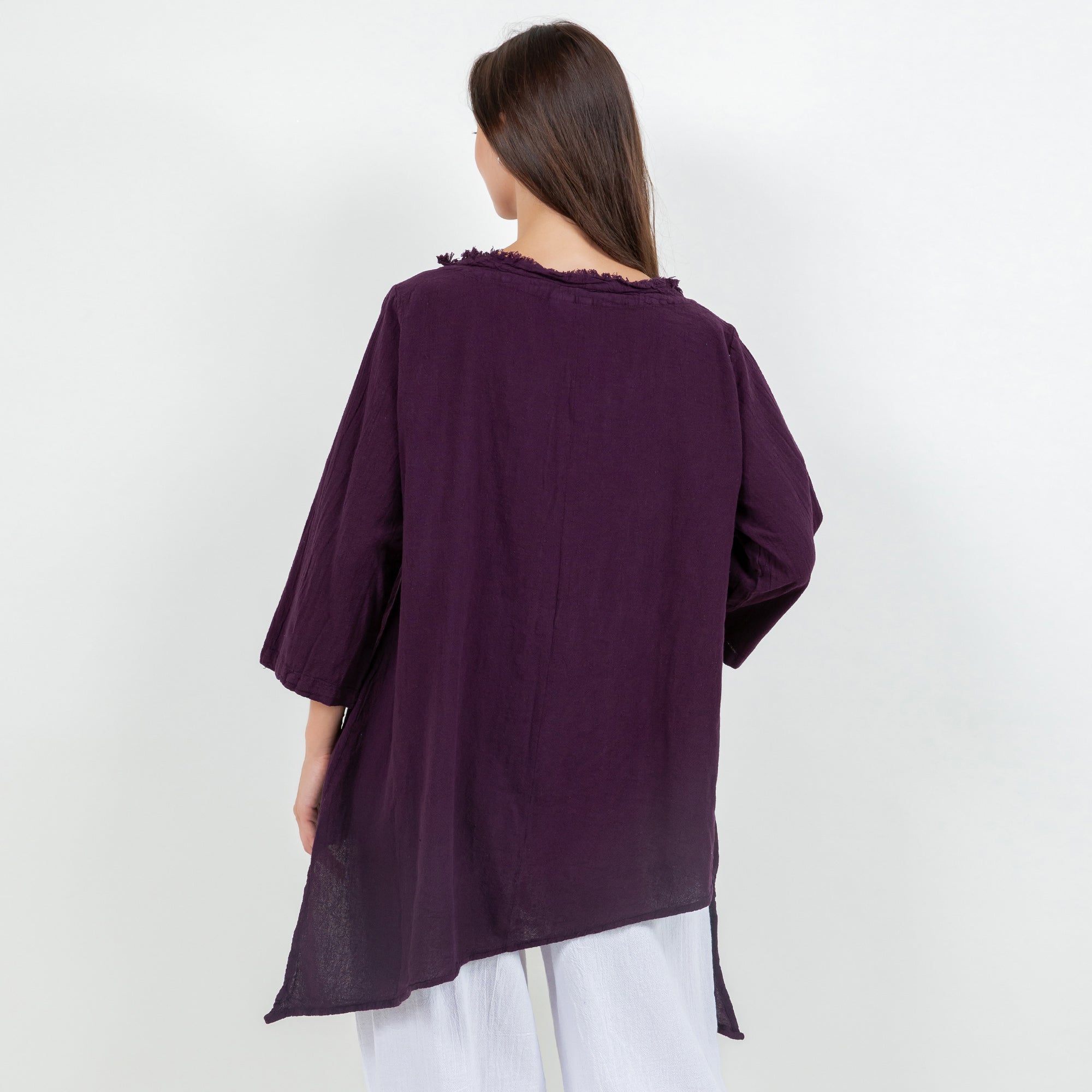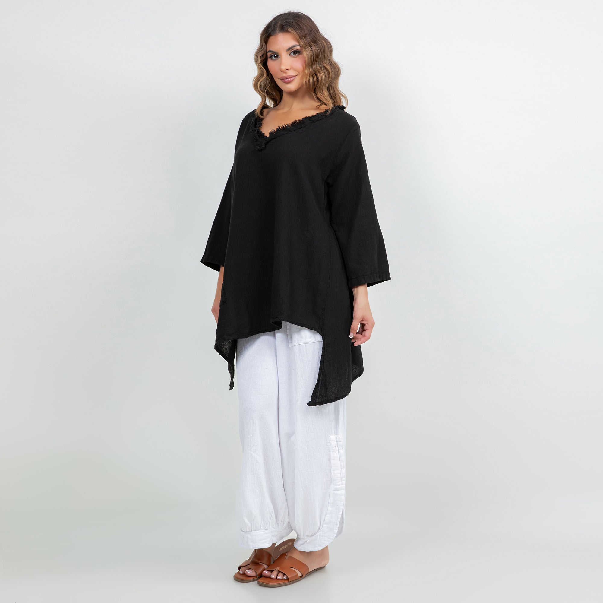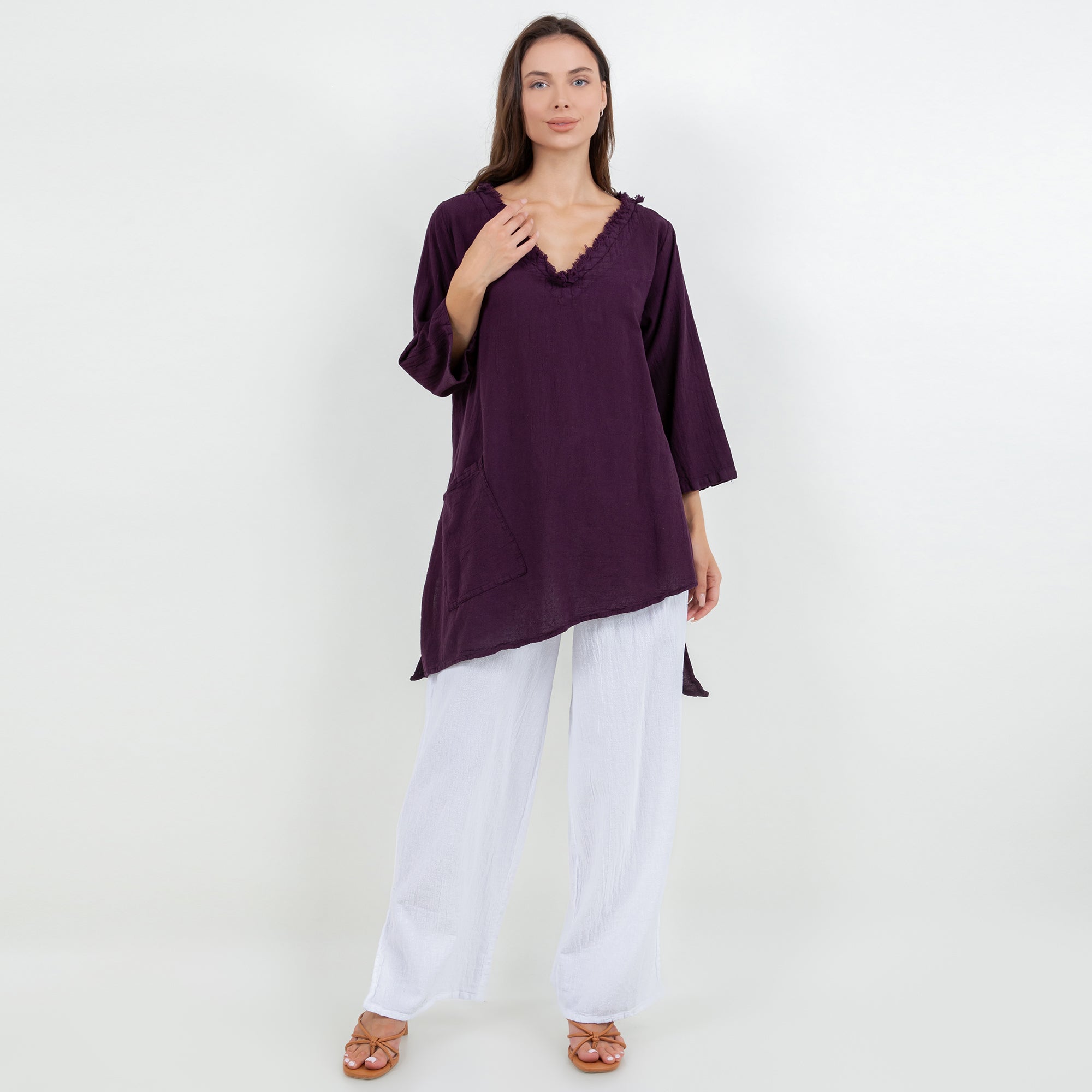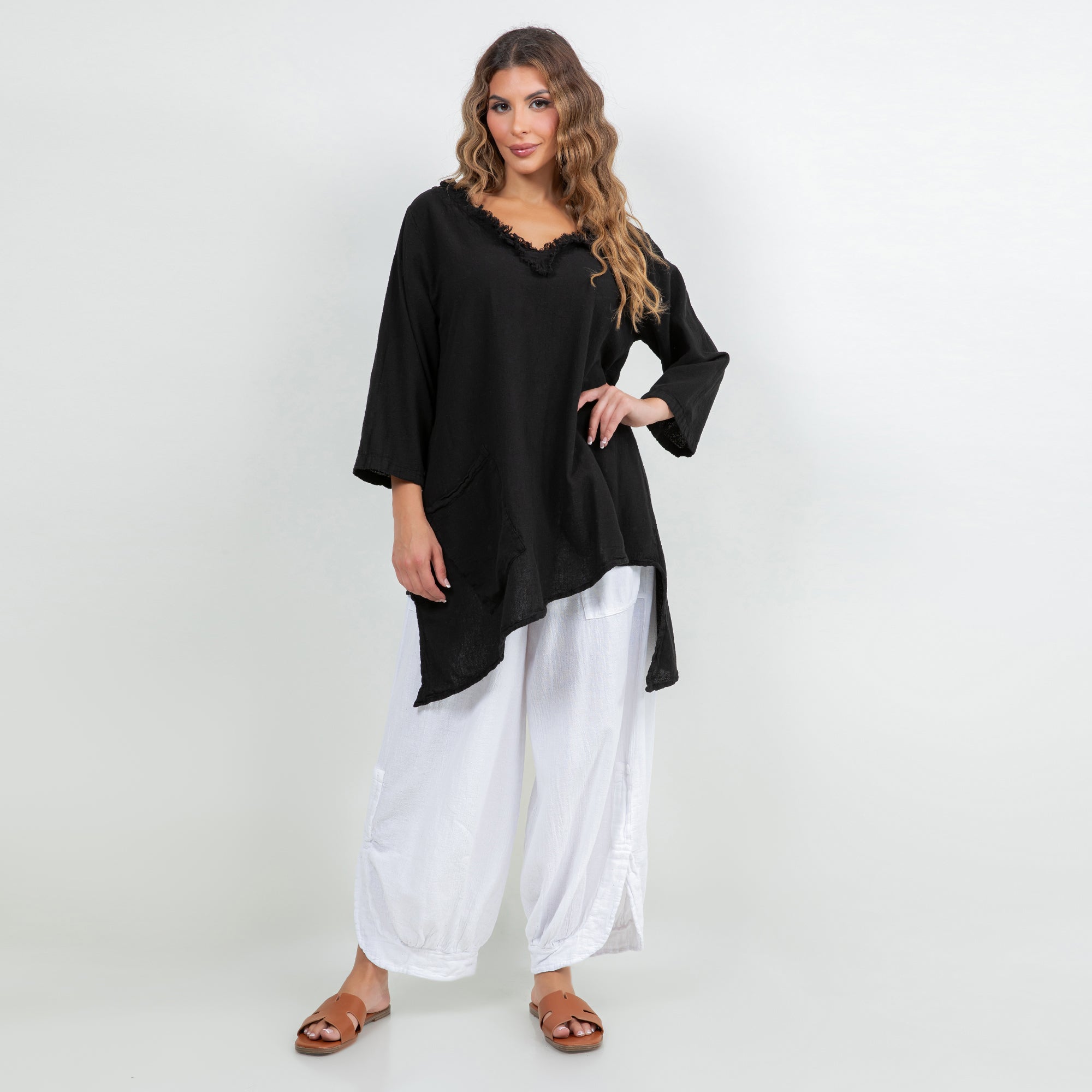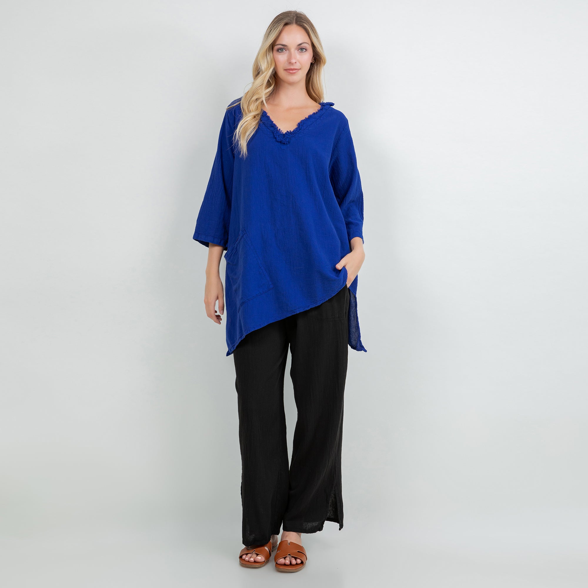 A flowy style, Zoe features a fringed v-neck, 3/4 sleeves, right side pocket, with an angled bottom in front & back.
