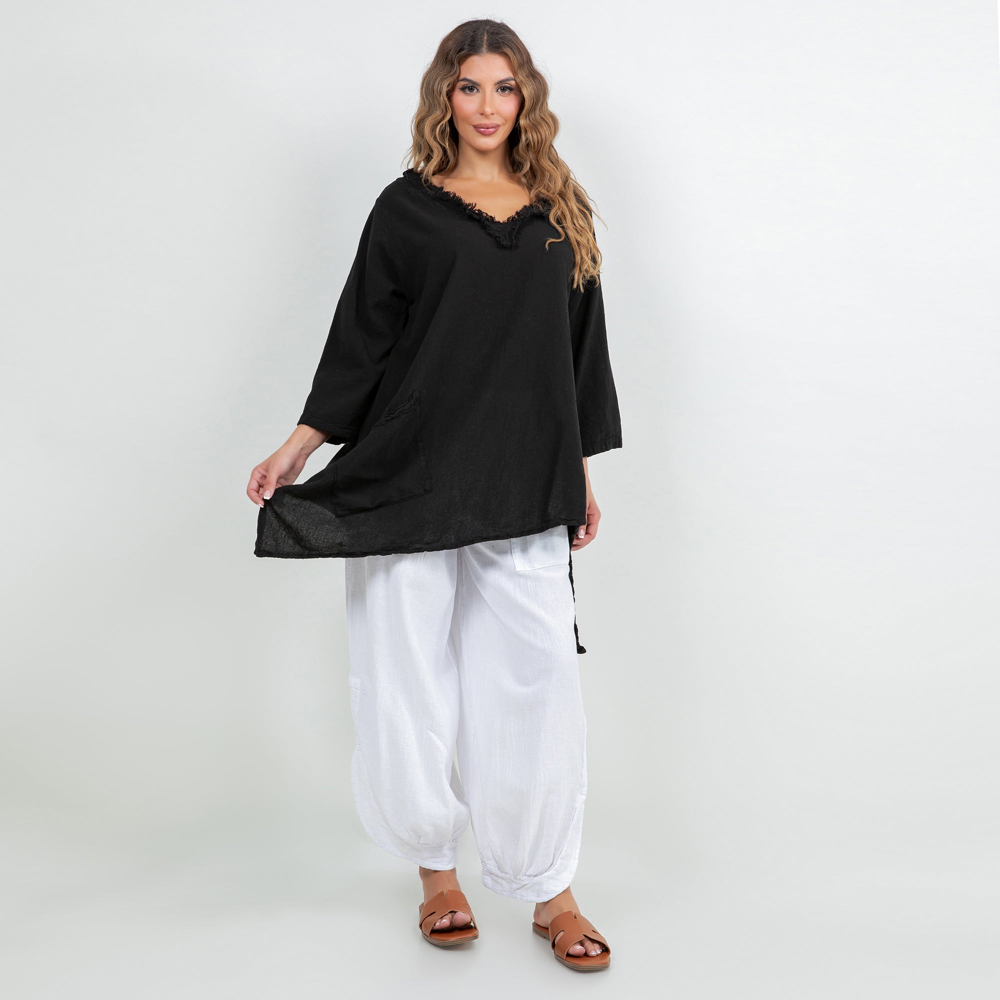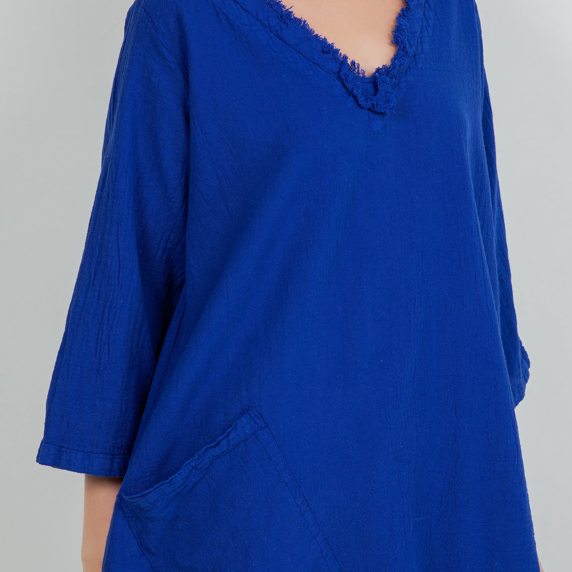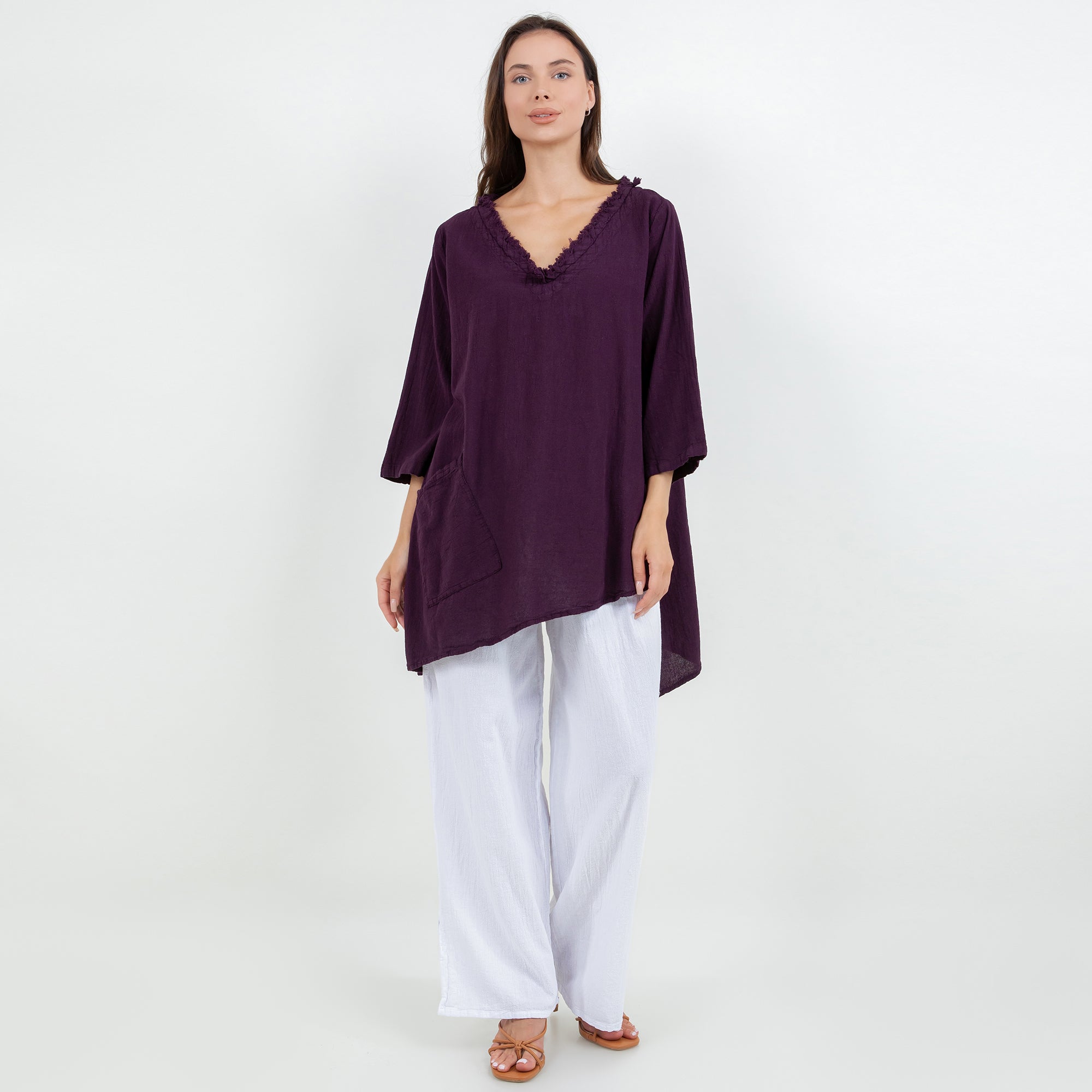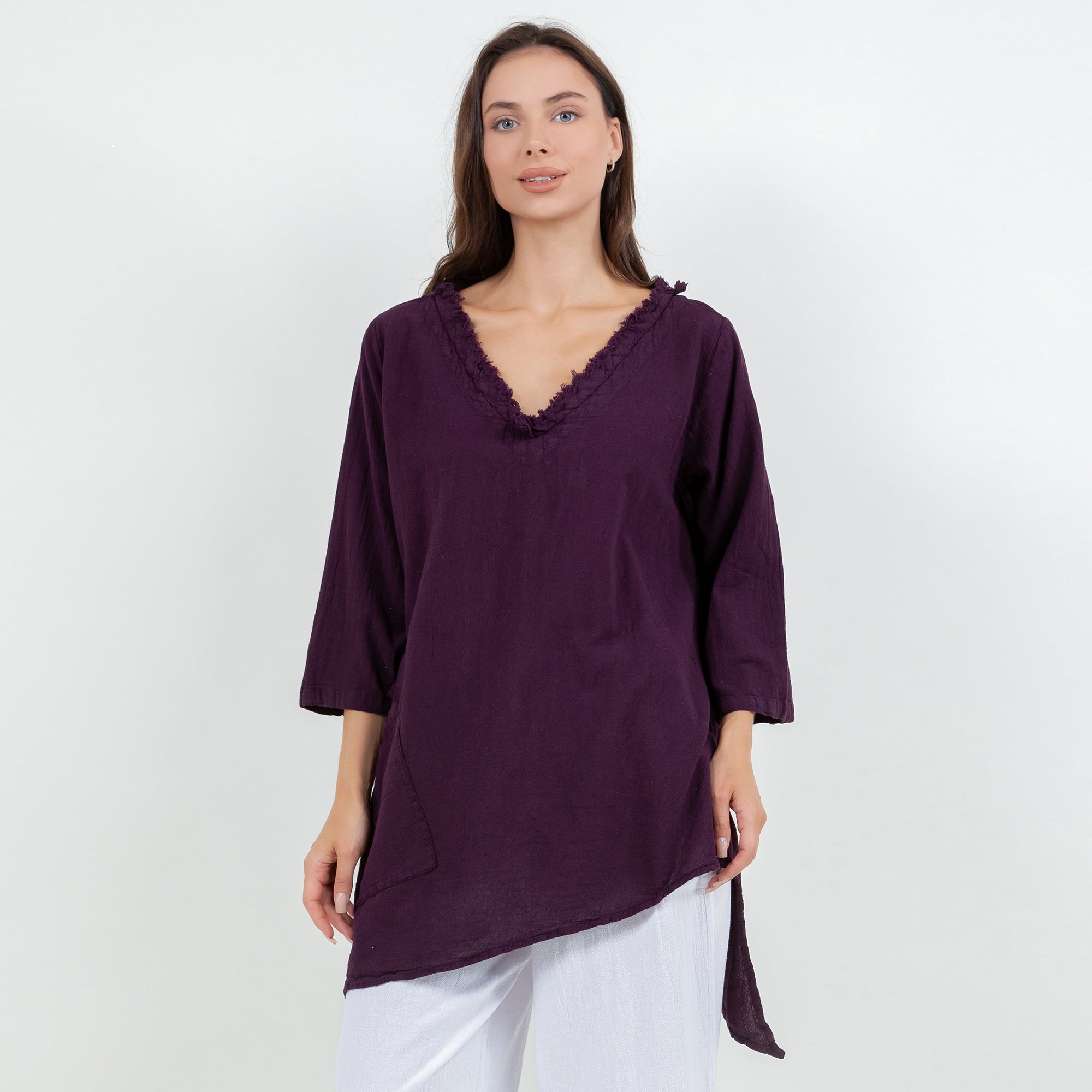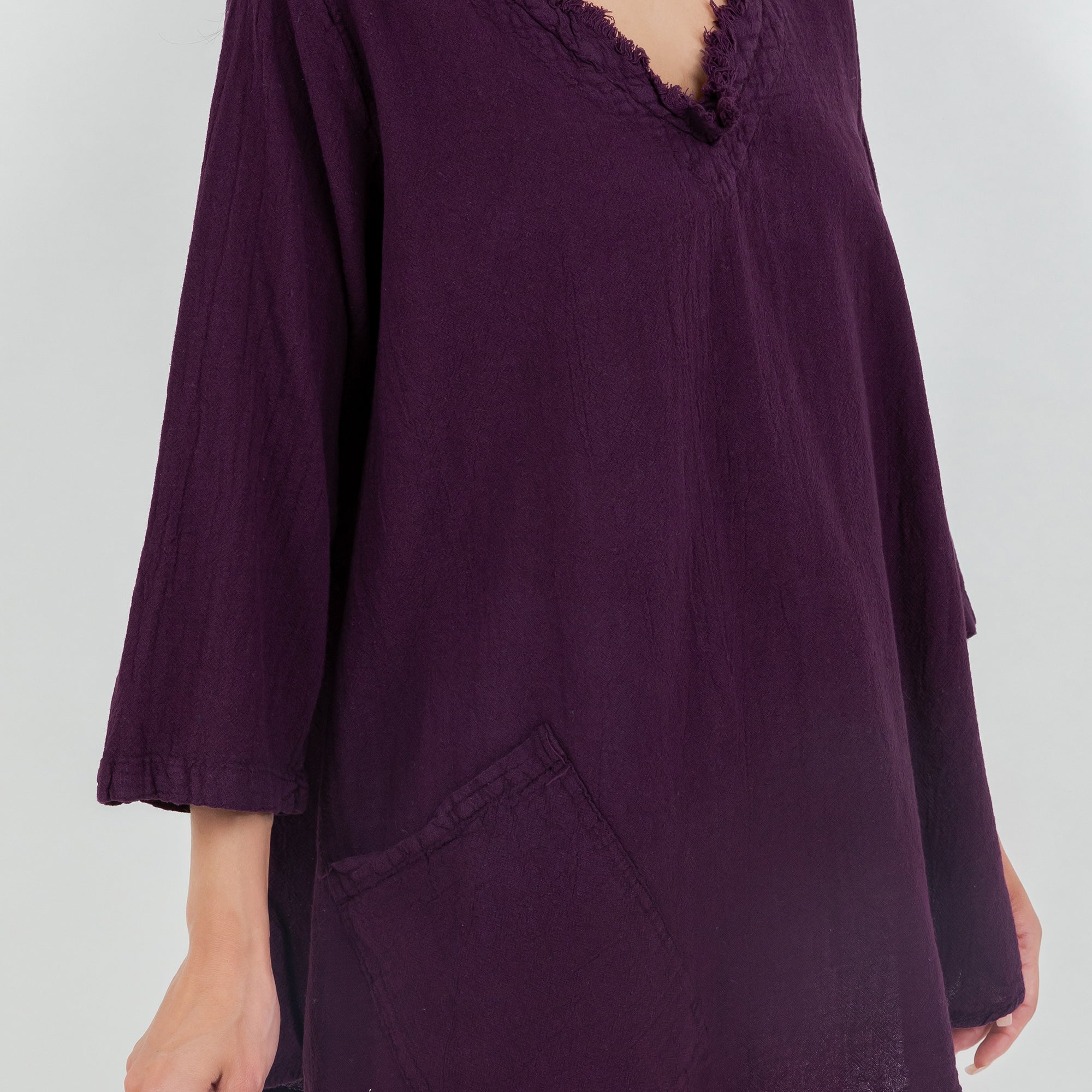 A flowy style, Zoe features a fringed v-neck, 3/4 sleeves, right side pocket, with an angled bottom in front & back.