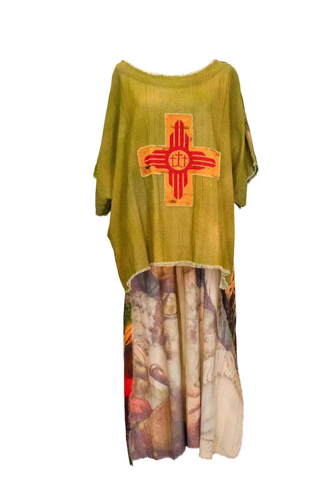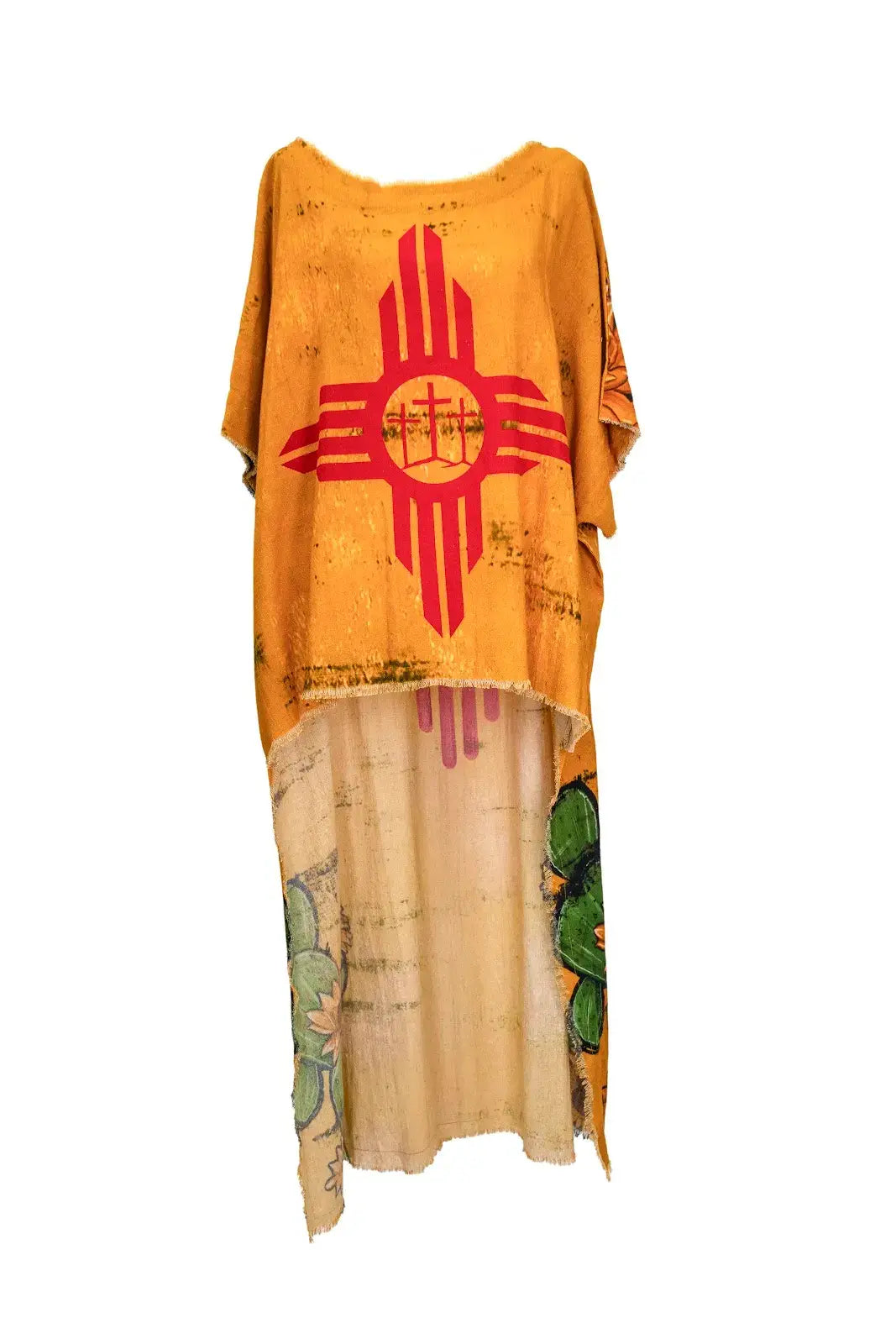 This hi-lo tunic features a relaxed fit and a soft drape, designed for everyday comfort with meaningful details. On the front, the New Mexico Zia symbol is printed simply and clearly, representing balance and connection to the land. The back features a bold, respectful print of Sitting Bull, reflecting strength and history. Made for those who appreciate both thoughtful design and cultural significance, this piece pairs well with denim, boots, or worn layered through the seasons. Size: One size fits most Color: Green or Orange Material: 100% cotton
