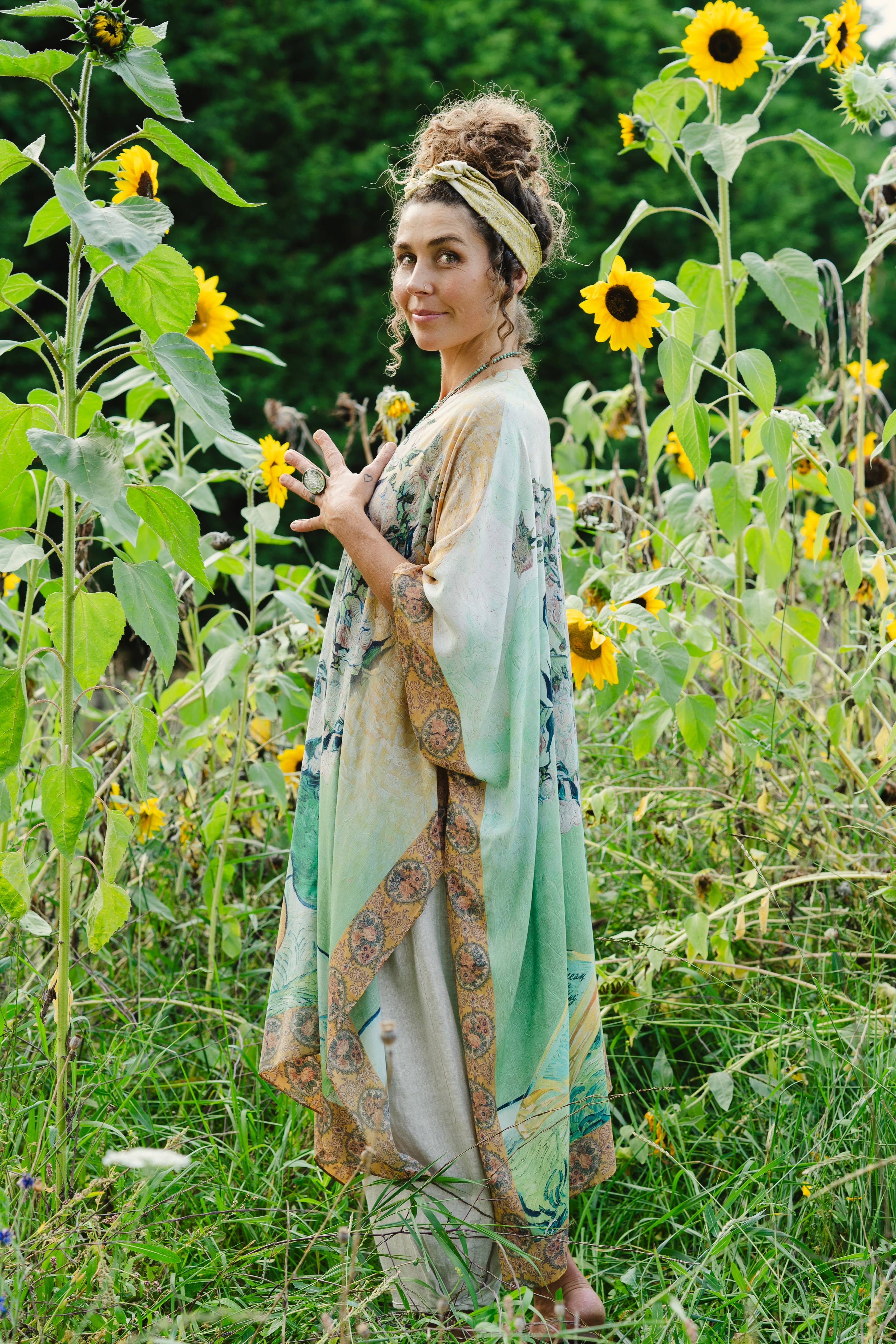 Step into a masterpiece! This piece celebrates the vibrant brilliance of Van Gogh’s iconic paintings, and is our heartfelt tribute to the bravery and beauty of the artist. We combined several of Van Gogh’s works to create this print — including his infamous “Roses” (1890), painted during his time at the Saint-Paul-de-Mausole asylum, which captures the delicate beauty of blooming flowers as a symbol of hope. The words “I dream my painting and I paint my dream”, written in the book on the table, is our very favourite quote from the artist himself. As a significant, final touch, we added the eye from Van Gogh’s “Self Portrait with a Straw Hat” (1887), a painting which offers an intimate glimpse into the artist’s soul. 100% viscose (derived from plant fibres such as wood and bamboo). Machine wash gentle or handwash and hang to dry. Kimono meaurements: length 92cm , width 110cm. * boho gypsy chic lounge bohemian artisan beach