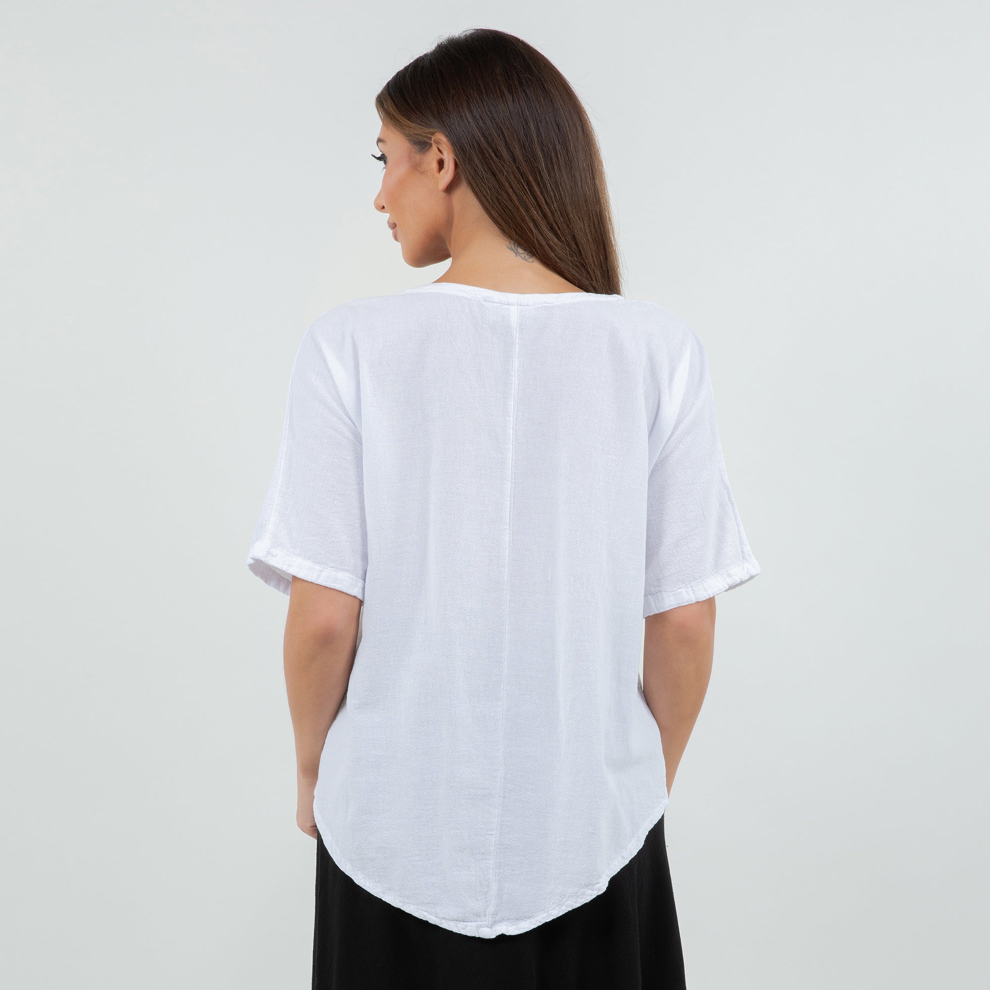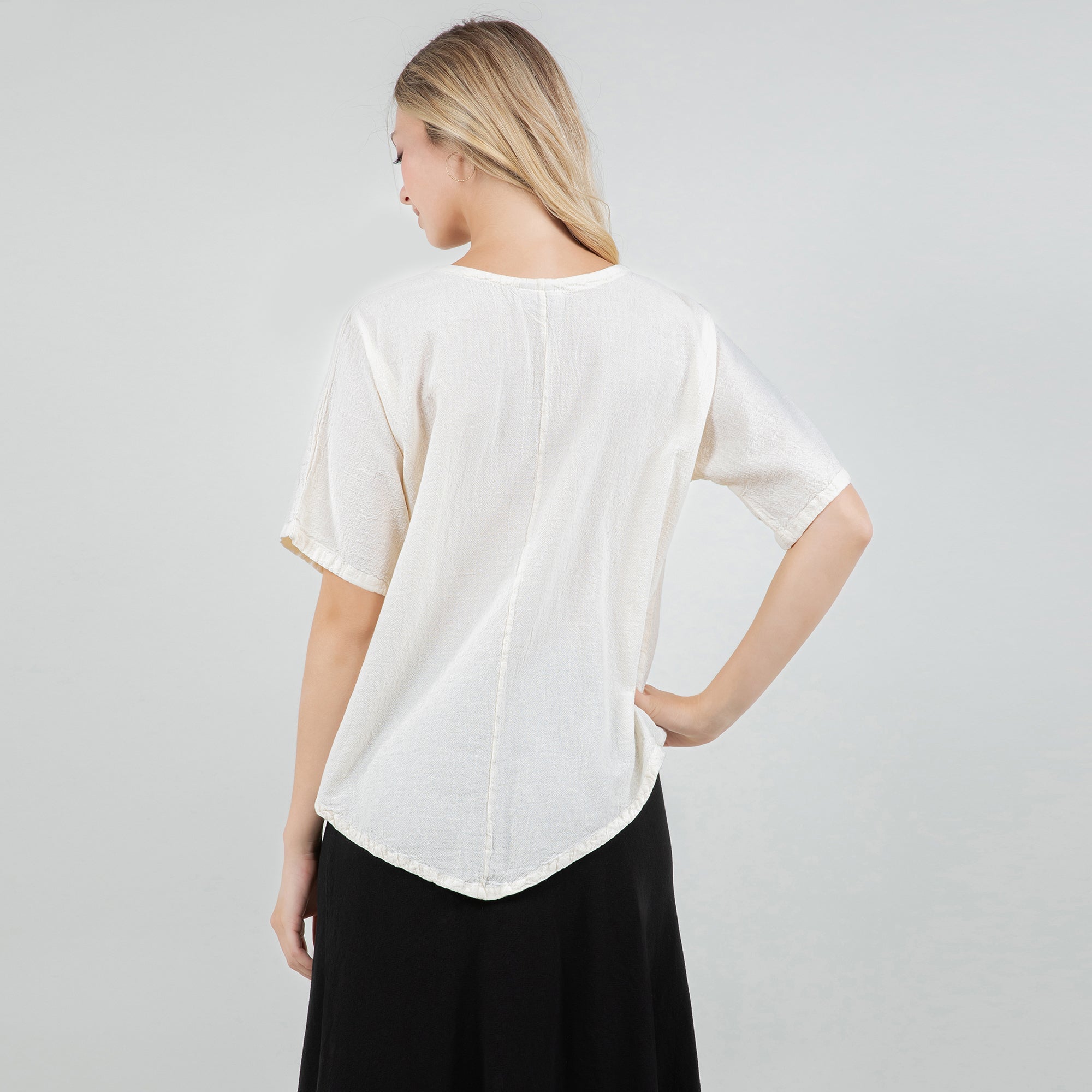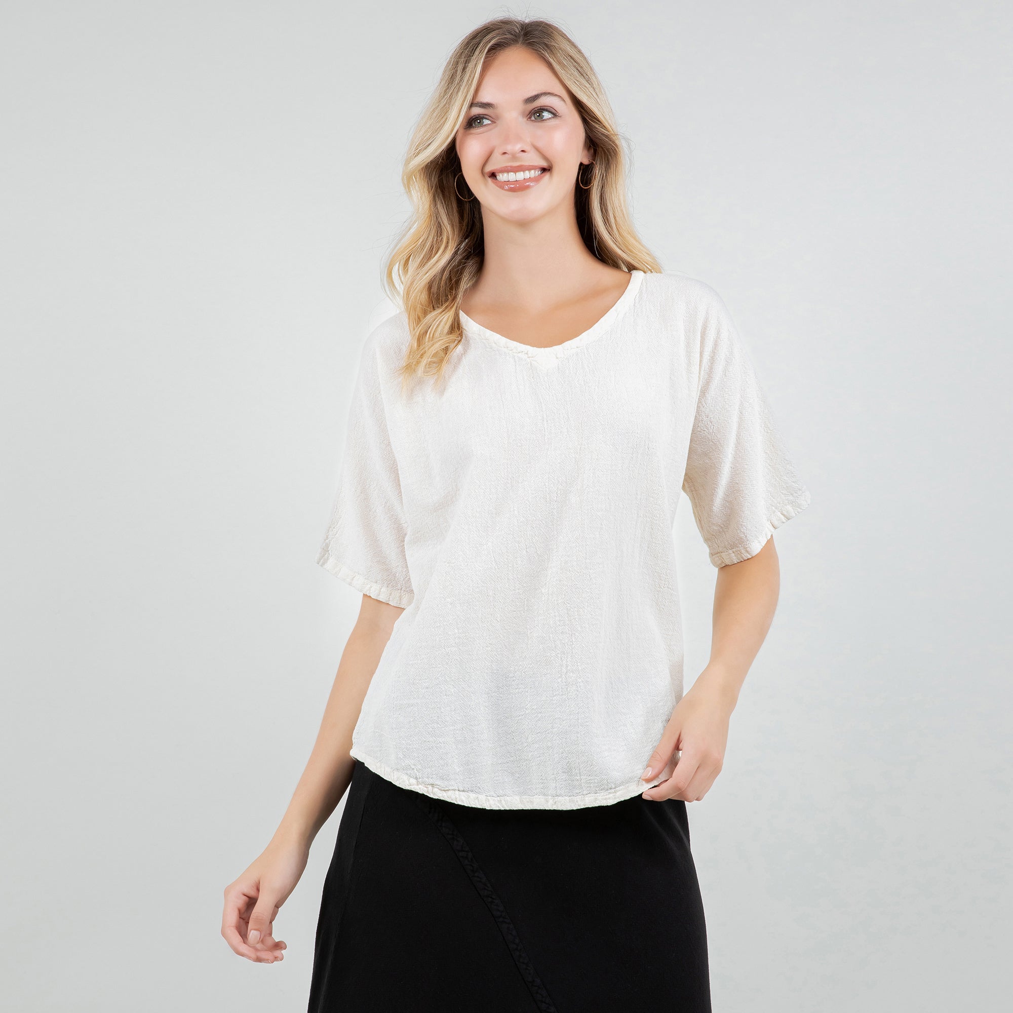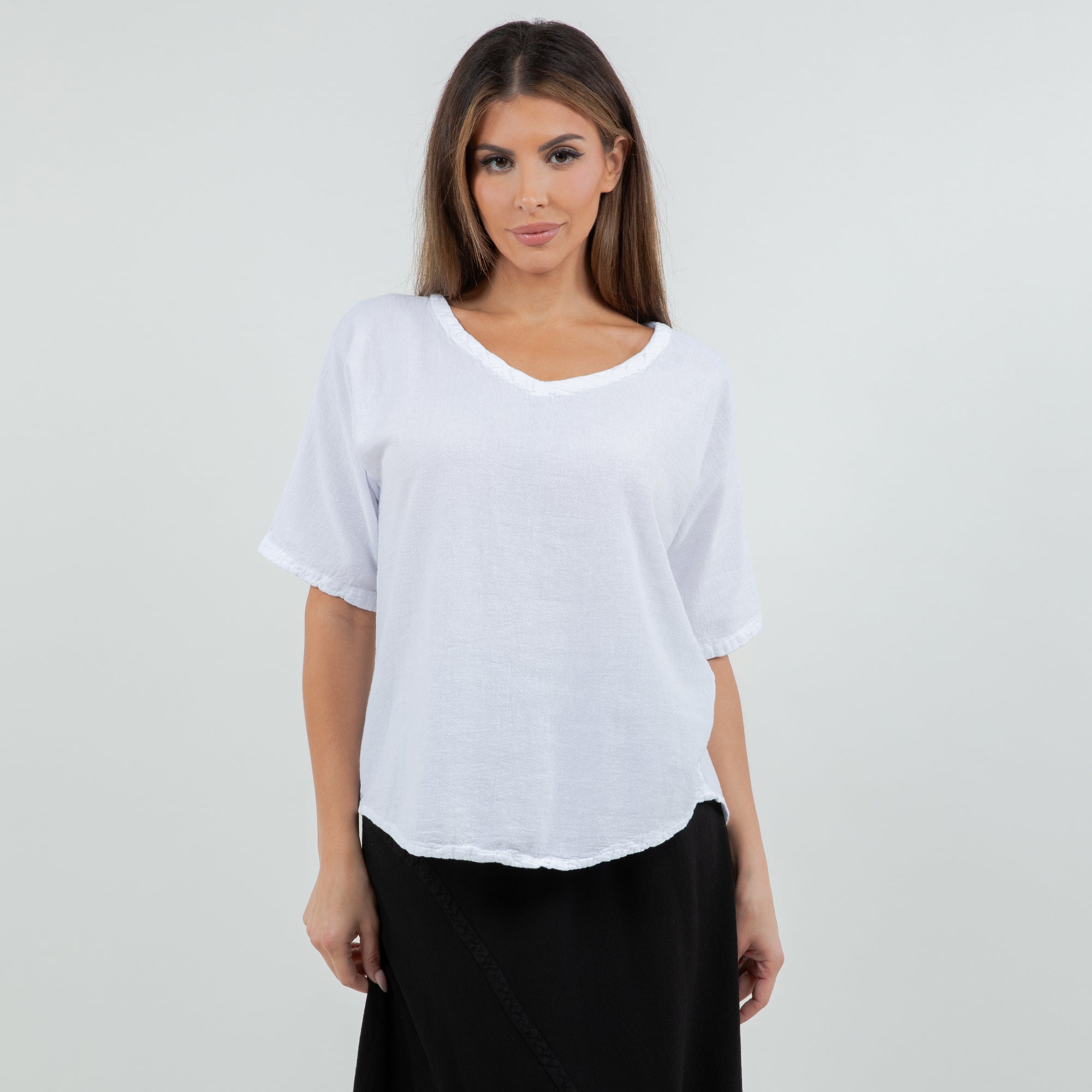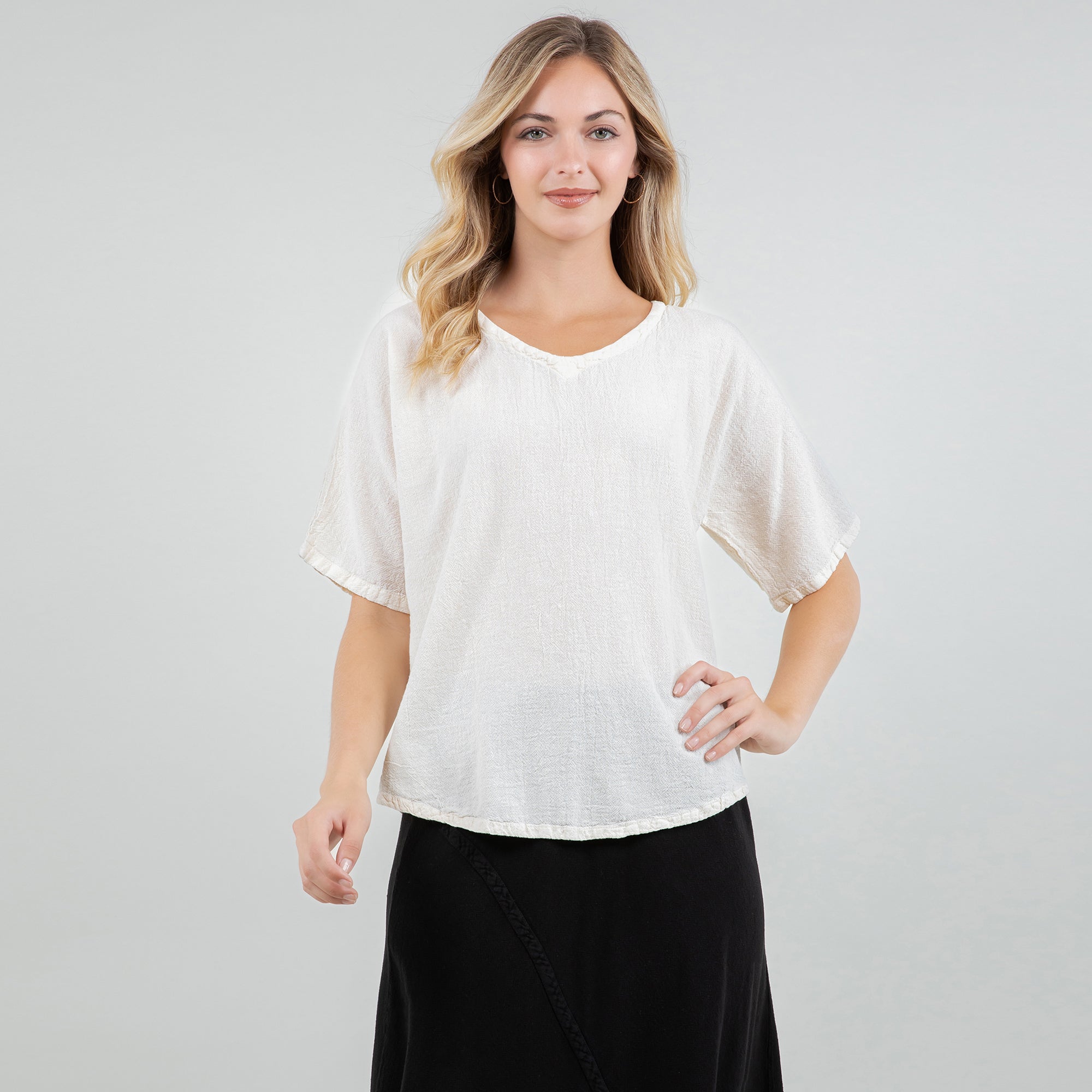 Featuring a mid-length sleeve and scoop bottom with matching neckline, the Mary is a classic style top that shines with any outfit!