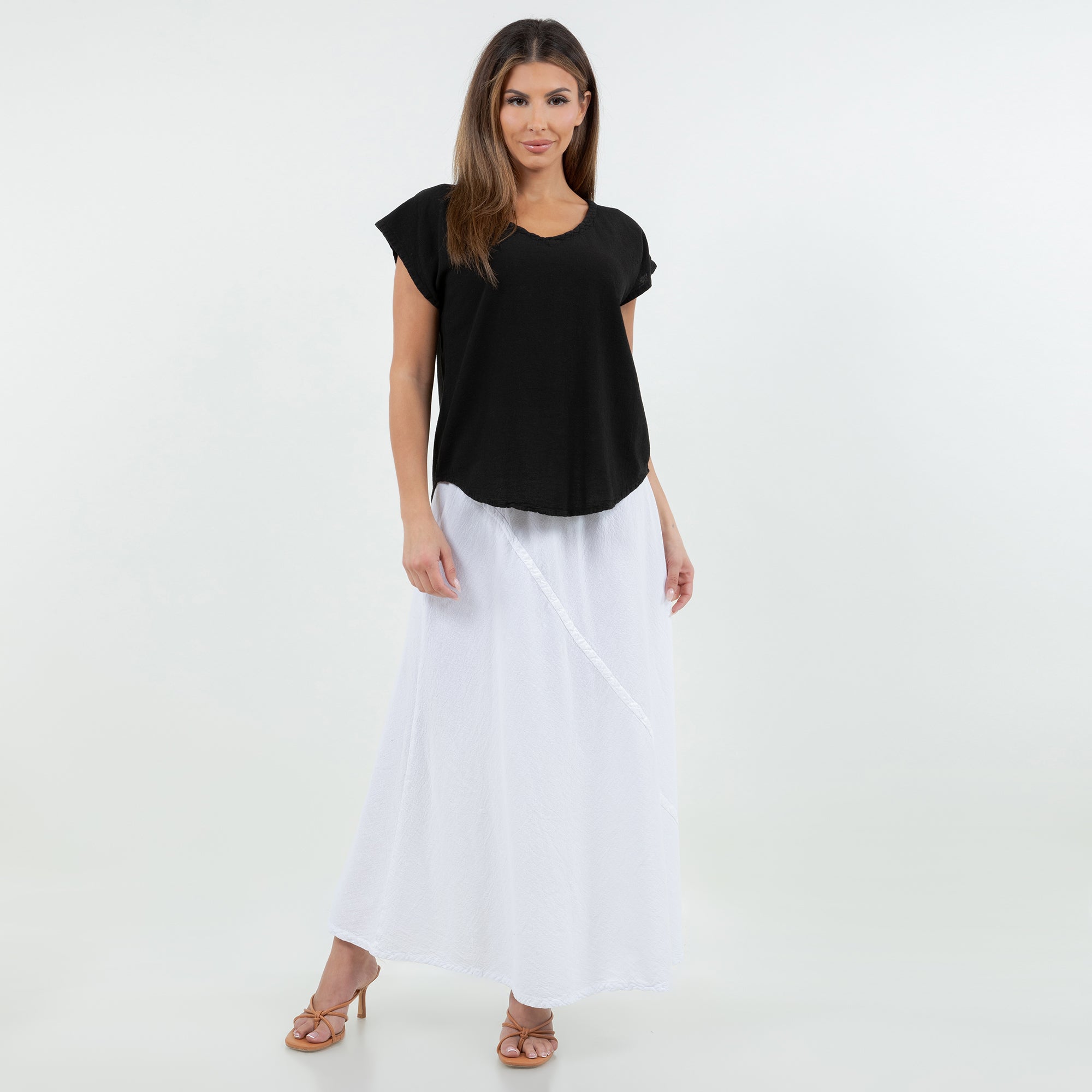 A short cap-sleeve, scoop bottom, and slightly v-neck makes the Meagan top a classic style top to pair with any bottom of your choice.
