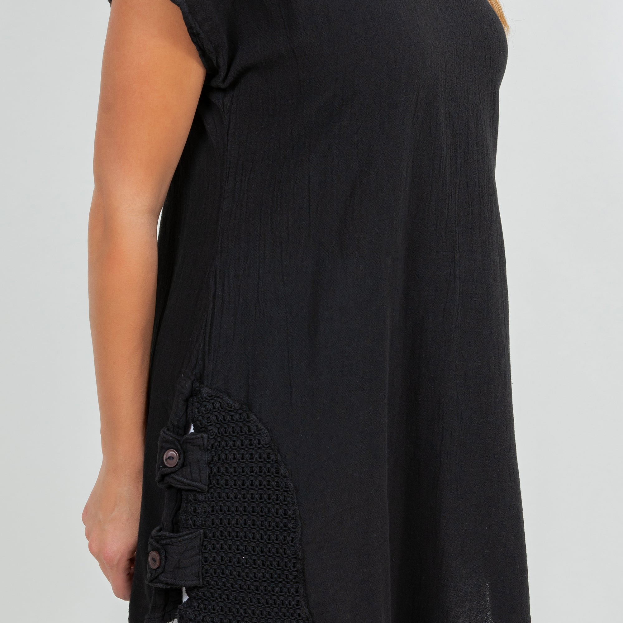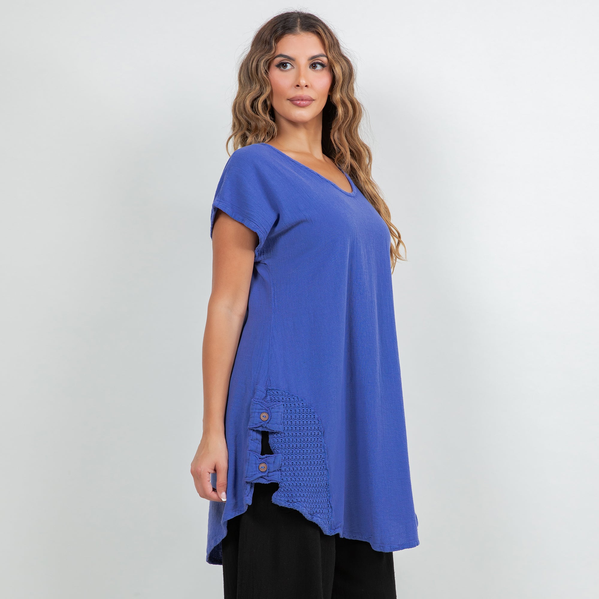 Our Robin has a v-neckline, cap sleeves, lace detail on the sides, button detail on the right side, and a longer cut. Just gorgeous!