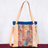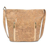 A structured cork handbag featuring silver detail, a cork strap, a zipper closure