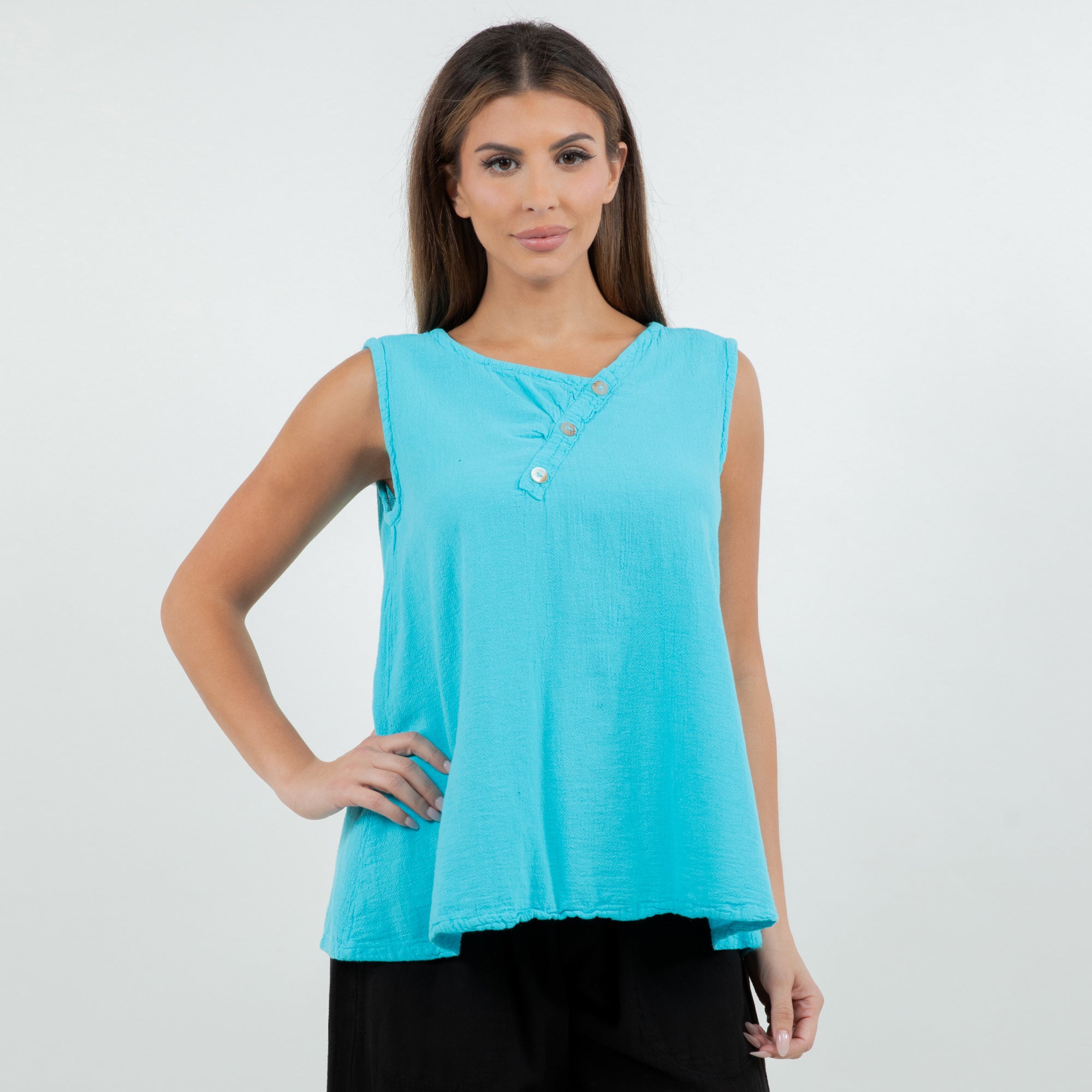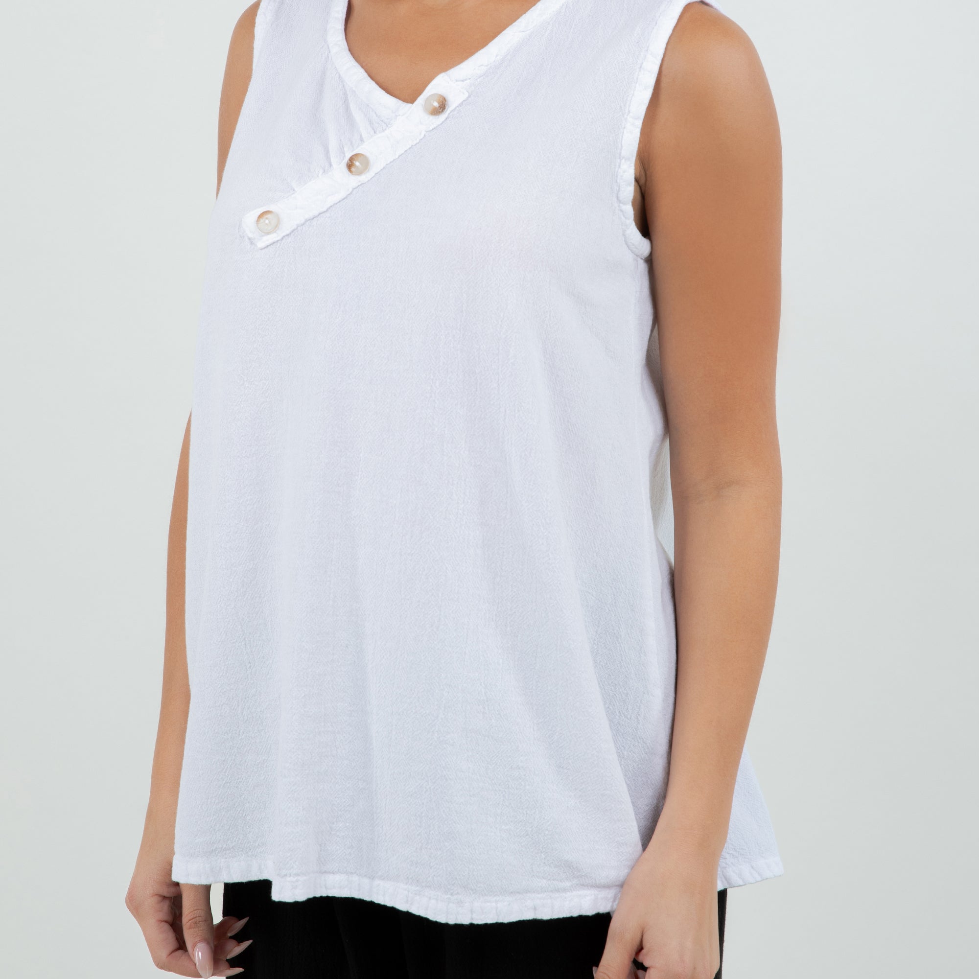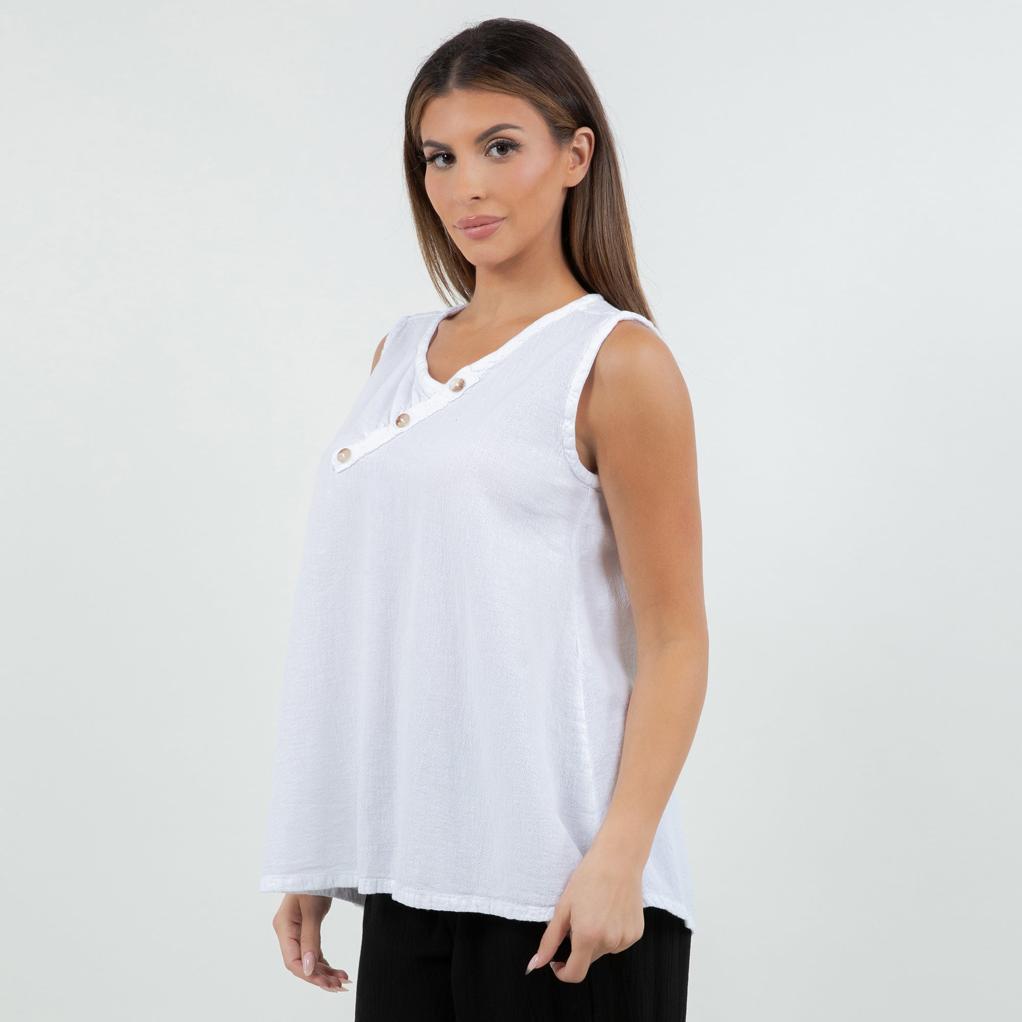 A gorgeous tank top with buttons detail on neckline. It has a nice fit, a simple and sophisticated look that will pair well with everything.