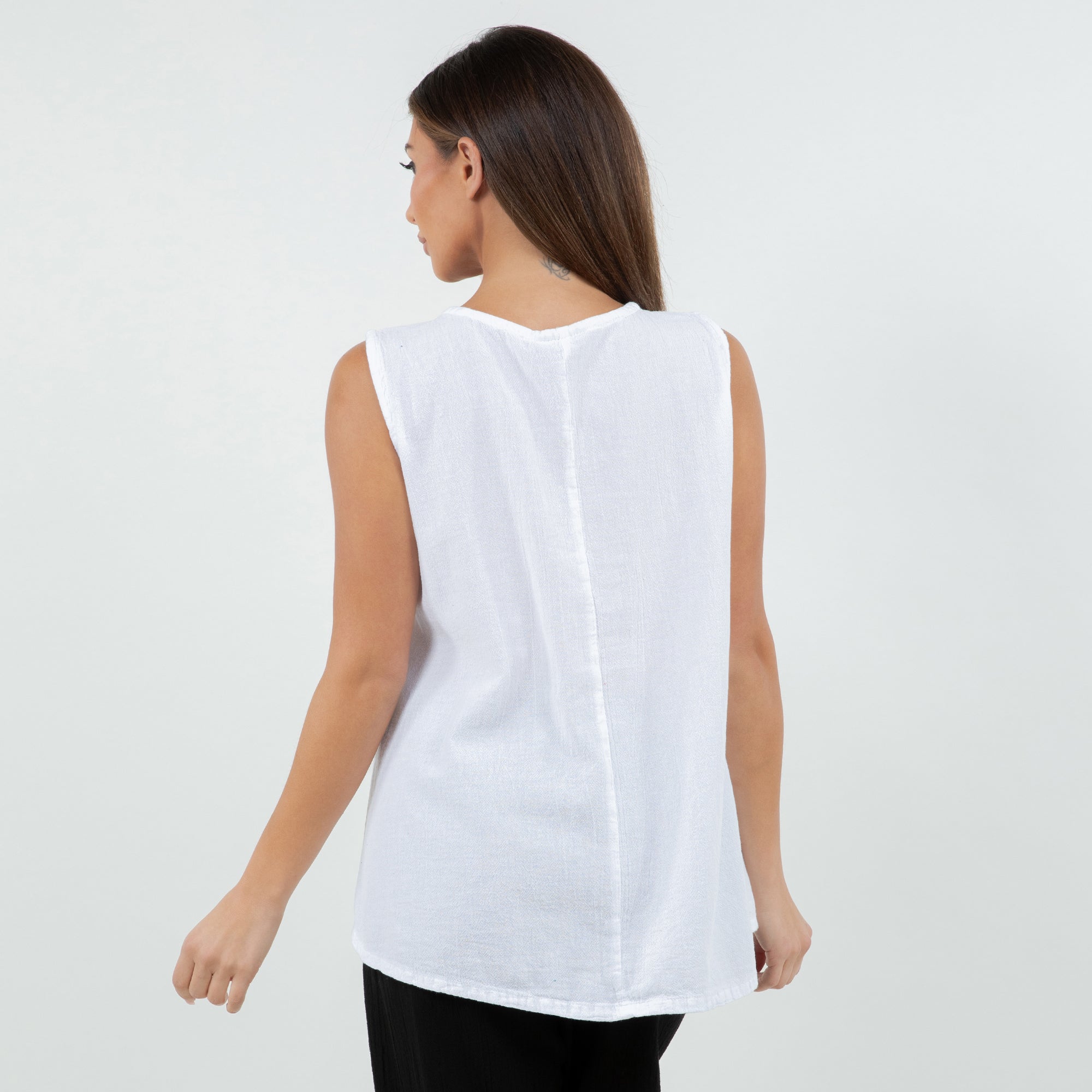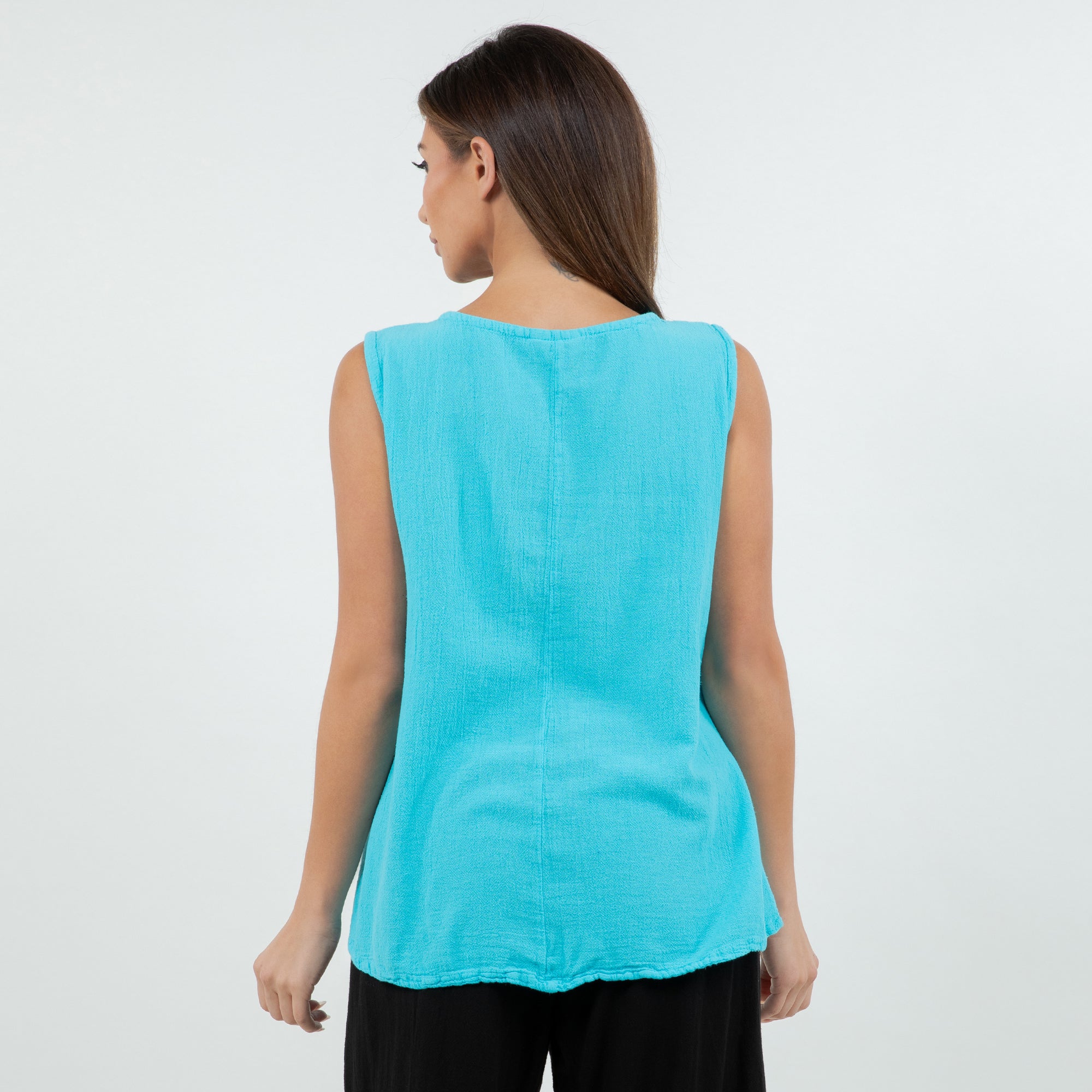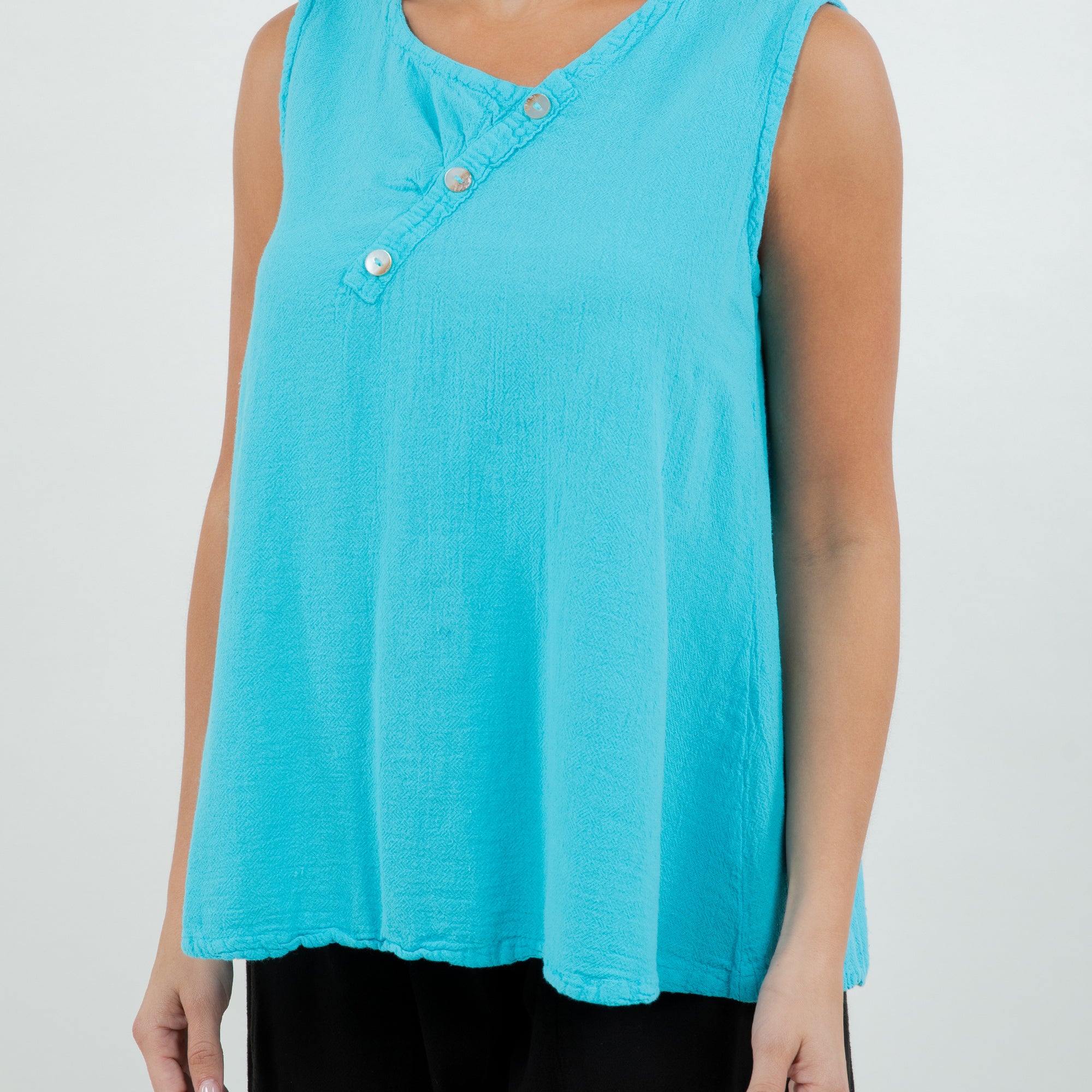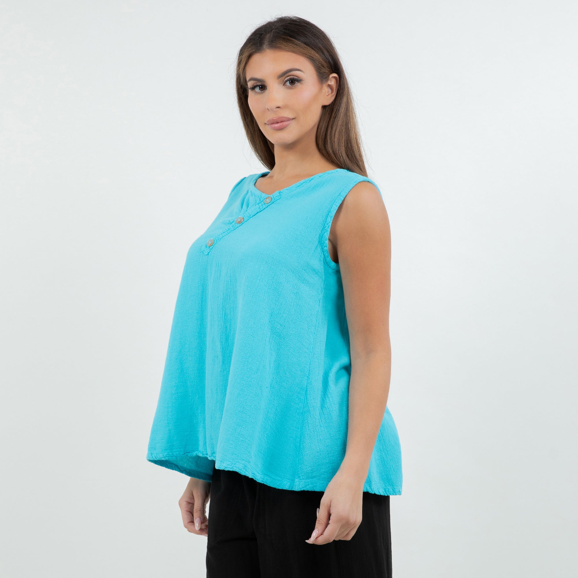 A gorgeous tank top with buttons detail on neckline. It has a nice fit, a simple and sophisticated look that will pair well with everything.