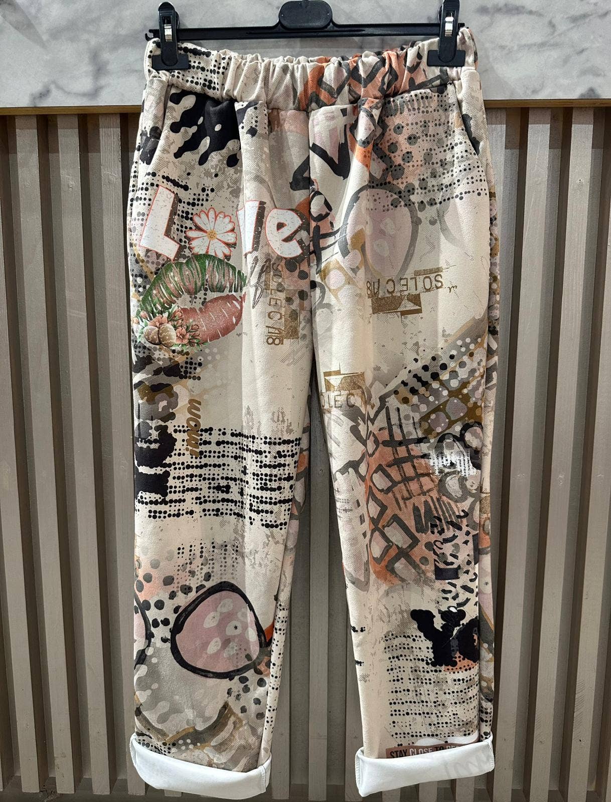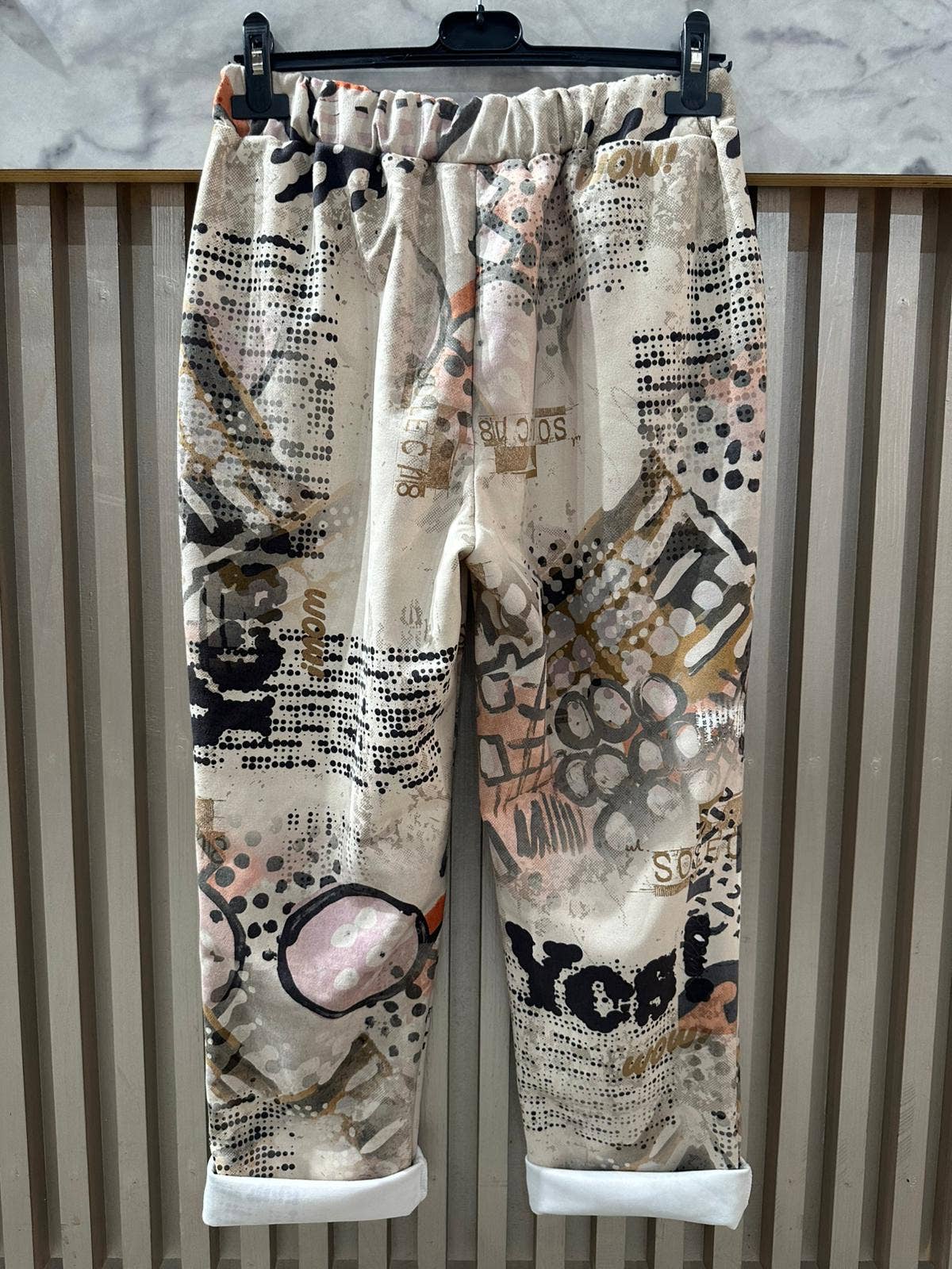 Step into bold everyday style with these beige Urban Abstract Sweatpants, designed with an expressive all-over printed motif blending graffiti strokes, dotted textures, and contemporary art elements in warm neutral tones. The soft cotton-blend fabric ensures comfort, while the elastic waistband and relaxed straight-leg fit offer effortless wear throughout the day. Finished with rolled cuffs for a modern touch, these sweatpants bring a unique statement to casual outfits with zero effort. Perfect for customers seeking comfort, originality, and standout street-inspired design. One Size fits S TO L Made in Italy