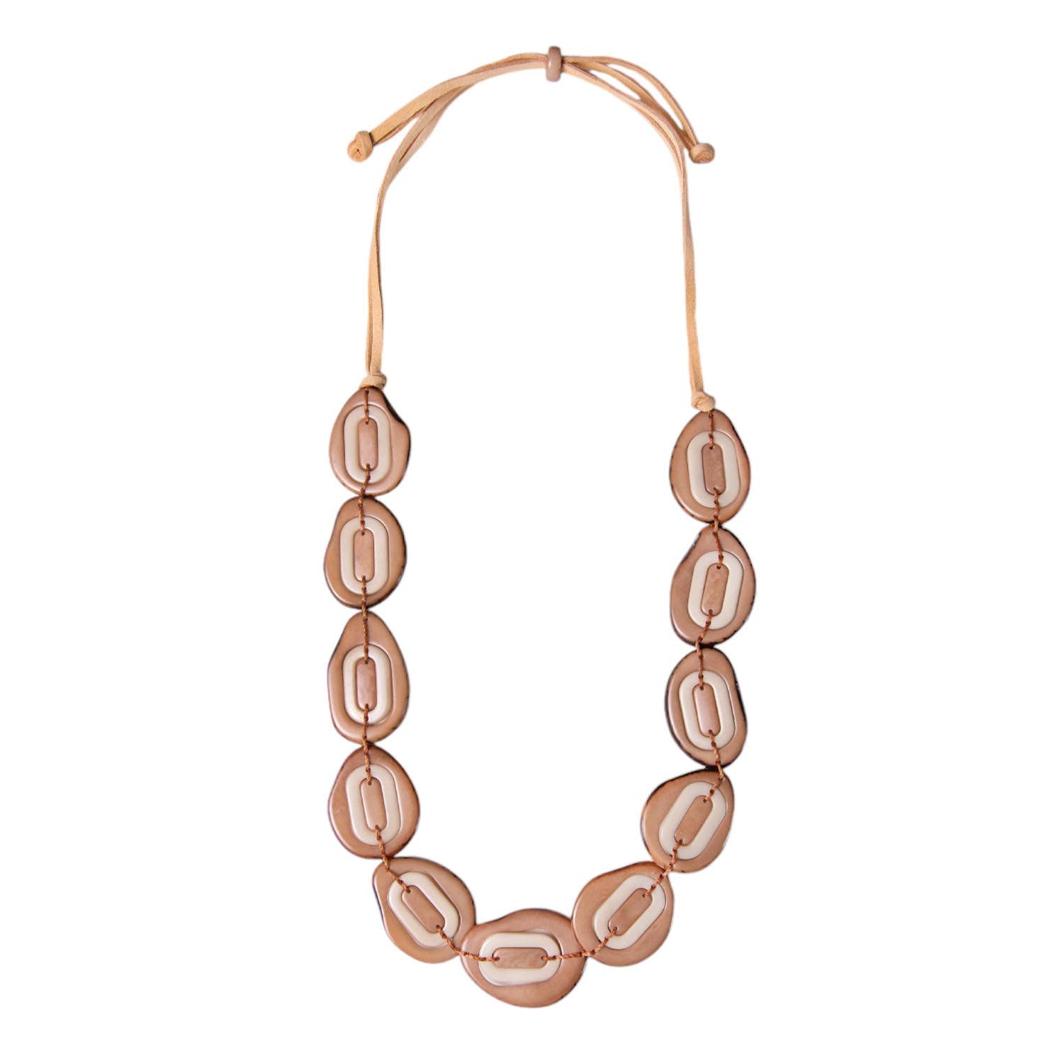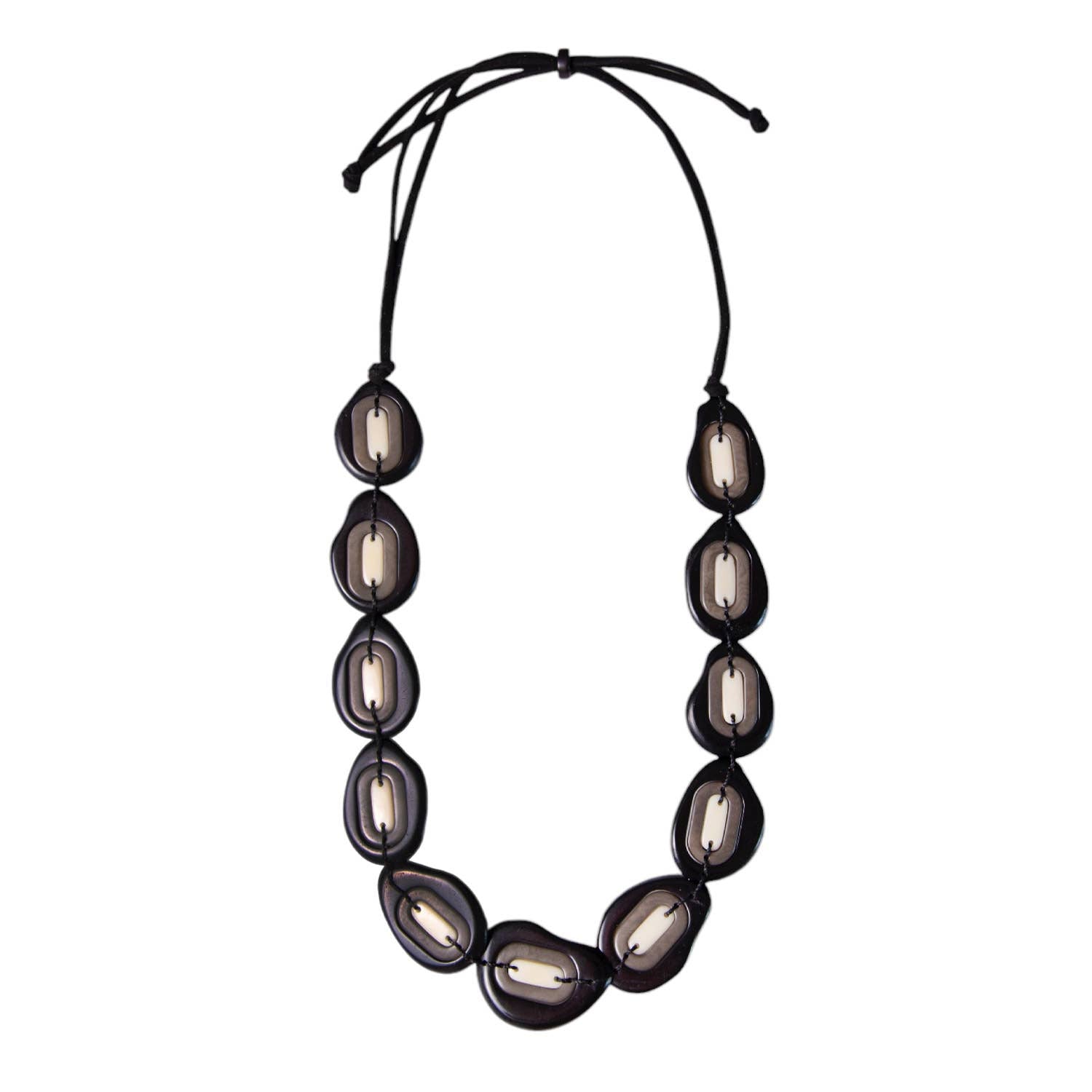 Trendy and remarkable adjustable necklace featuring intricately hand-carved tagua pieces.